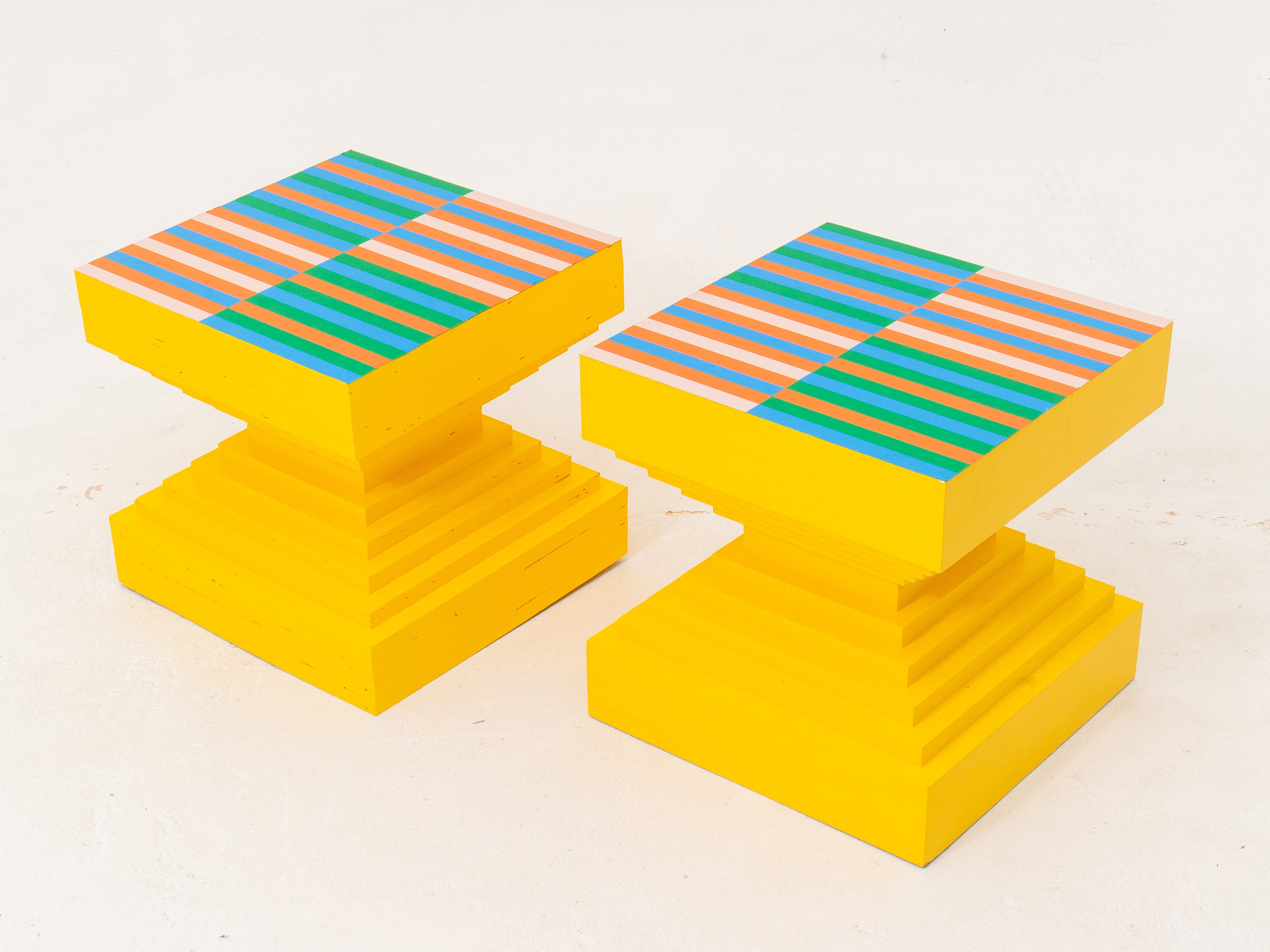 “The set design for the show was inspired by the layered richness of the woven fabrics presented in Labrum’s new collection. In this installation you will see 15 stools that have been sandwiched together to mimic the construction of the cotton. The stools combine with immersive motion graphics that will take you on a joyous journey while you watch the presentation.” – Yinka Ilori.