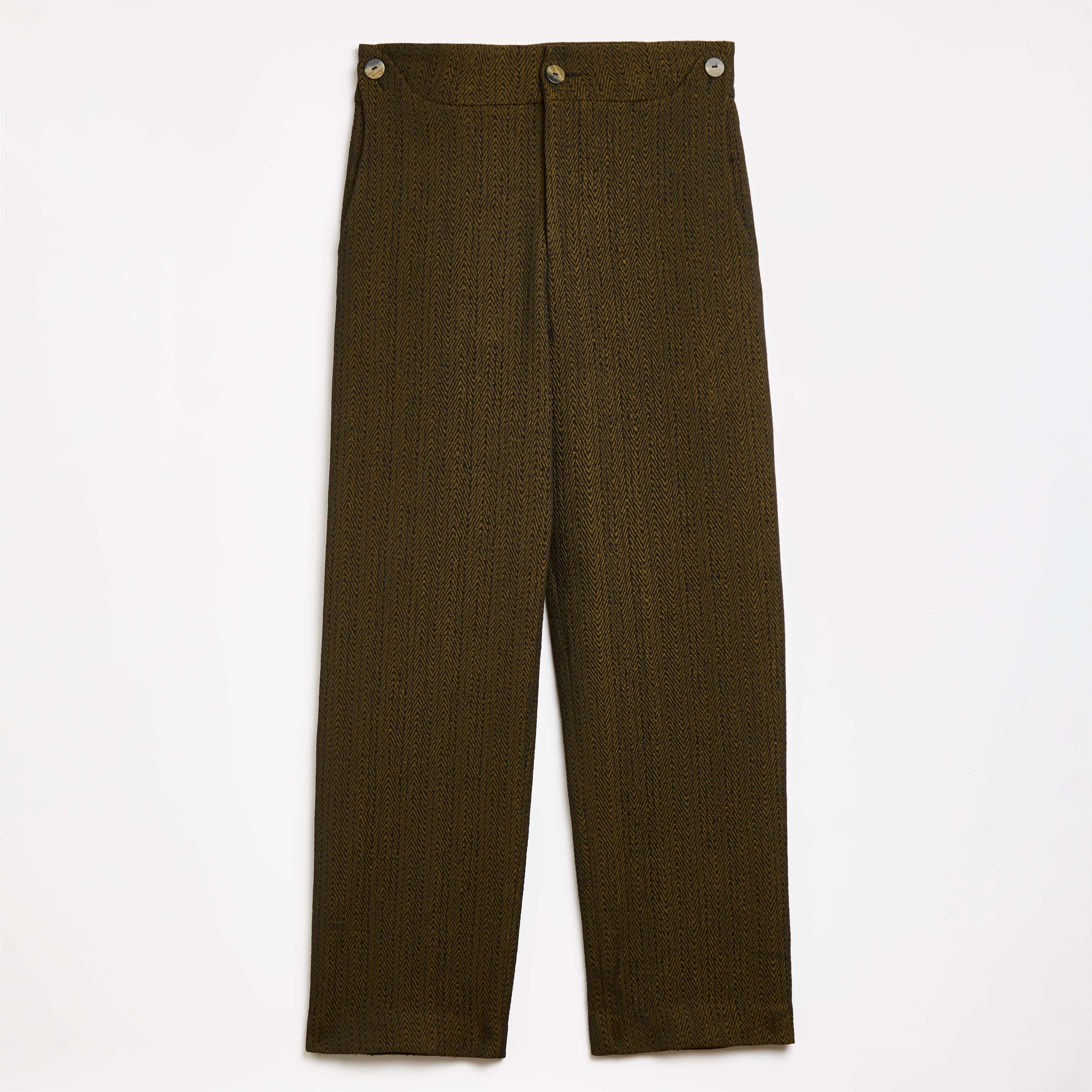 Wide-leg zig zag jacquard Black Prince trousers in bronze. Made of stretch and cloqué jacquard chevron fabric. Mid-rise. Decorative button fastening at front sides. Button closure. Zip fly. Strap adjustors at back sides. Four-pocket styling.