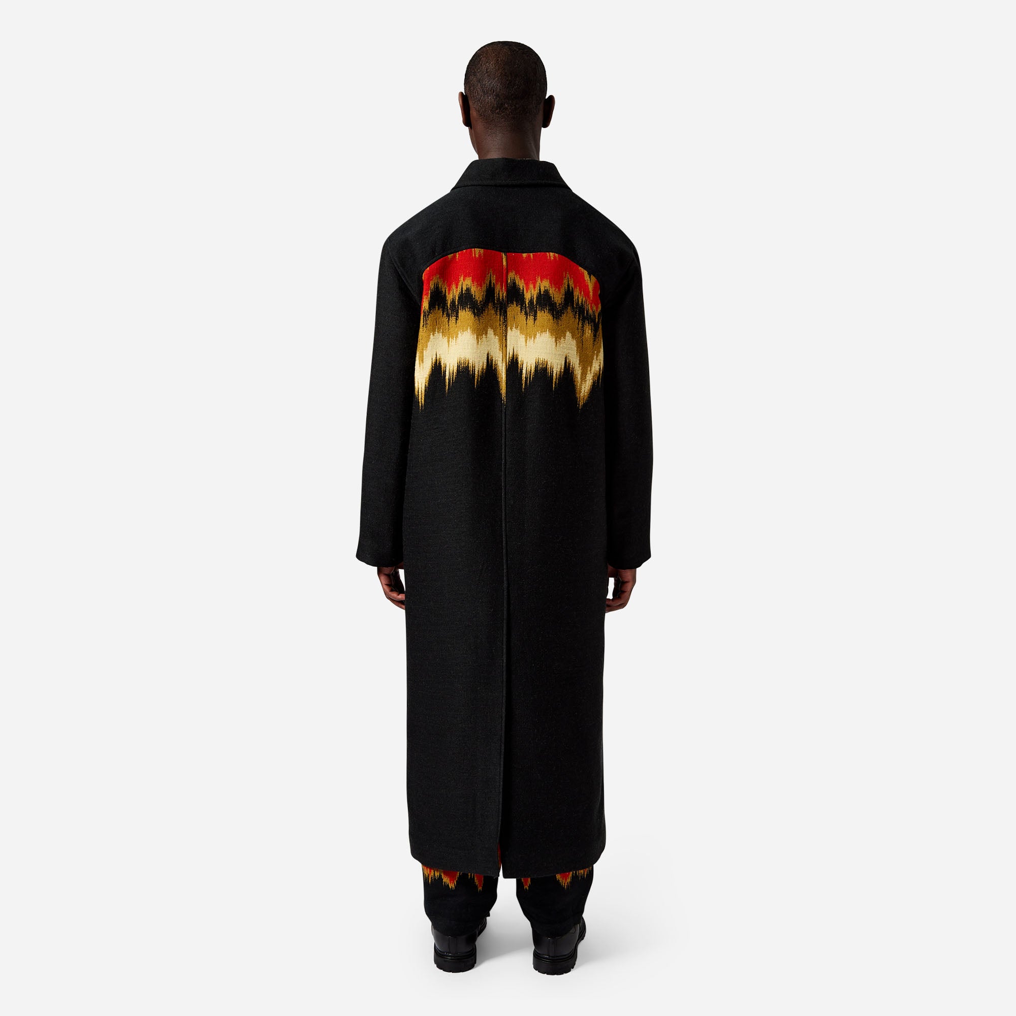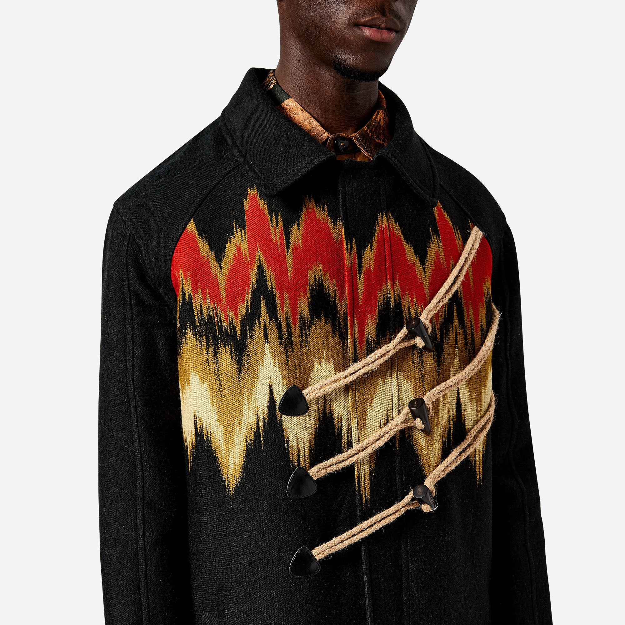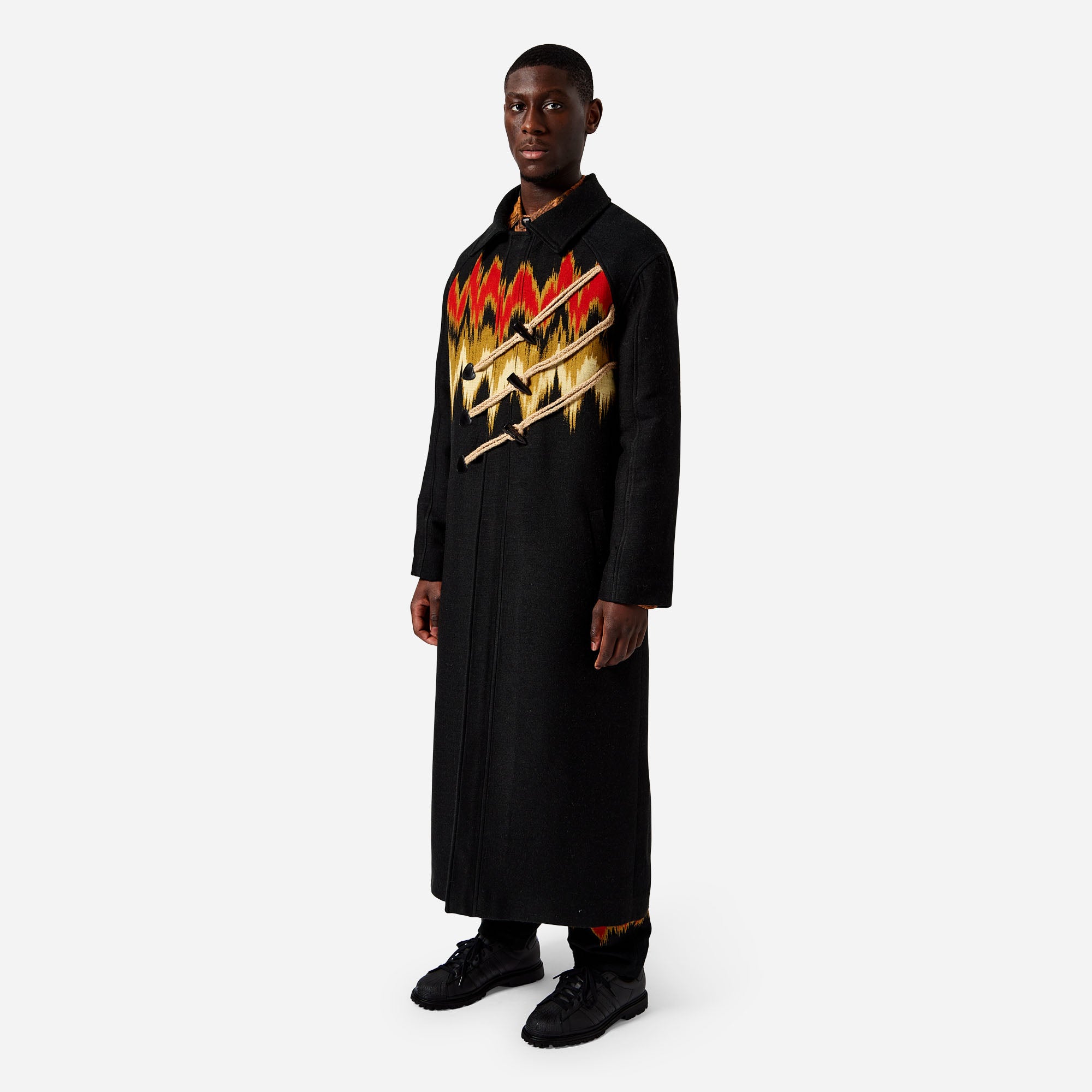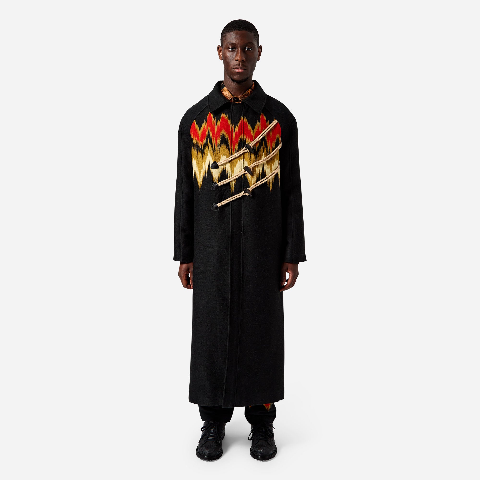 Woven duffel coat in black. Featuring a blur zig zag in multicolour. Concealed zip fastening at front. Spread collar. Welt pockets. Duffle toggles fastening at front. Fully lined.