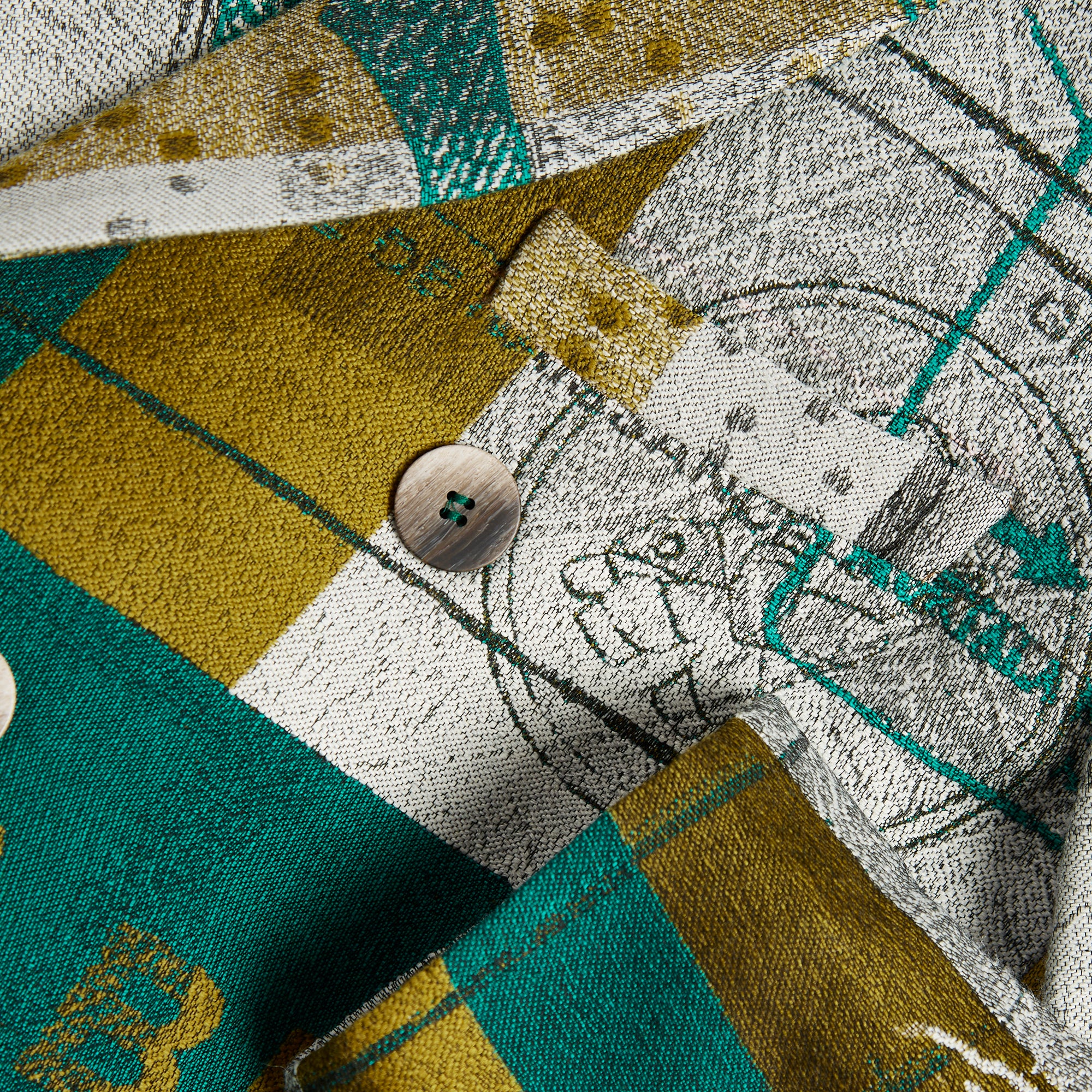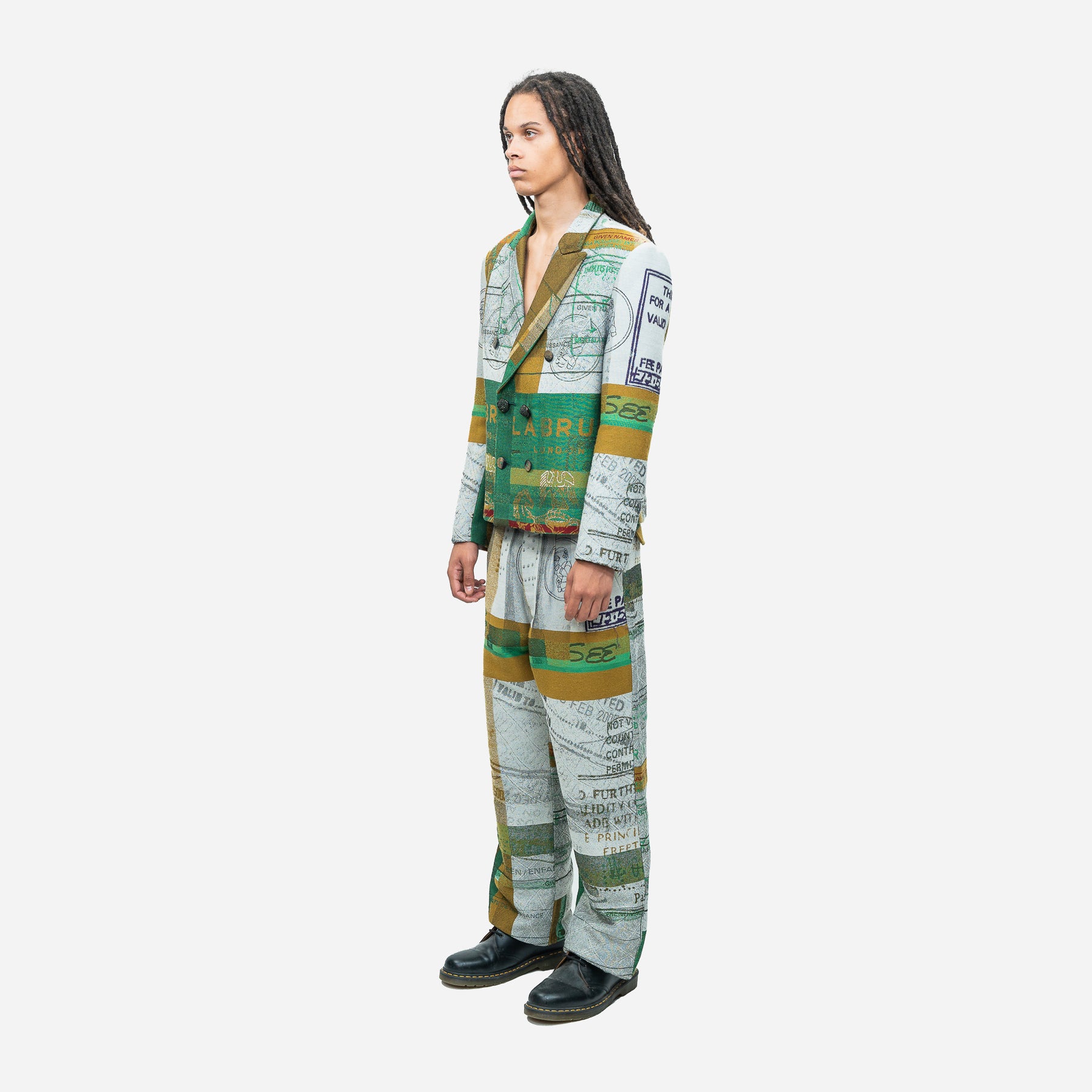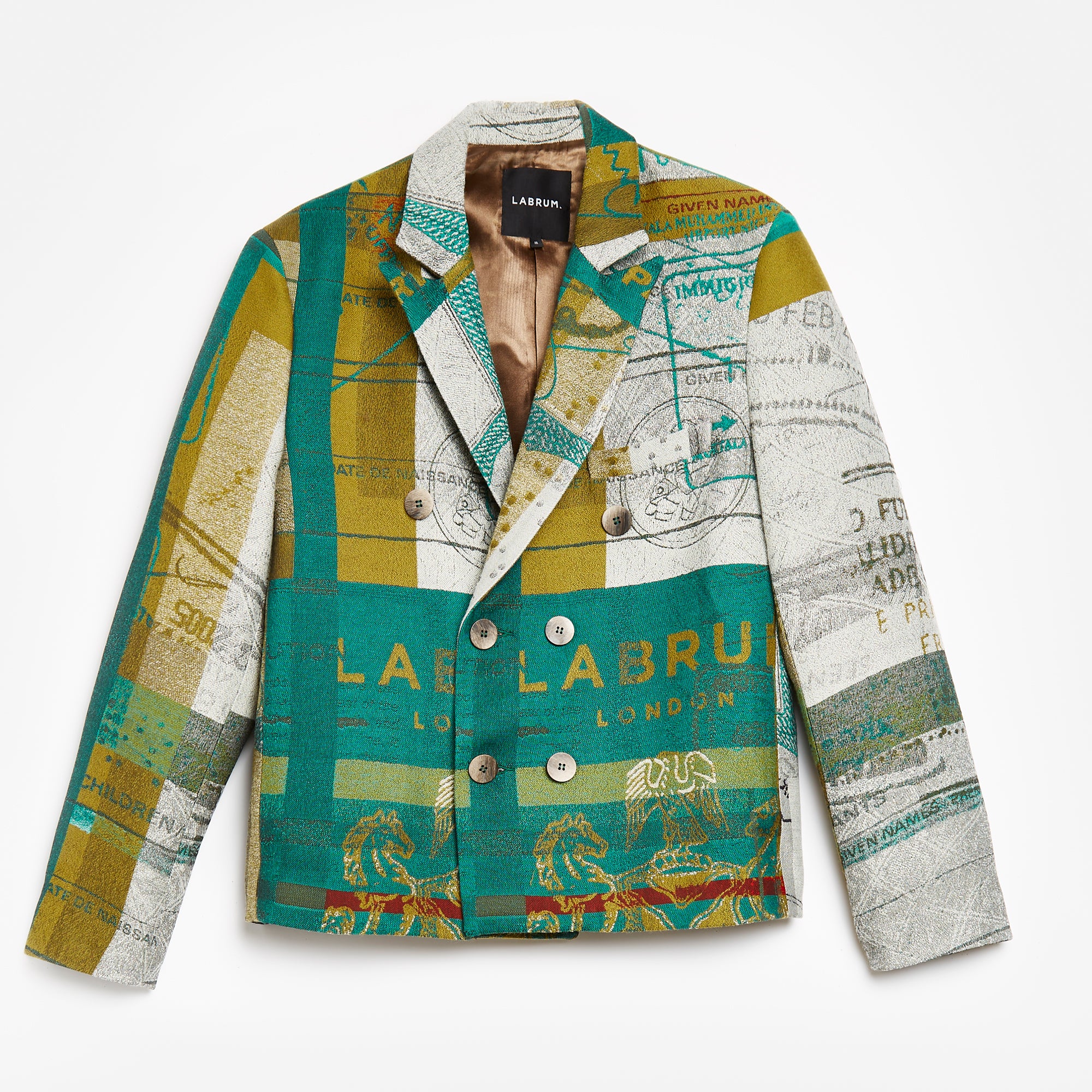 Ya-Alimamy long sleeve double breasted cropped blazer in multicolour. All over wool customised passport print jacquard developed in-house. Notch lapel collar. Button closure at front. Welt pocket at interior. Welt pockets at front. Fully lined.