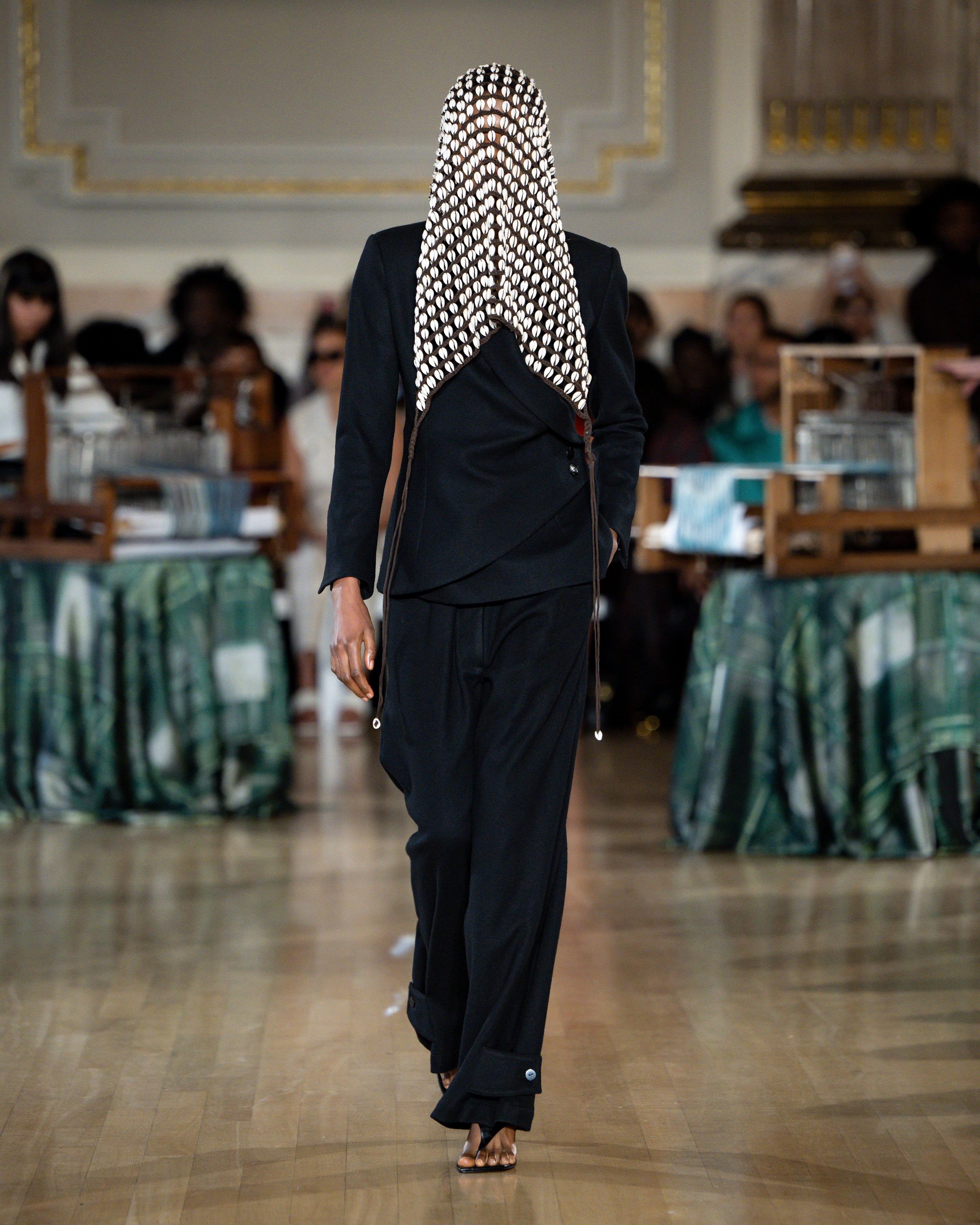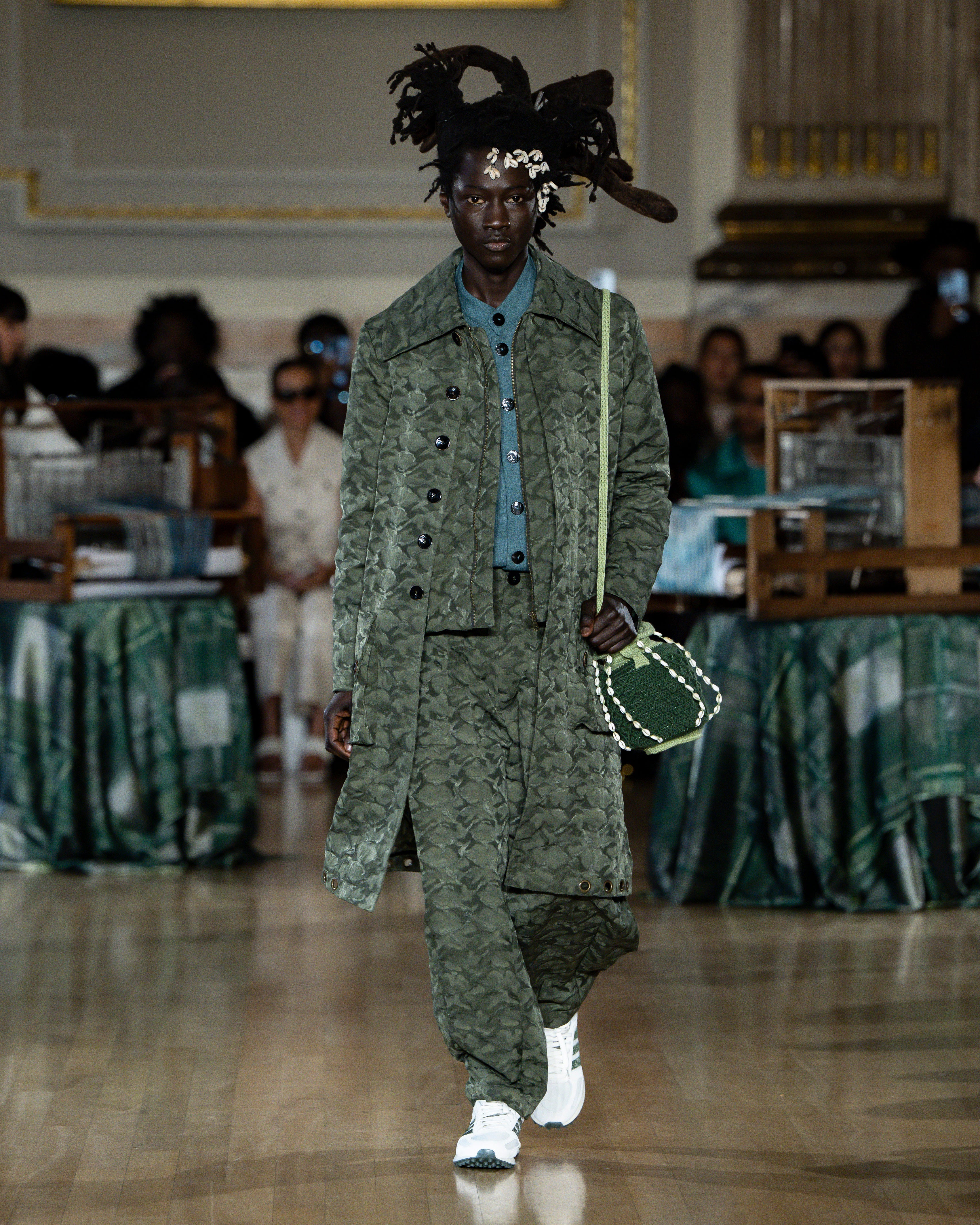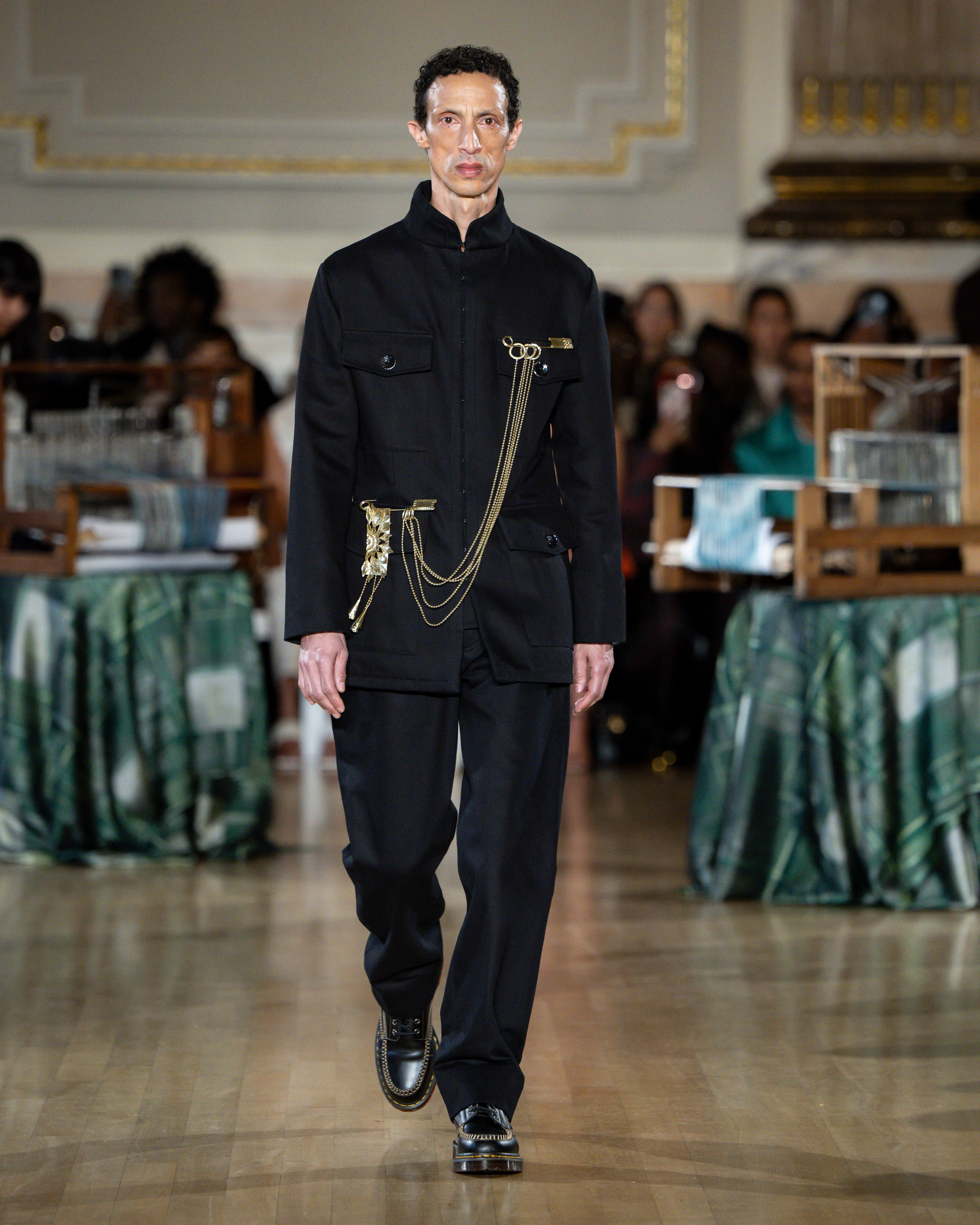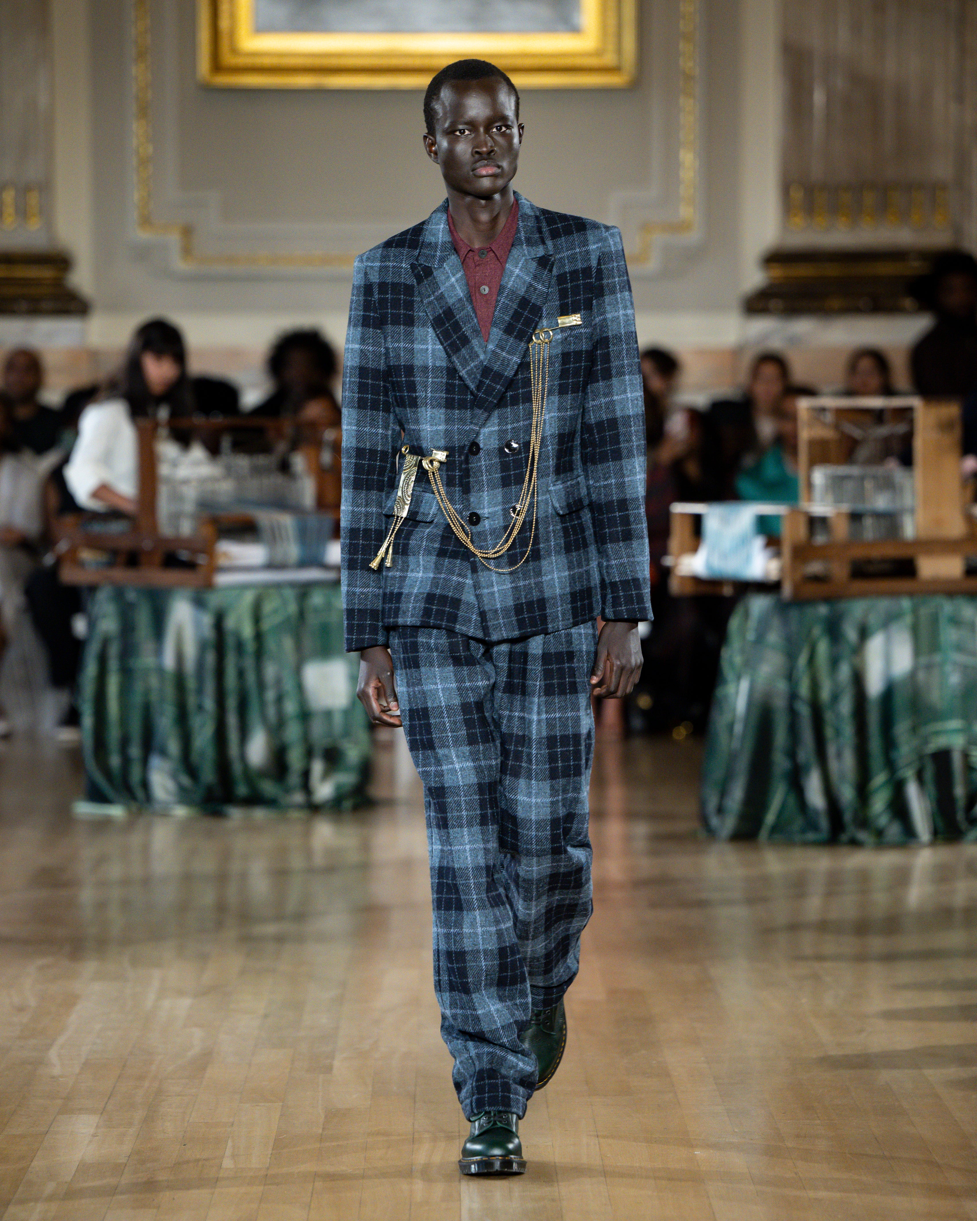 British tailoring remains the foundation; precise, structured, intentional, but it becomes a base for global craft. Tailoring reaches across menswear and womenswear equally this season. Suiting is empowerment. Structure is protection. Form is pride.