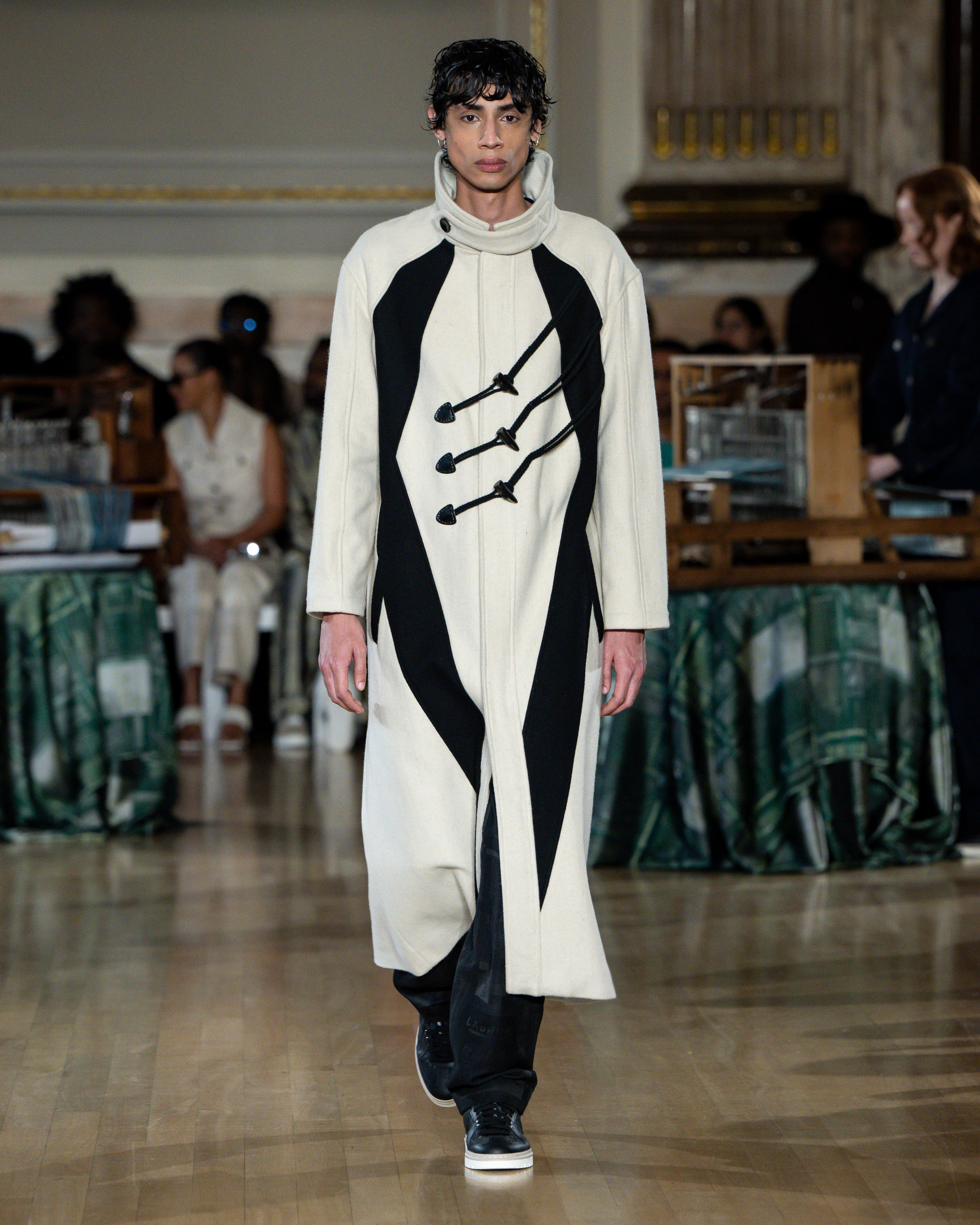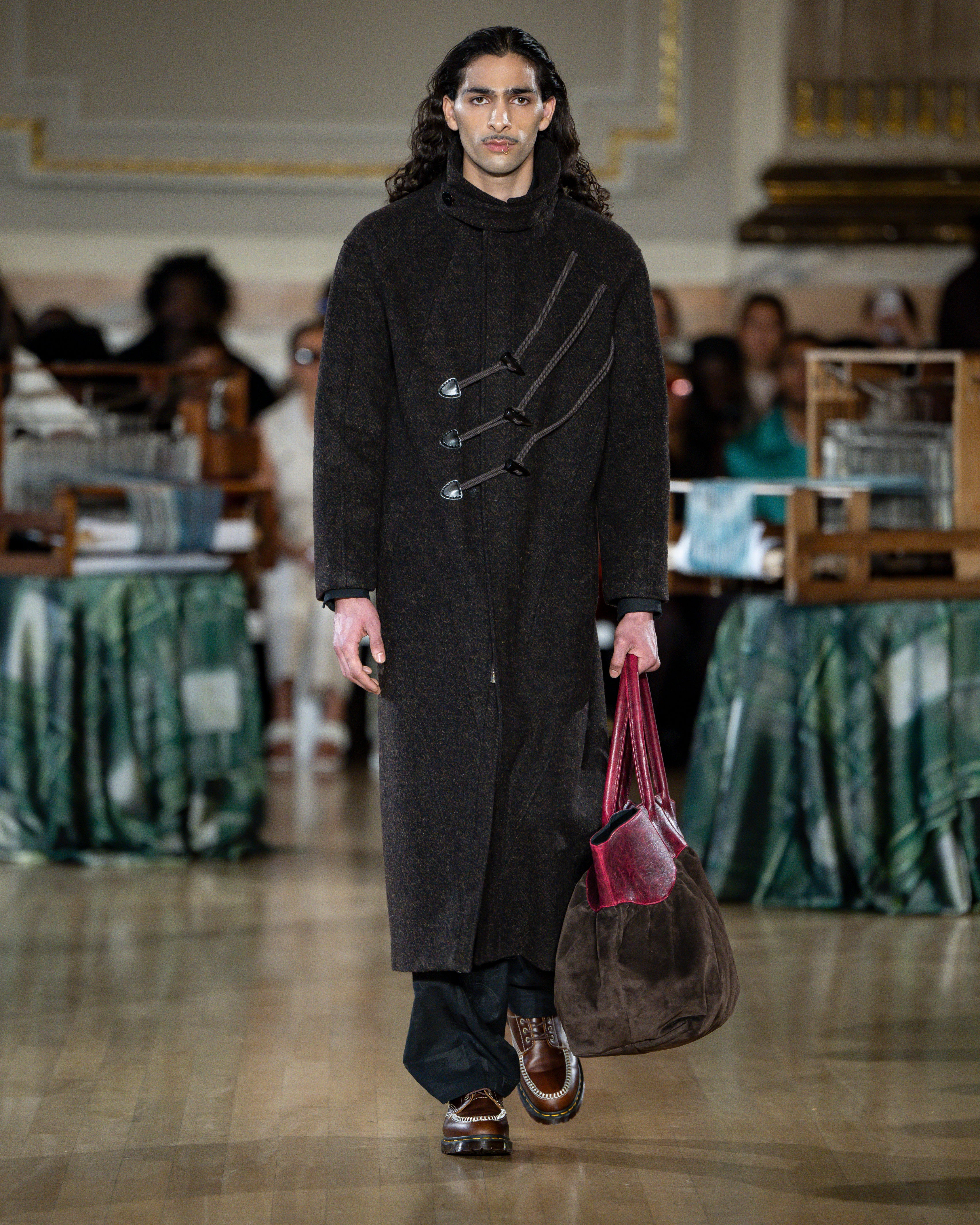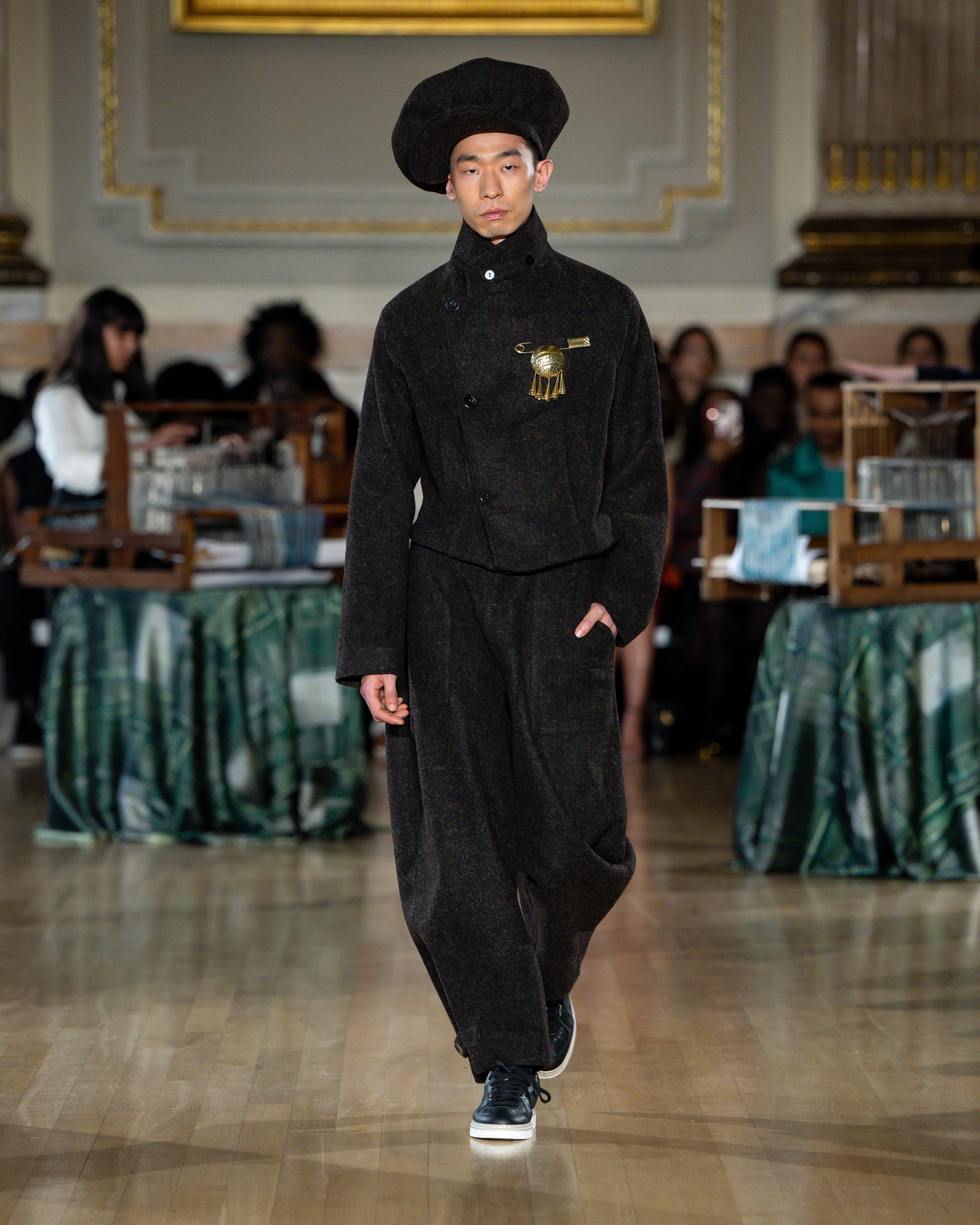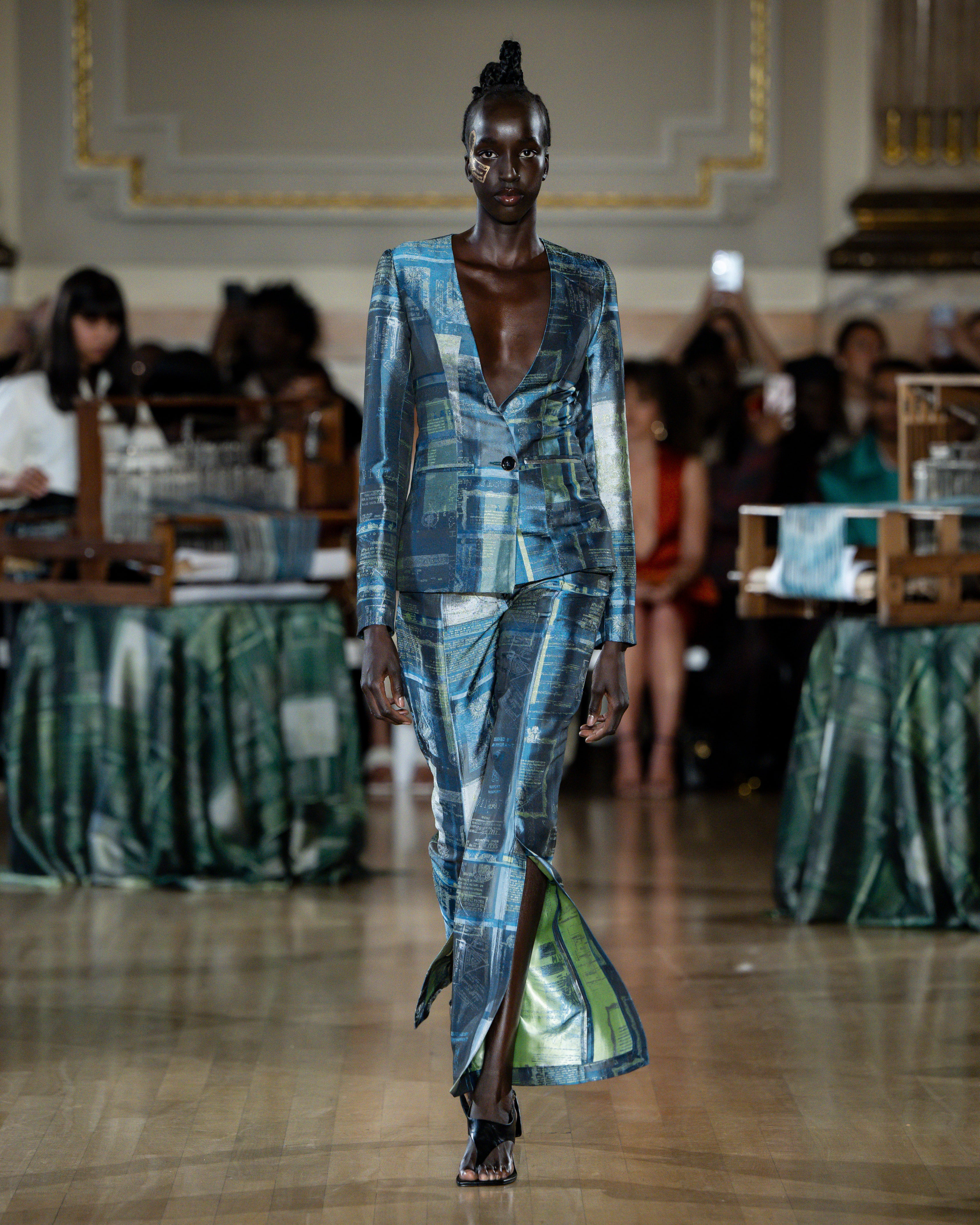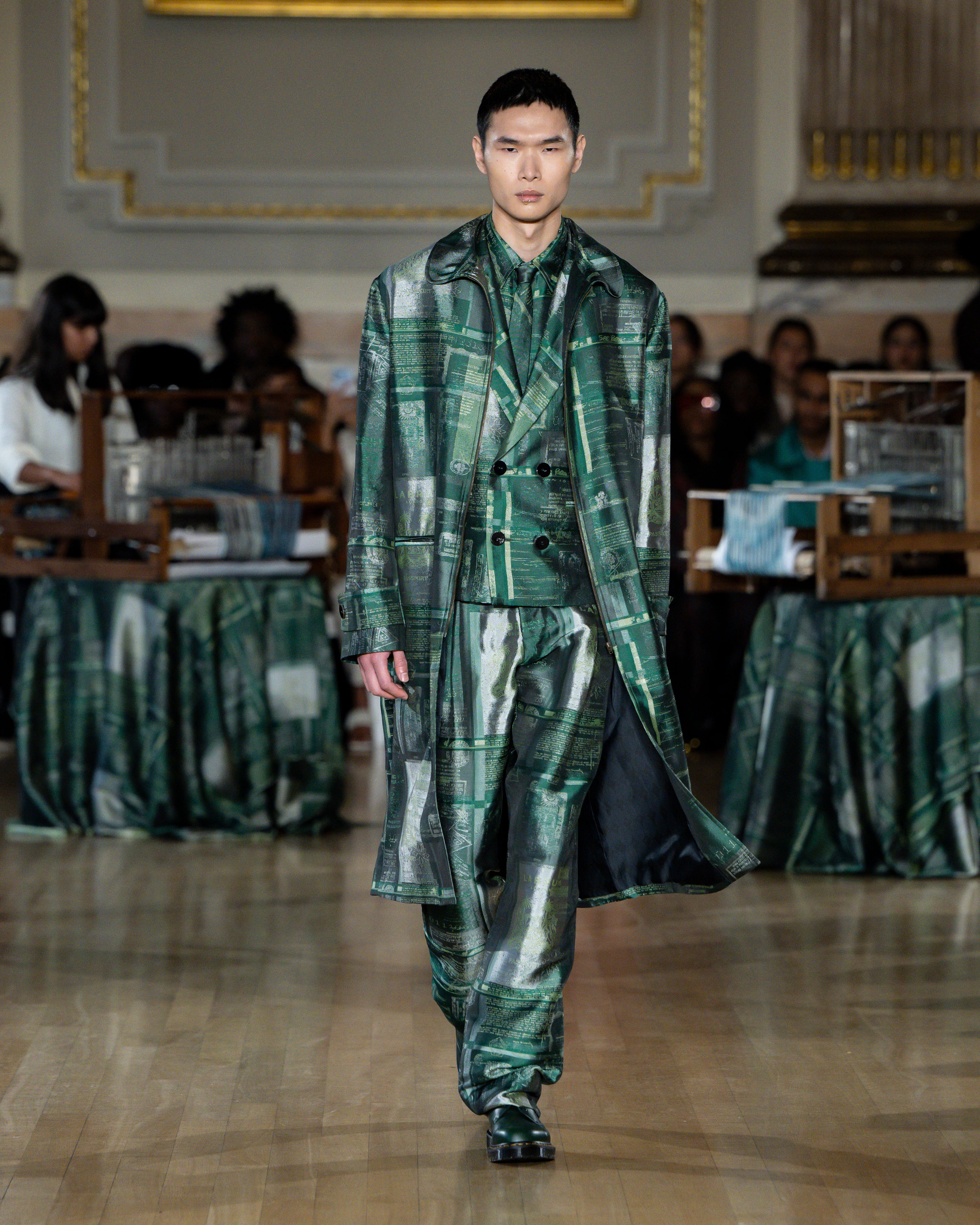 British tailoring remains the foundation; precise, structured, intentional, but it becomes a base for global craft. Tailoring reaches across menswear and womenswear equally this season. Suiting is empowerment. Structure is protection. Form is pride.