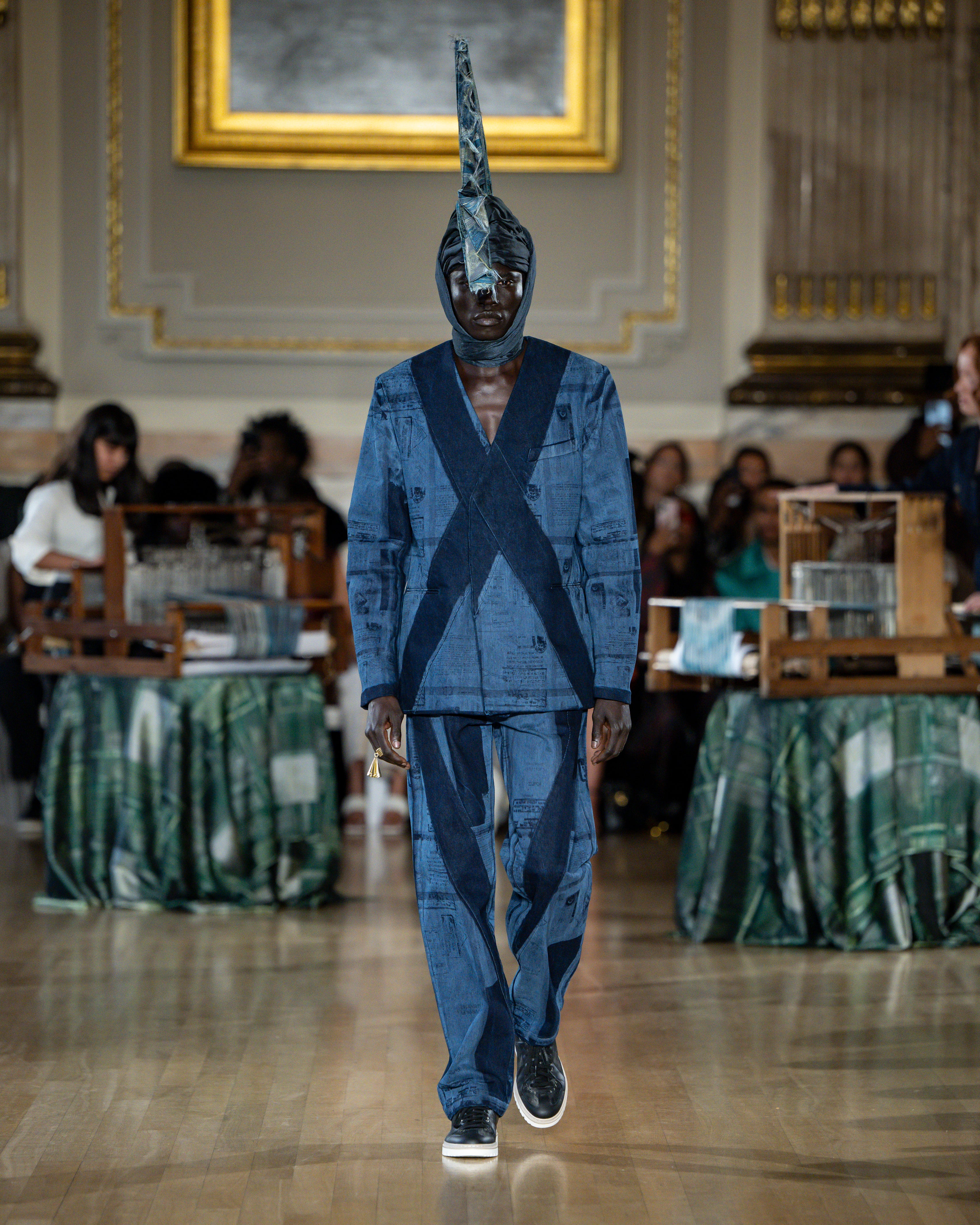 Headwear references the accordion-shaped hats of Agadez warriors, garments of finery worn at migration crossroads, where cultures gather rather than divide.