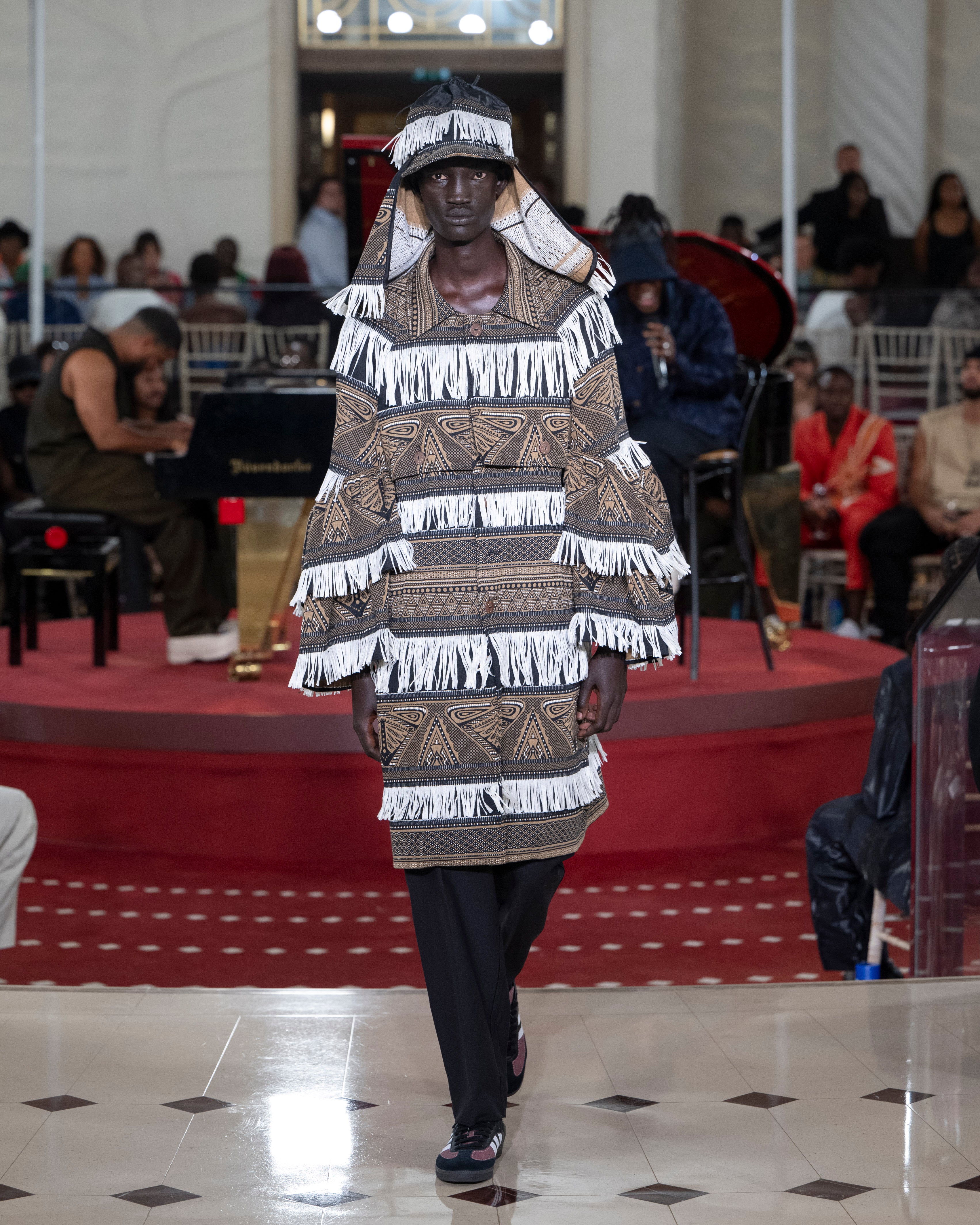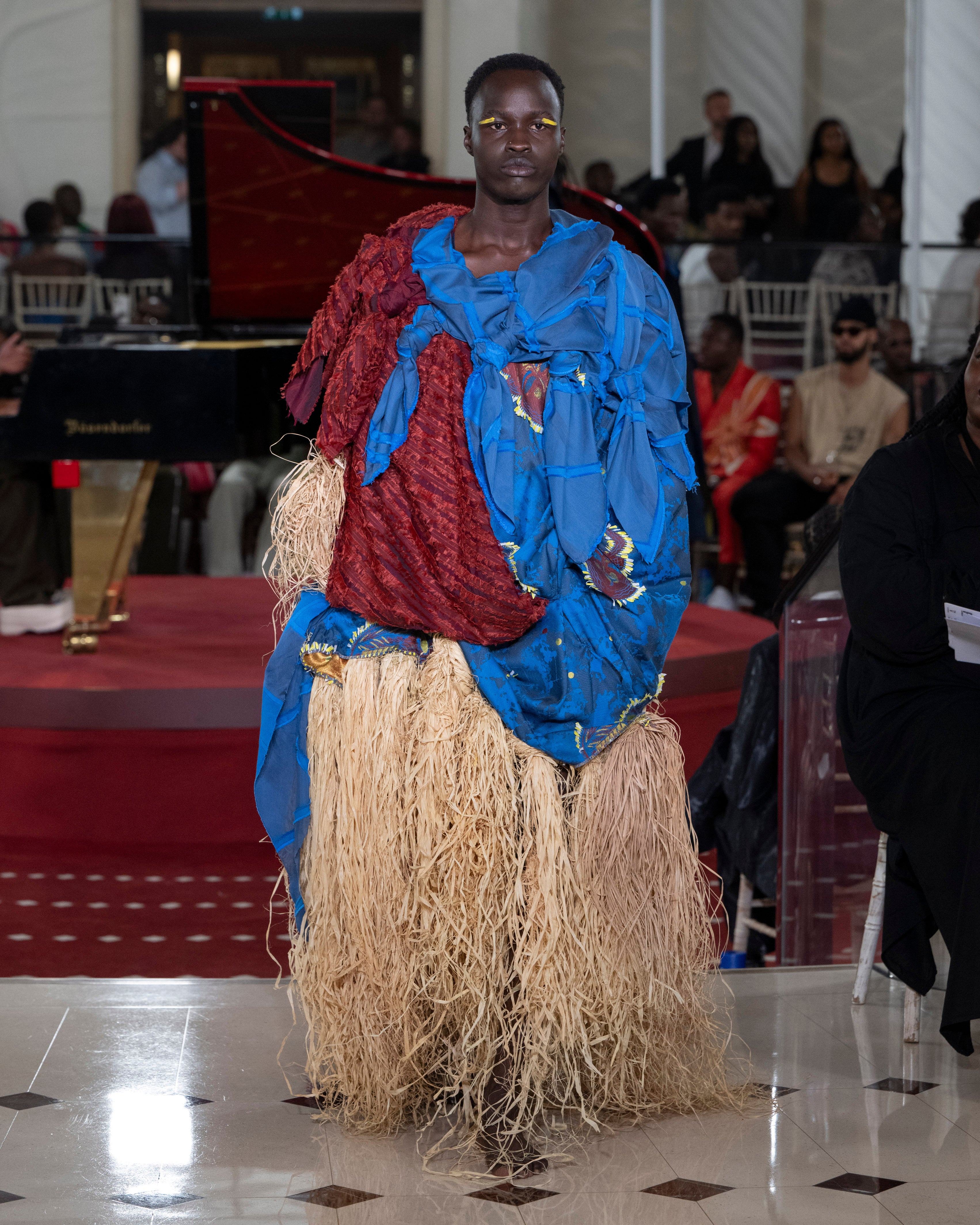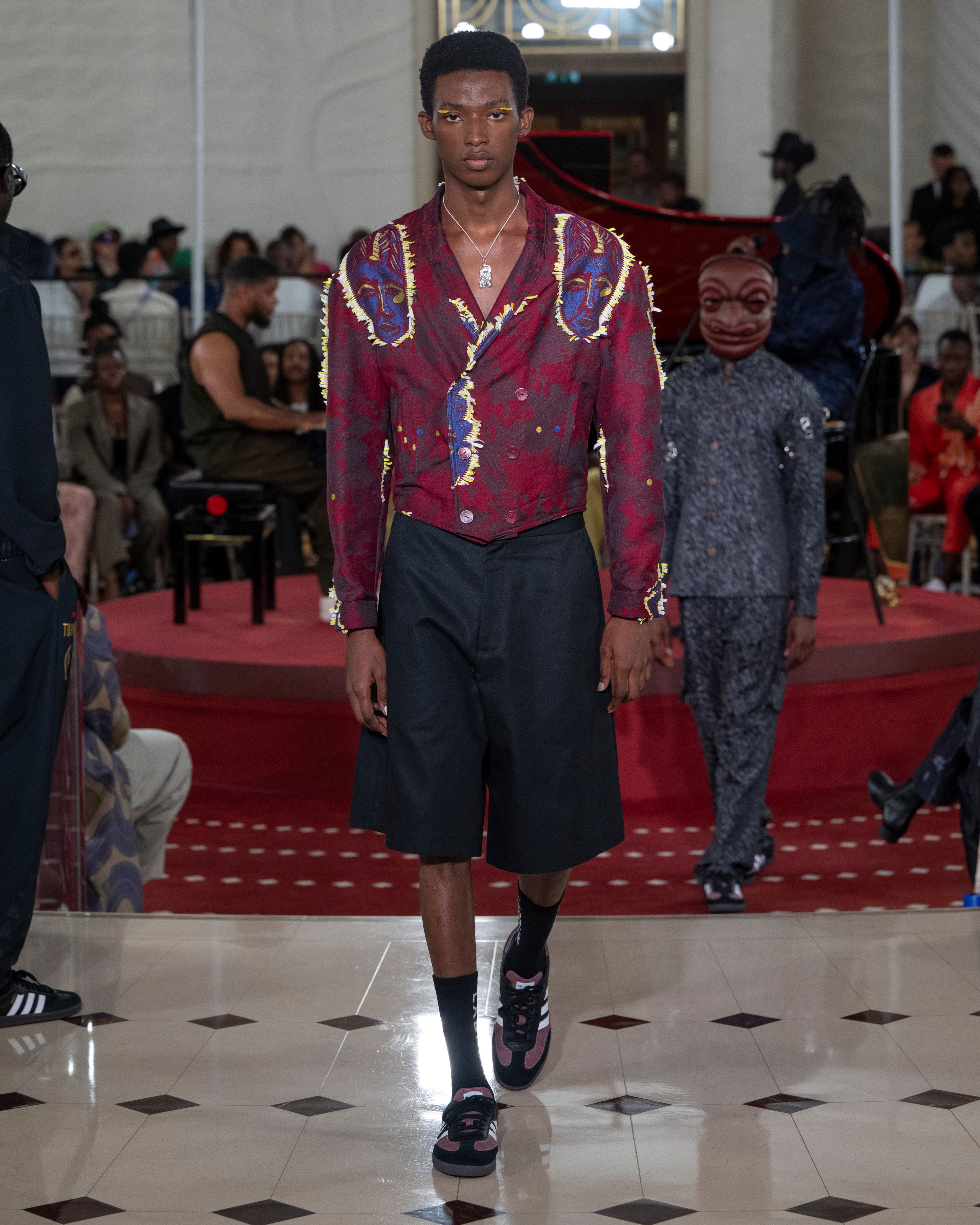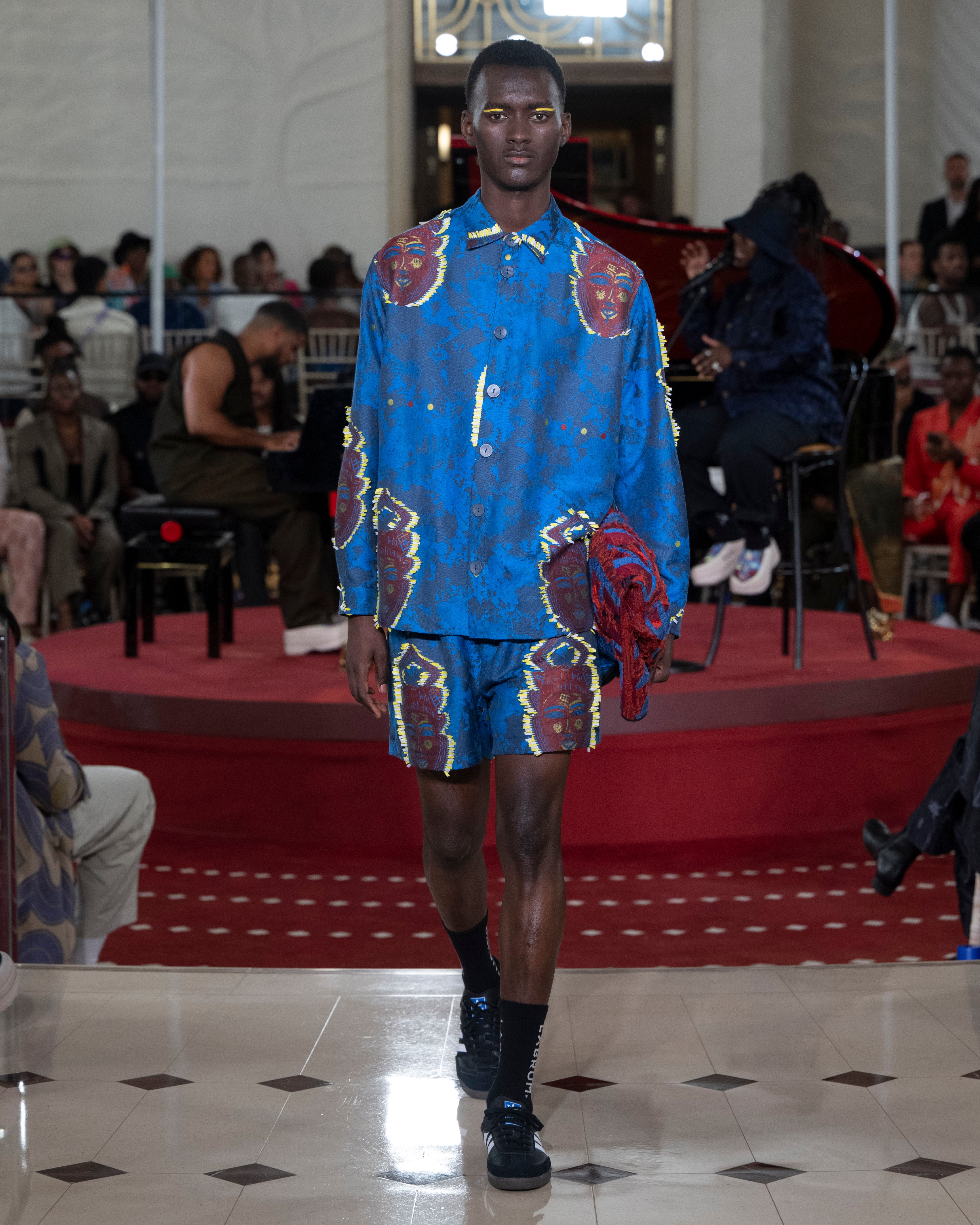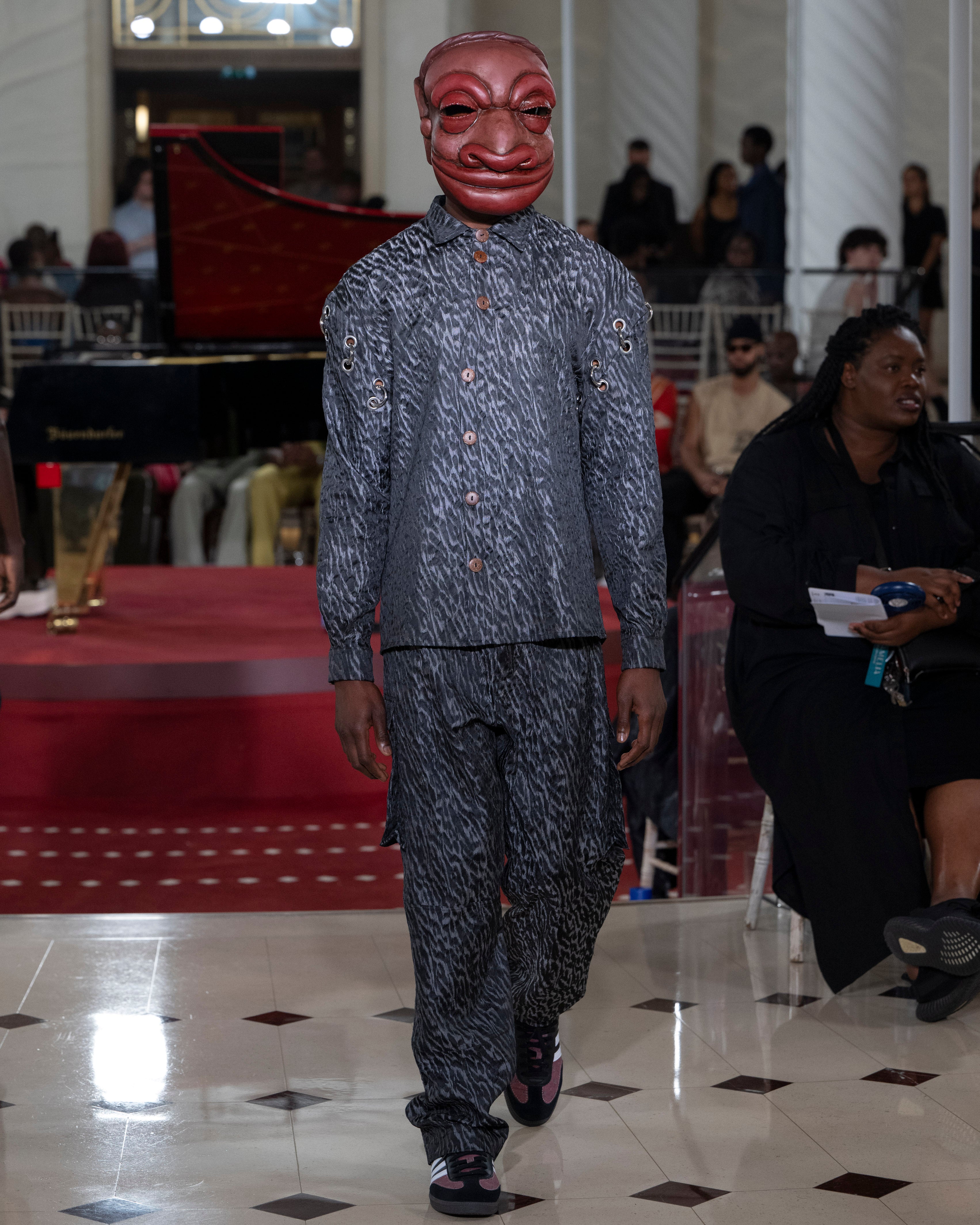 Masquerades and folktales were an initial starting point. Valuable stories were told and lessons were learned through these widely revered celebrations across West Africa. The showpieces pay direct homage to this with masks appearing throughout in printed textiles. Raffia and similar frayed fabrics nod to the materials used in the traditional masquerade attire. Blazers feature mask prints, symbolising the courageous faces of individuals who have found a new home, solace and inspiration here in London — a modern hub of culture and vibrant stories.
