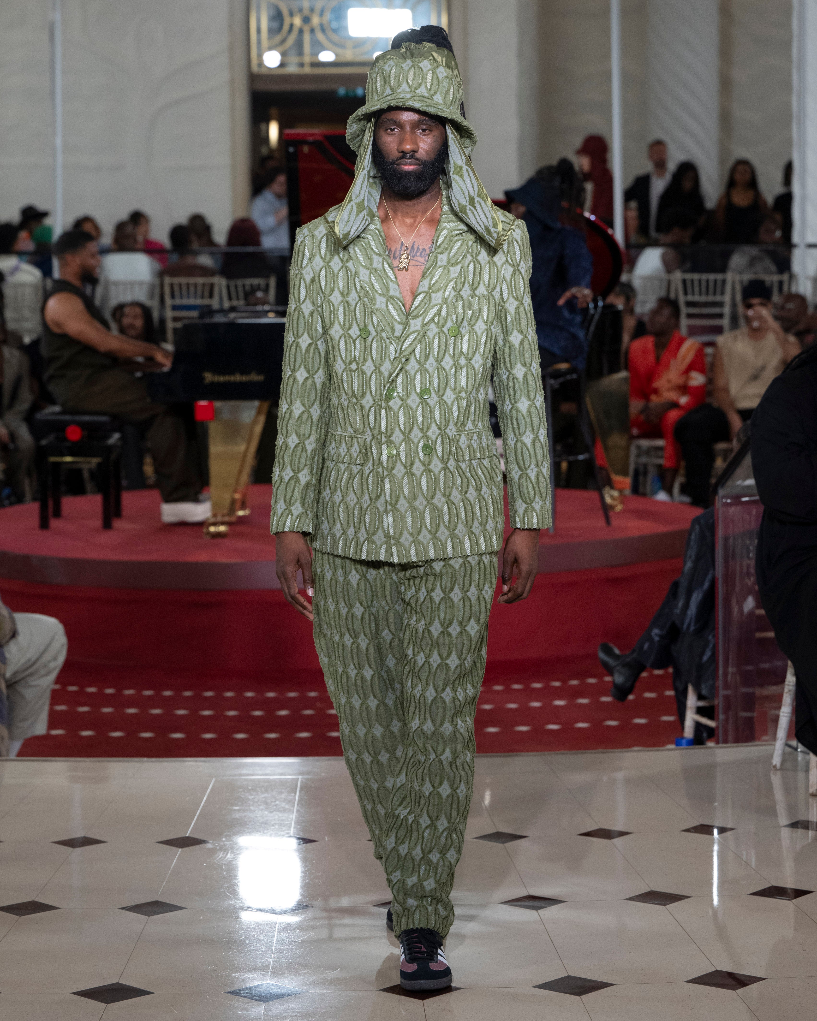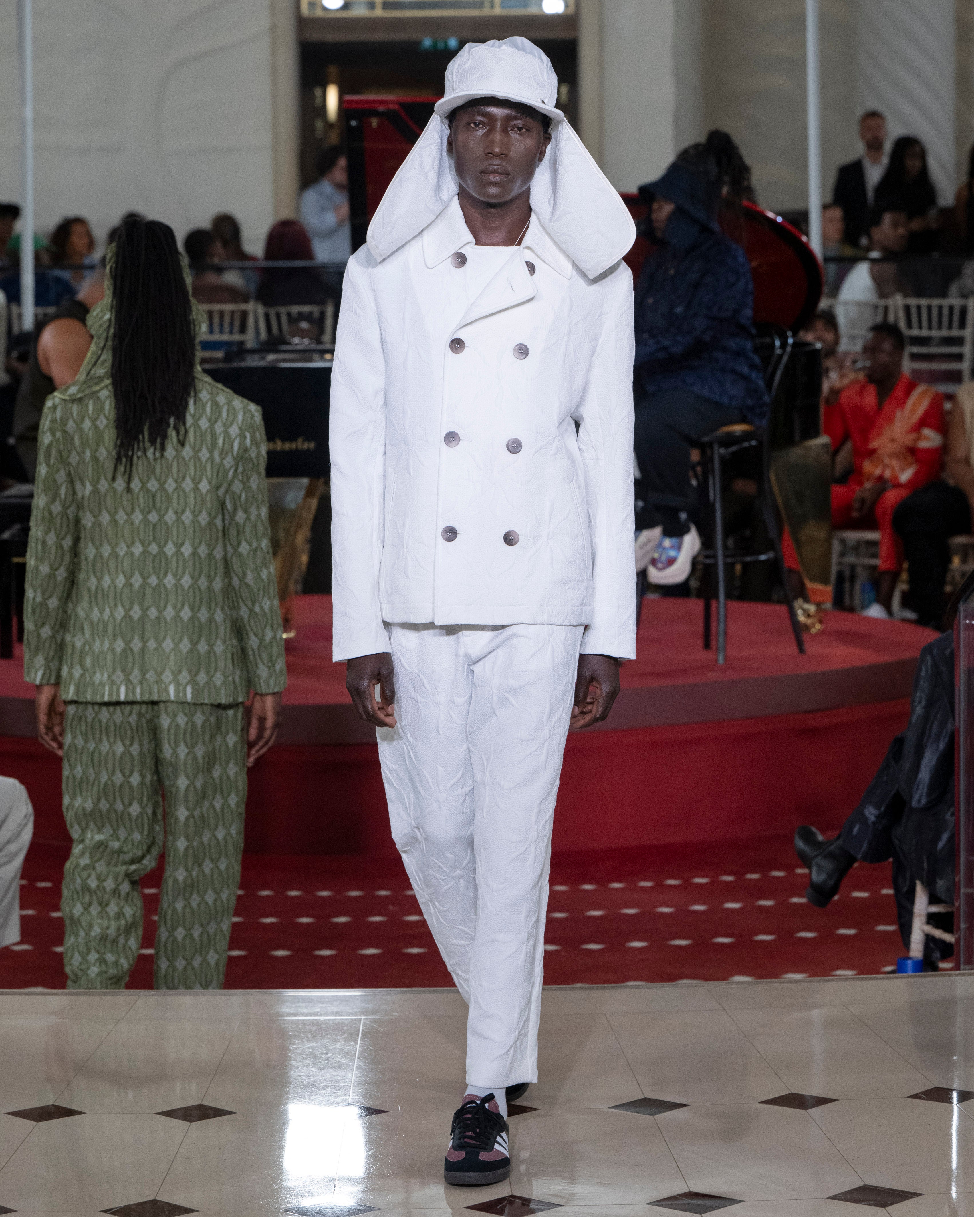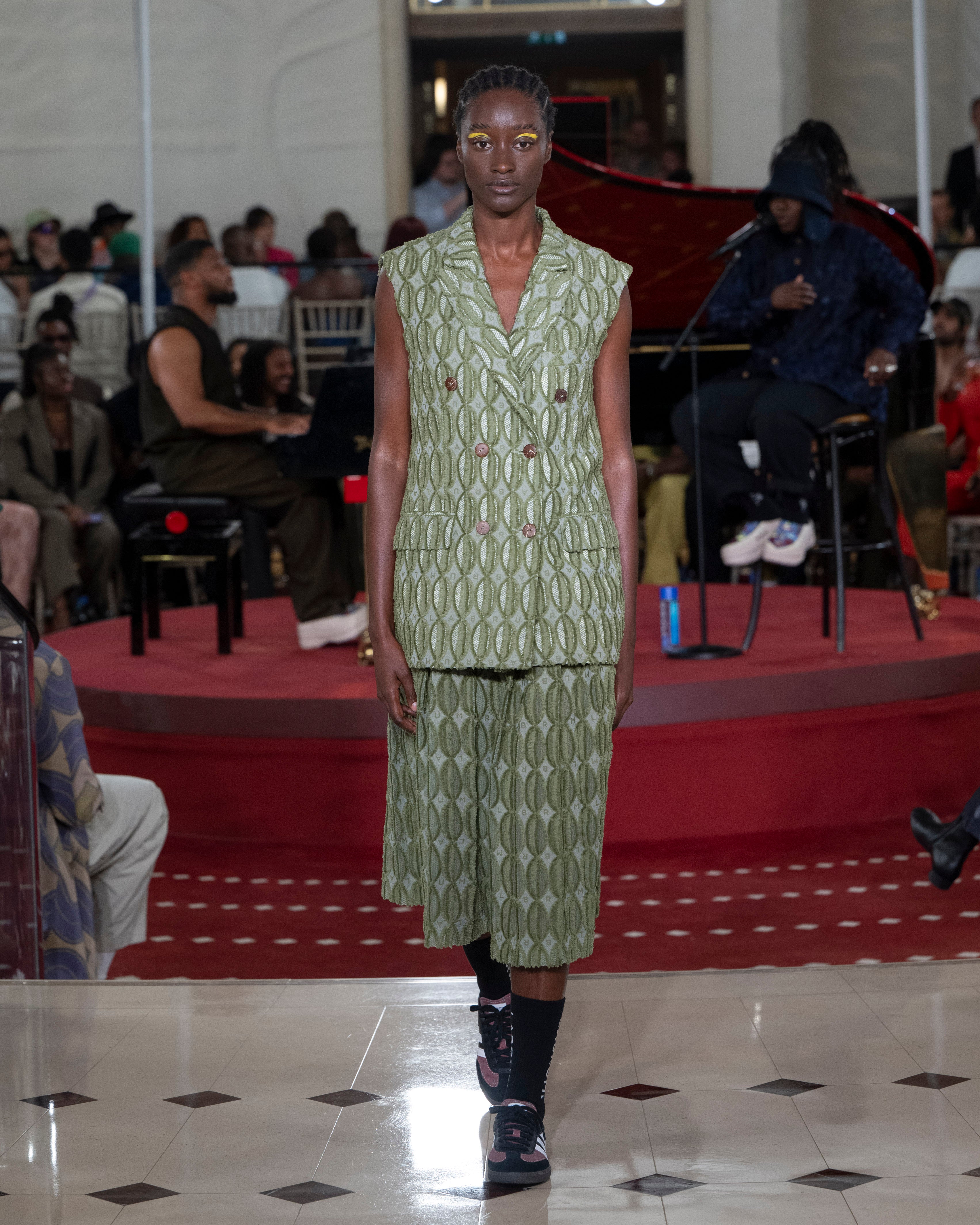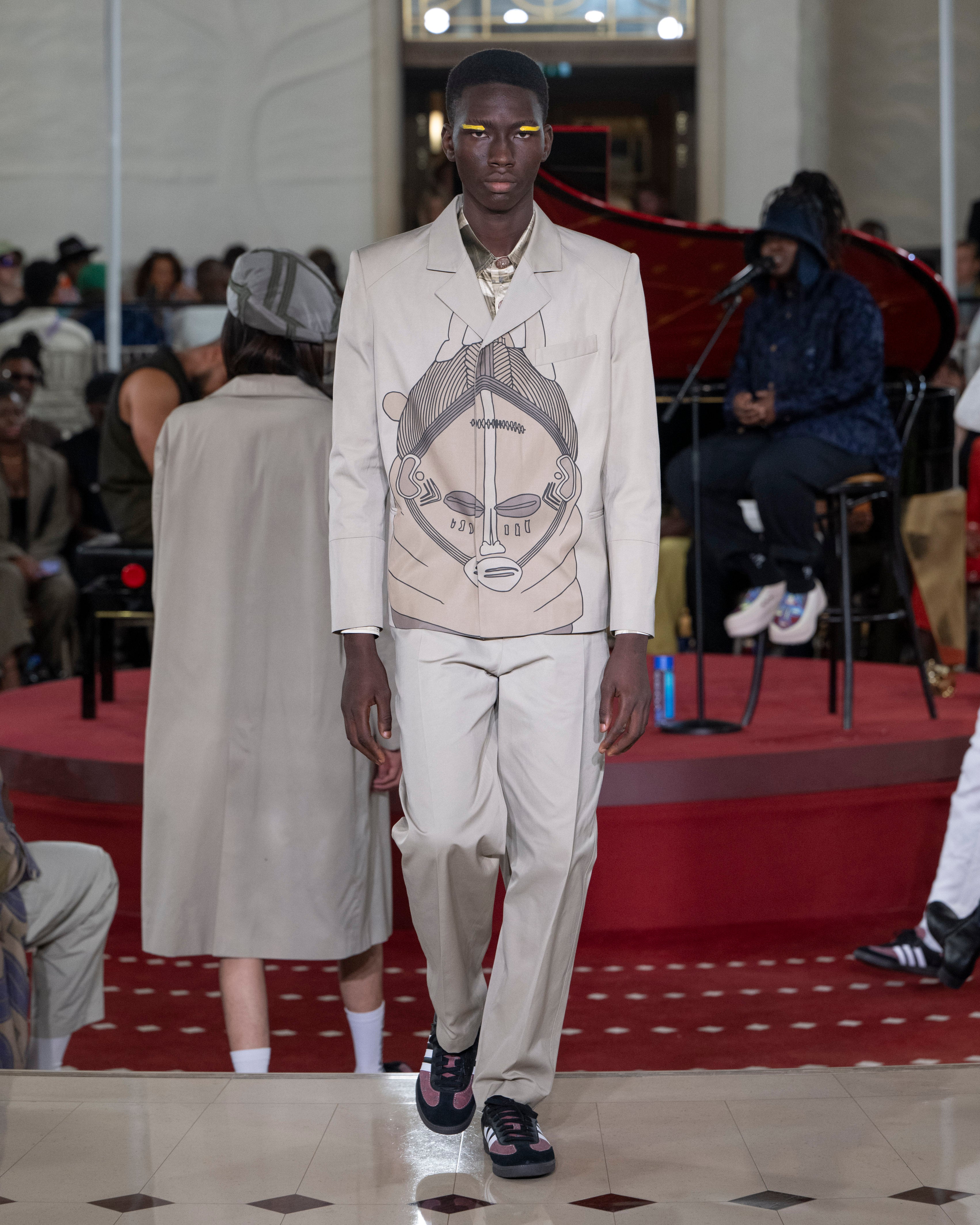 Masquerades and folktales were an initial starting point. Valuable stories were told and lessons were learned through these widely revered celebrations across West Africa. The showpieces pay direct homage to this with masks appearing throughout in printed textiles. Raffia and similar frayed fabrics nod to the materials used in the traditional masquerade attire. Blazers feature mask prints, symbolising the courageous faces of individuals who have found a new home, solace and inspiration here in London — a modern hub of culture and vibrant stories.