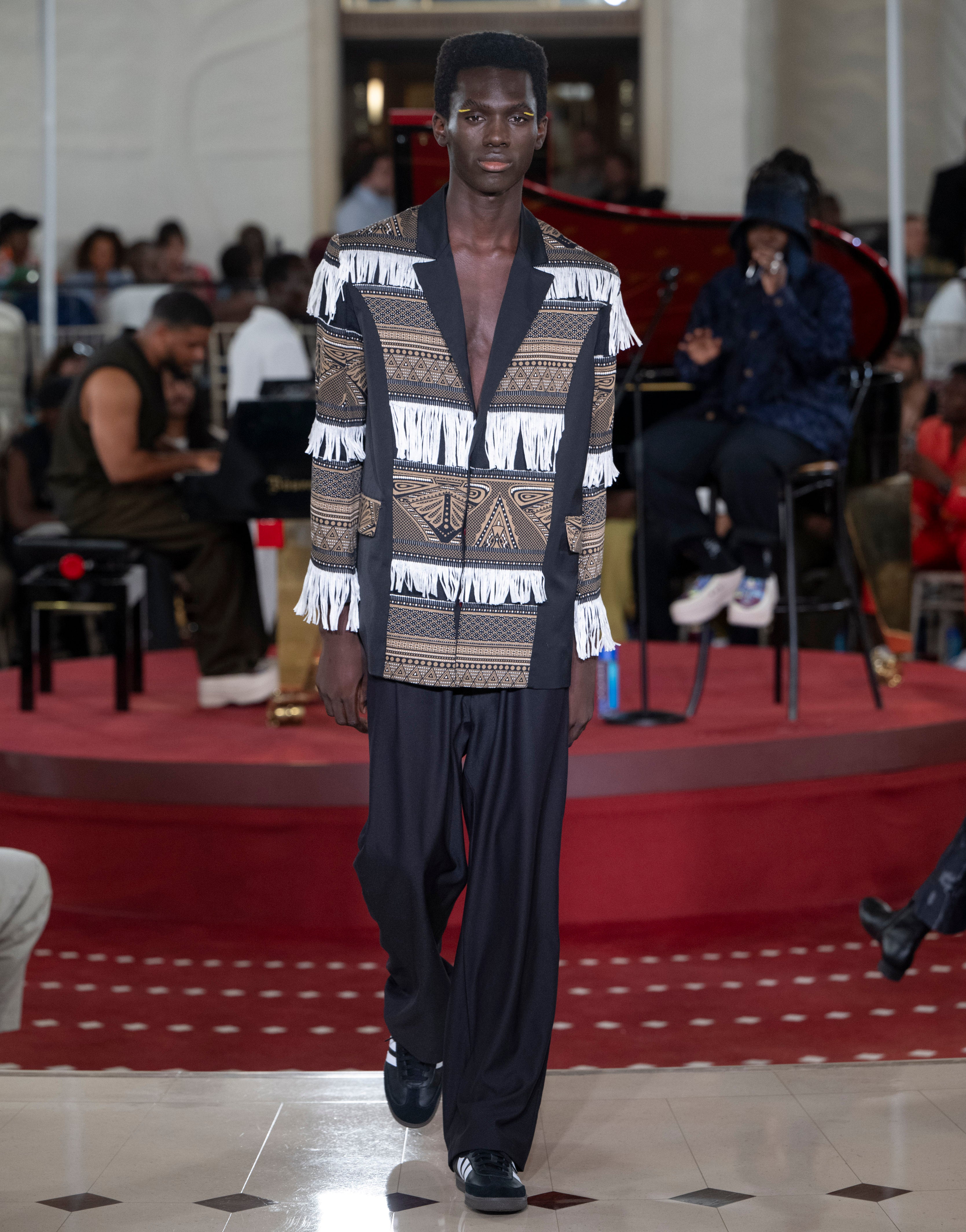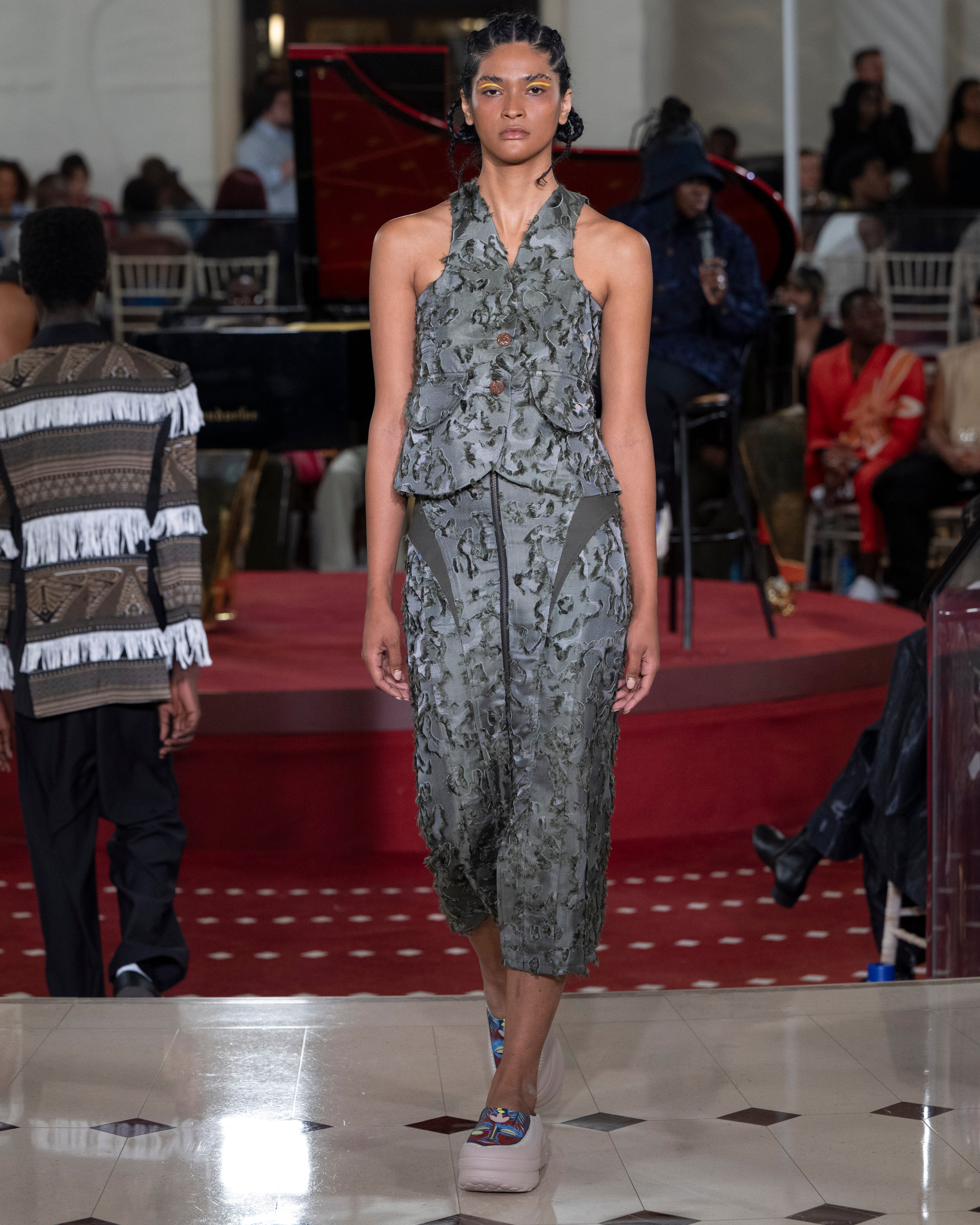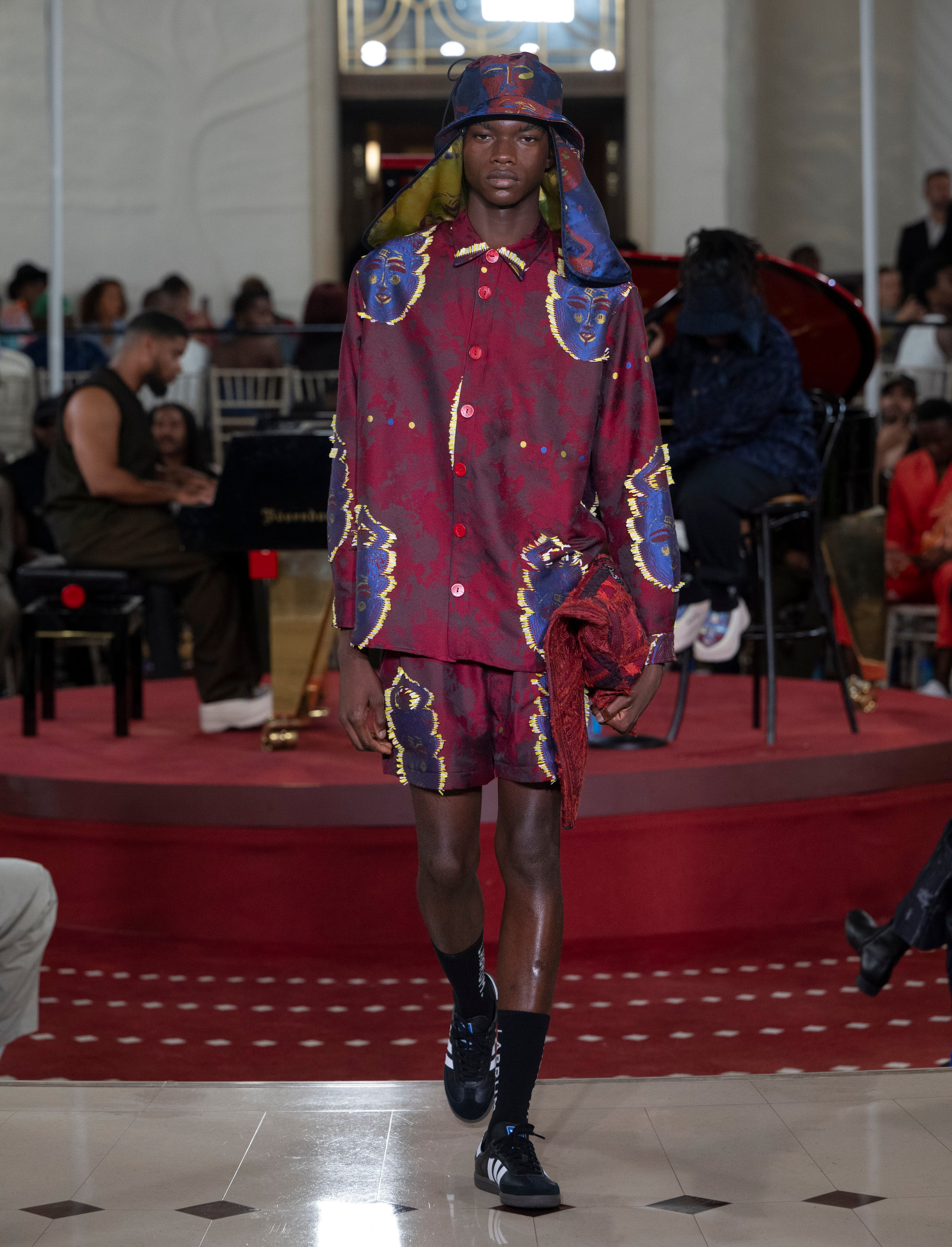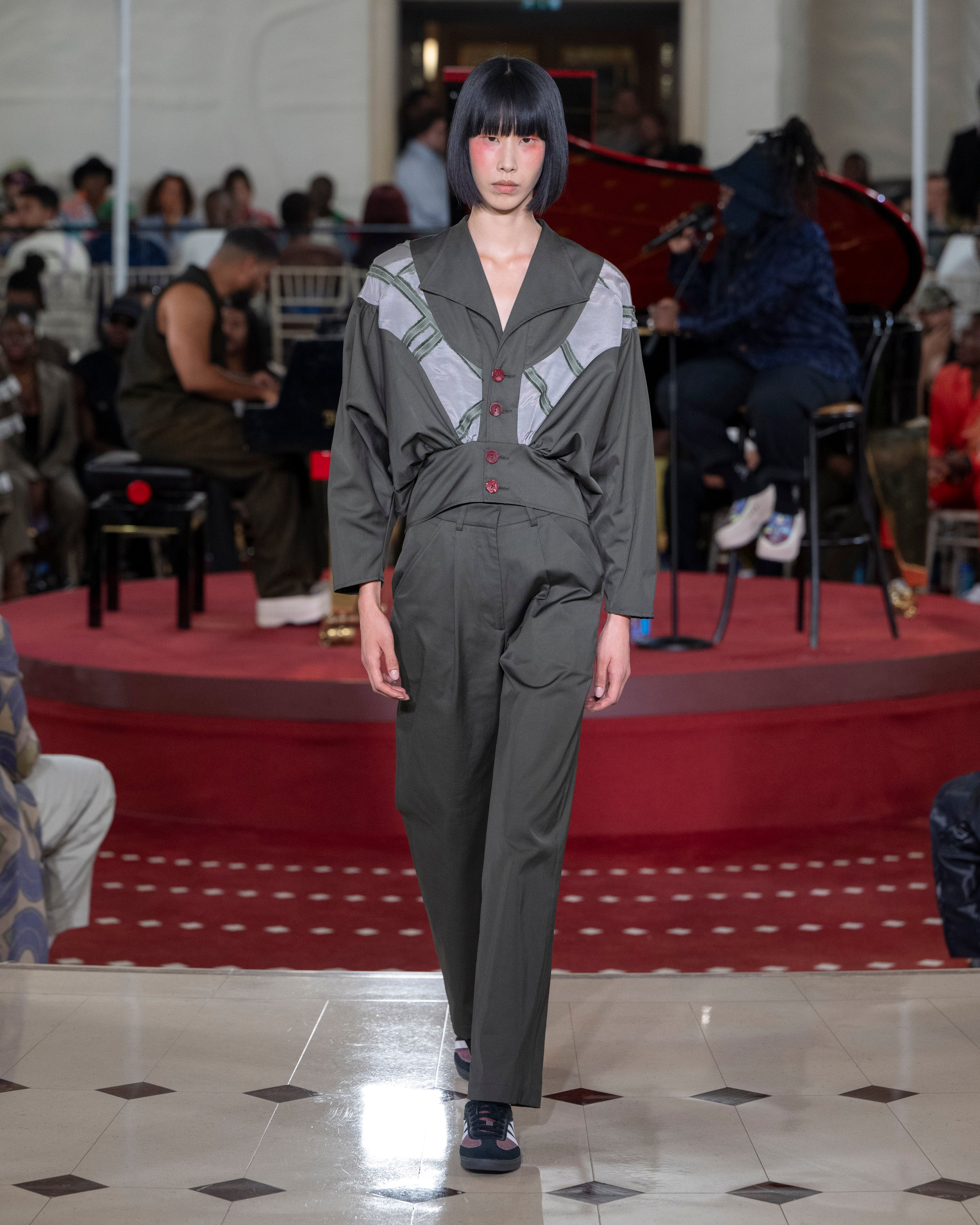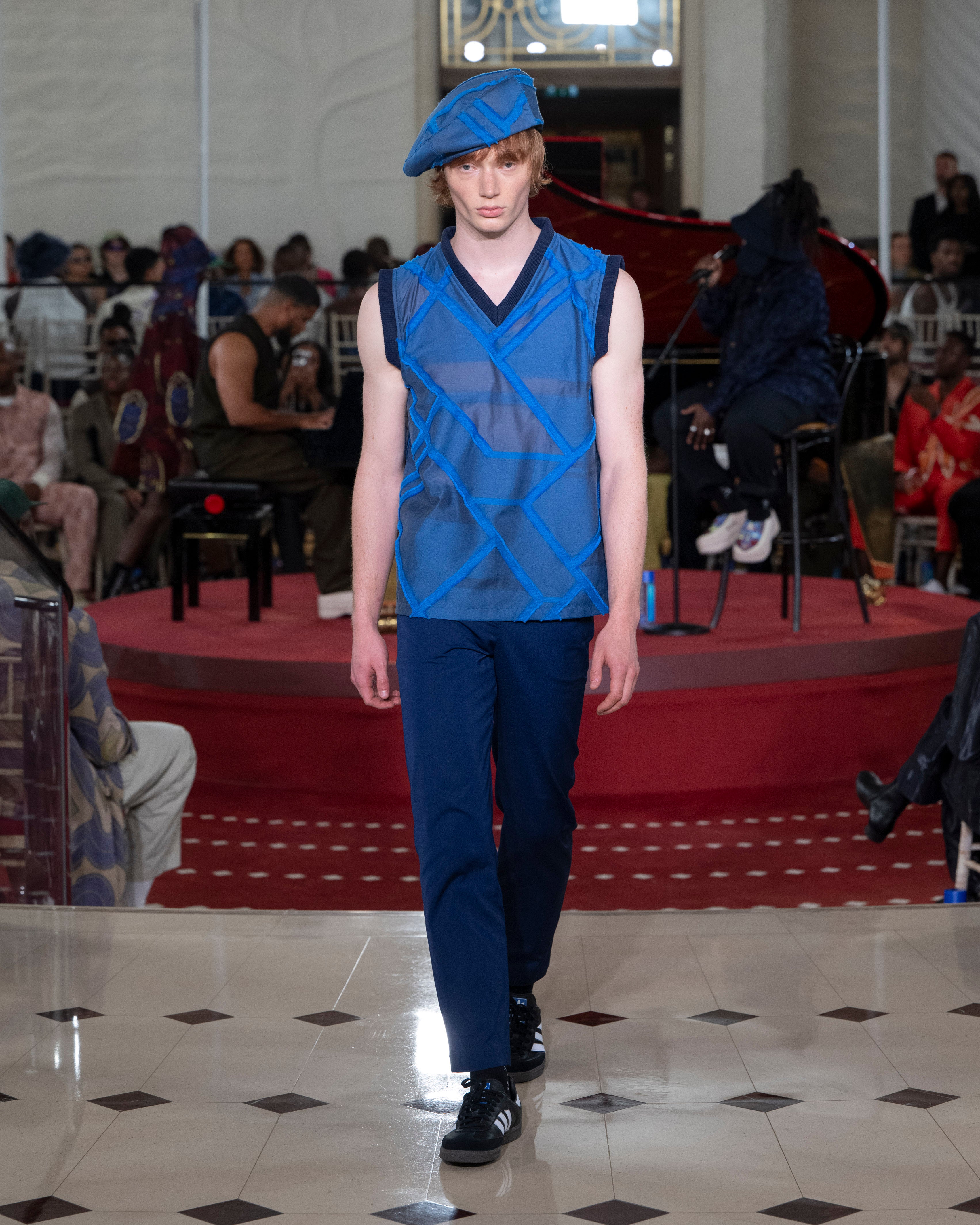 Masquerades and folktales were an initial starting point. Valuable stories were told and lessons were learned through these widely revered celebrations across West Africa. The showpieces pay direct homage to this with masks appearing throughout in printed textiles. Raffia and similar frayed fabrics nod to the materials used in the traditional masquerade attire. Blazers feature mask prints, symbolising the courageous faces of individuals who have found a new home, solace and inspiration here in London — a modern hub of culture and vibrant stories.