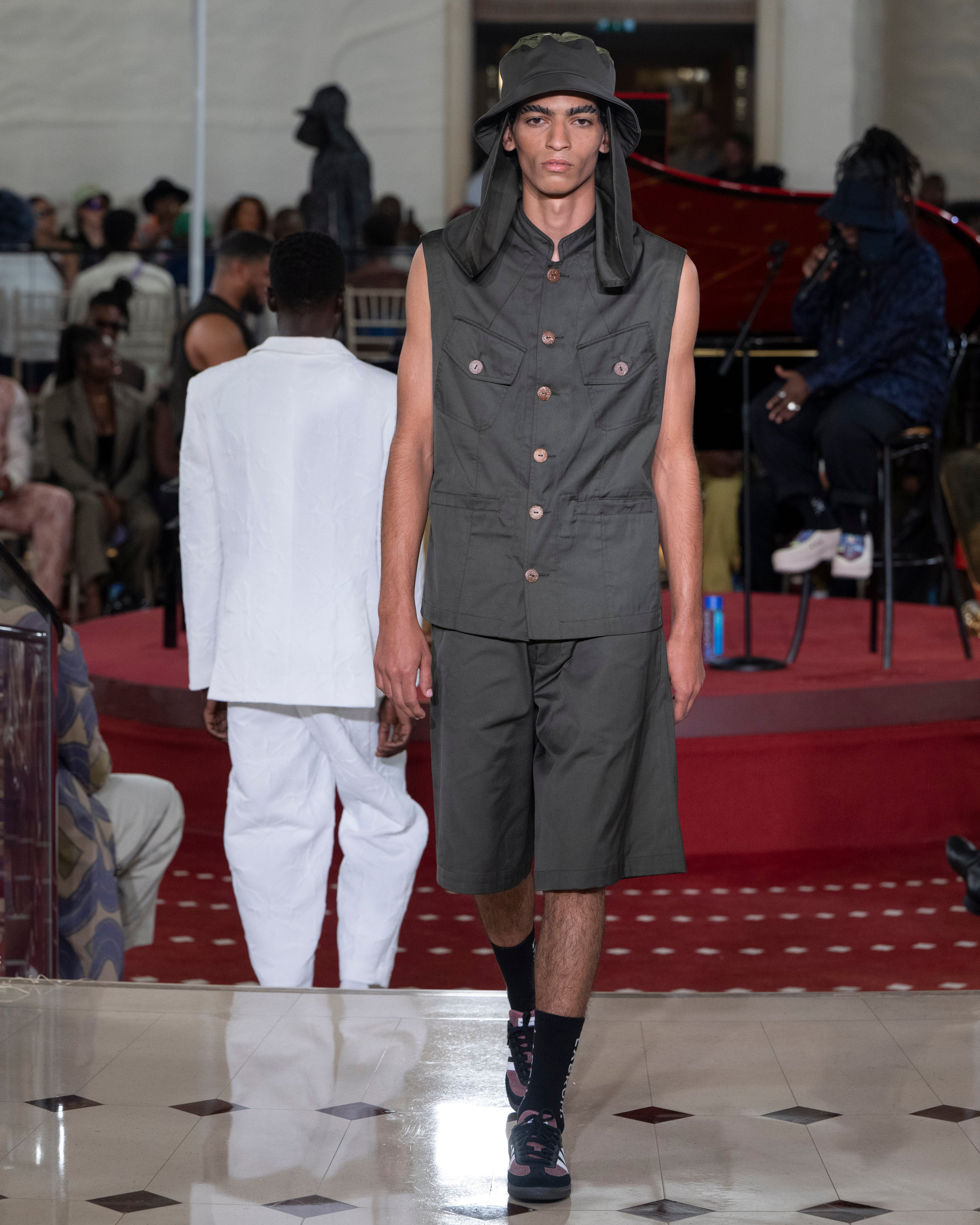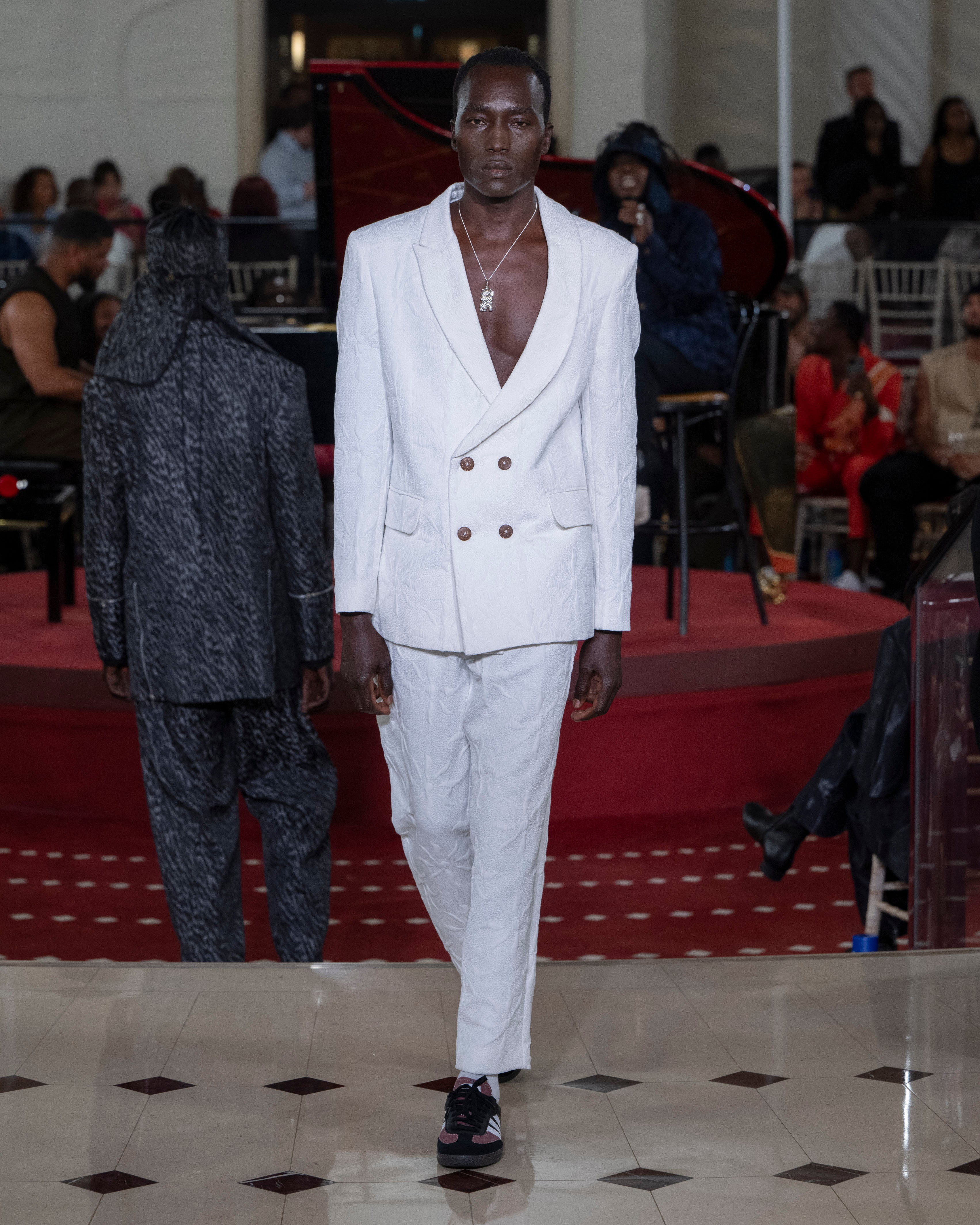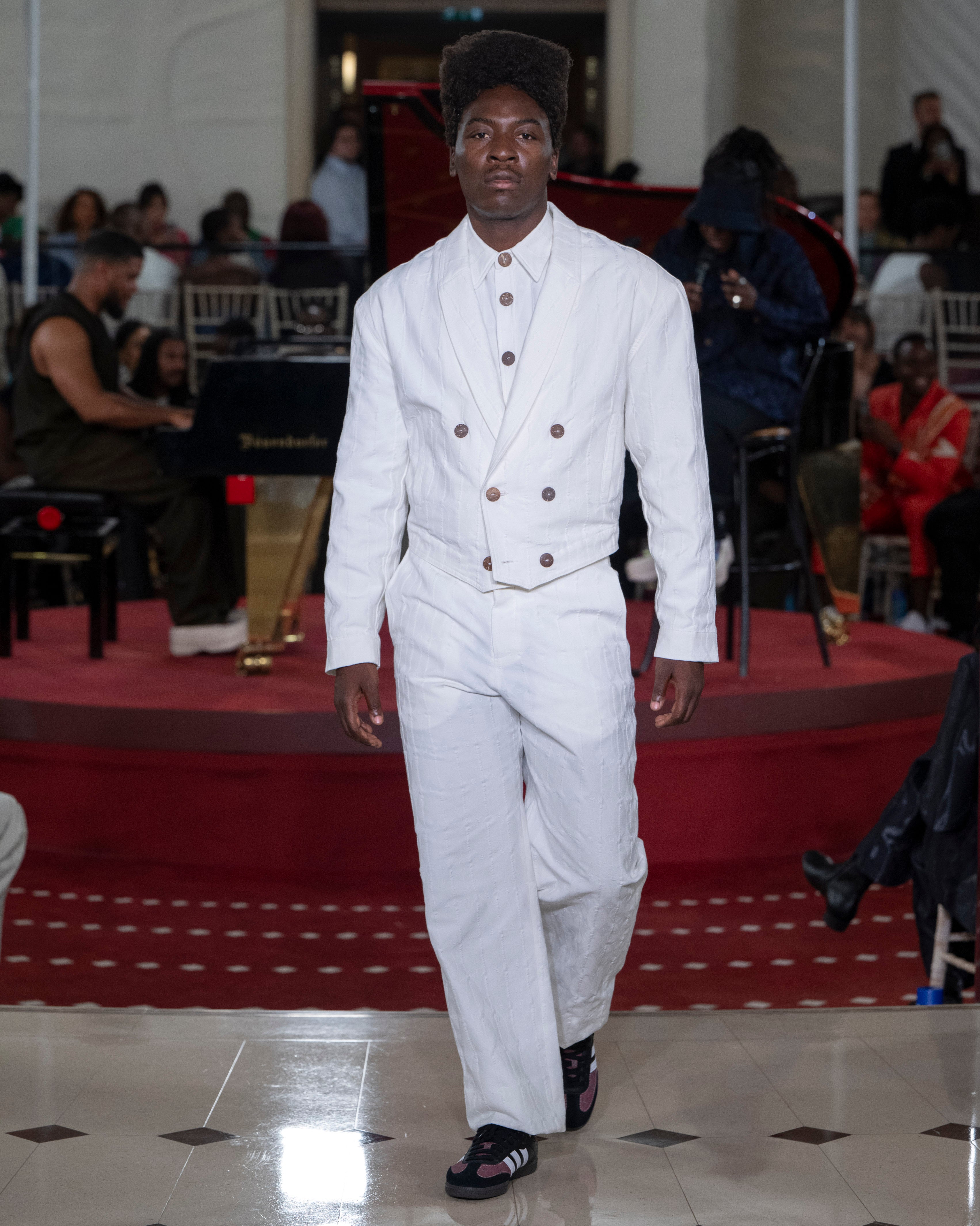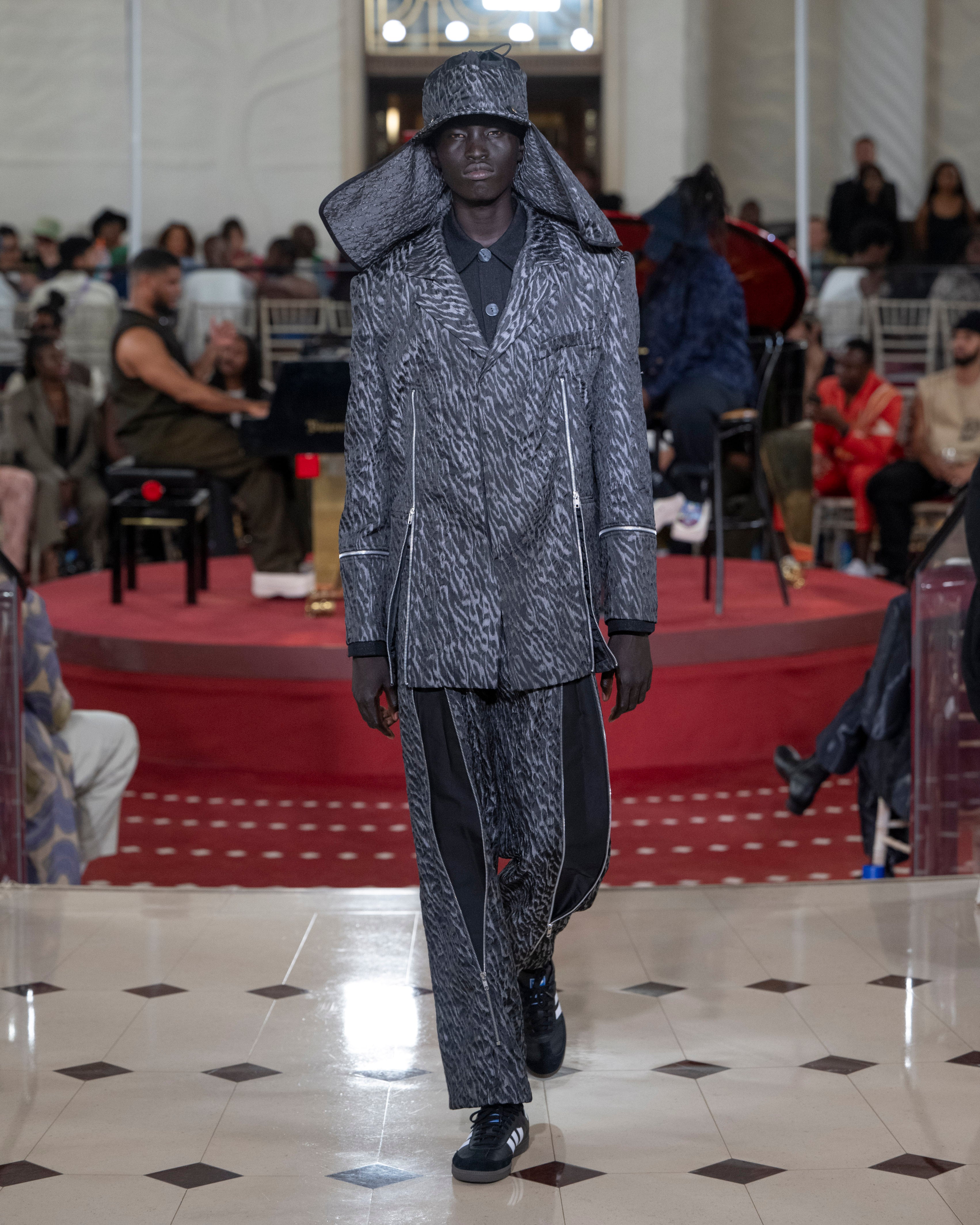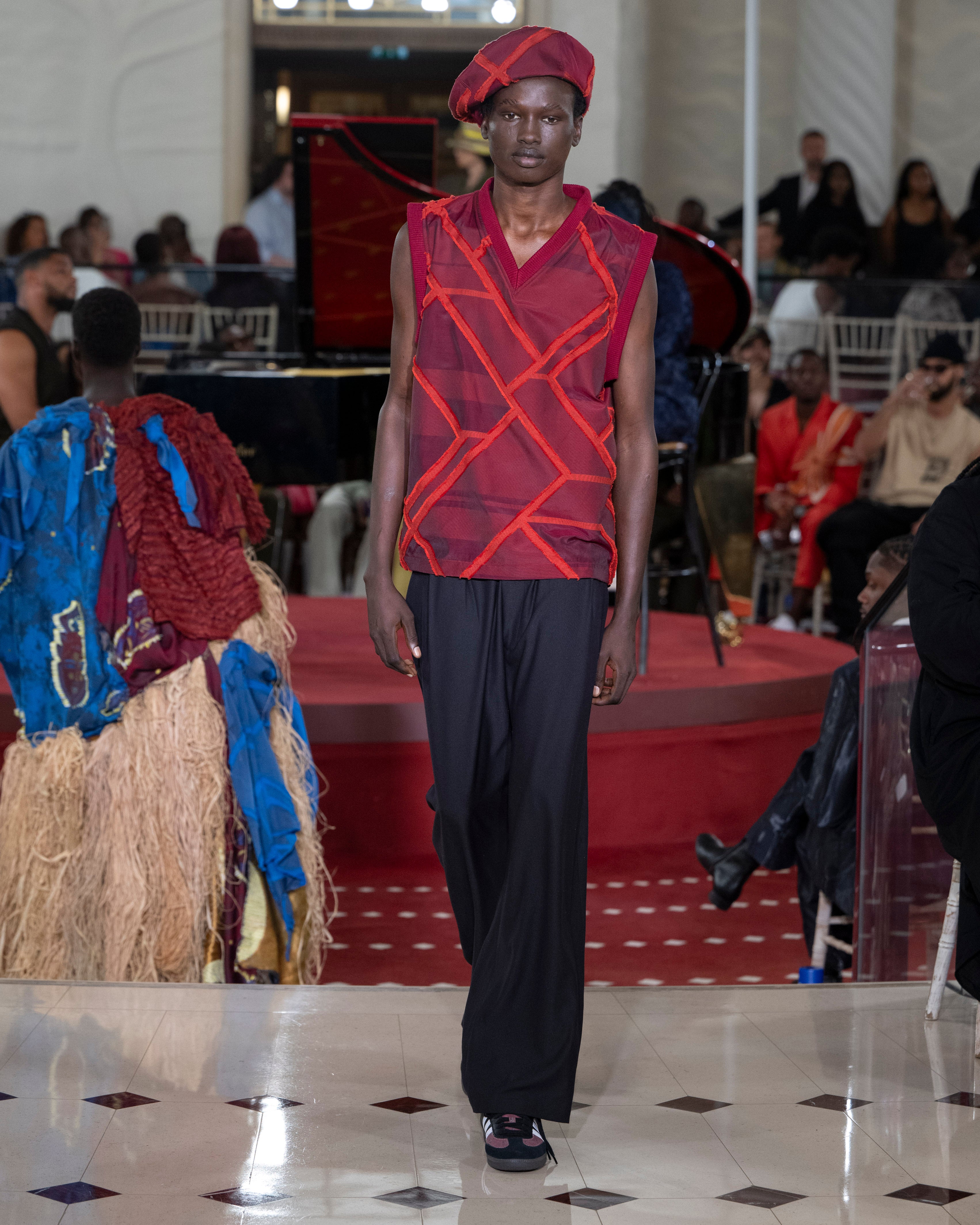 Masquerades and folktales were an initial starting point. Valuable stories were told and lessons were learned through these widely revered celebrations across West Africa. The showpieces pay direct homage to this with masks appearing throughout in printed textiles. Raffia and similar frayed fabrics nod to the materials used in the traditional masquerade attire. Blazers feature mask prints, symbolising the courageous faces of individuals who have found a new home, solace and inspiration here in London — a modern hub of culture and vibrant stories.