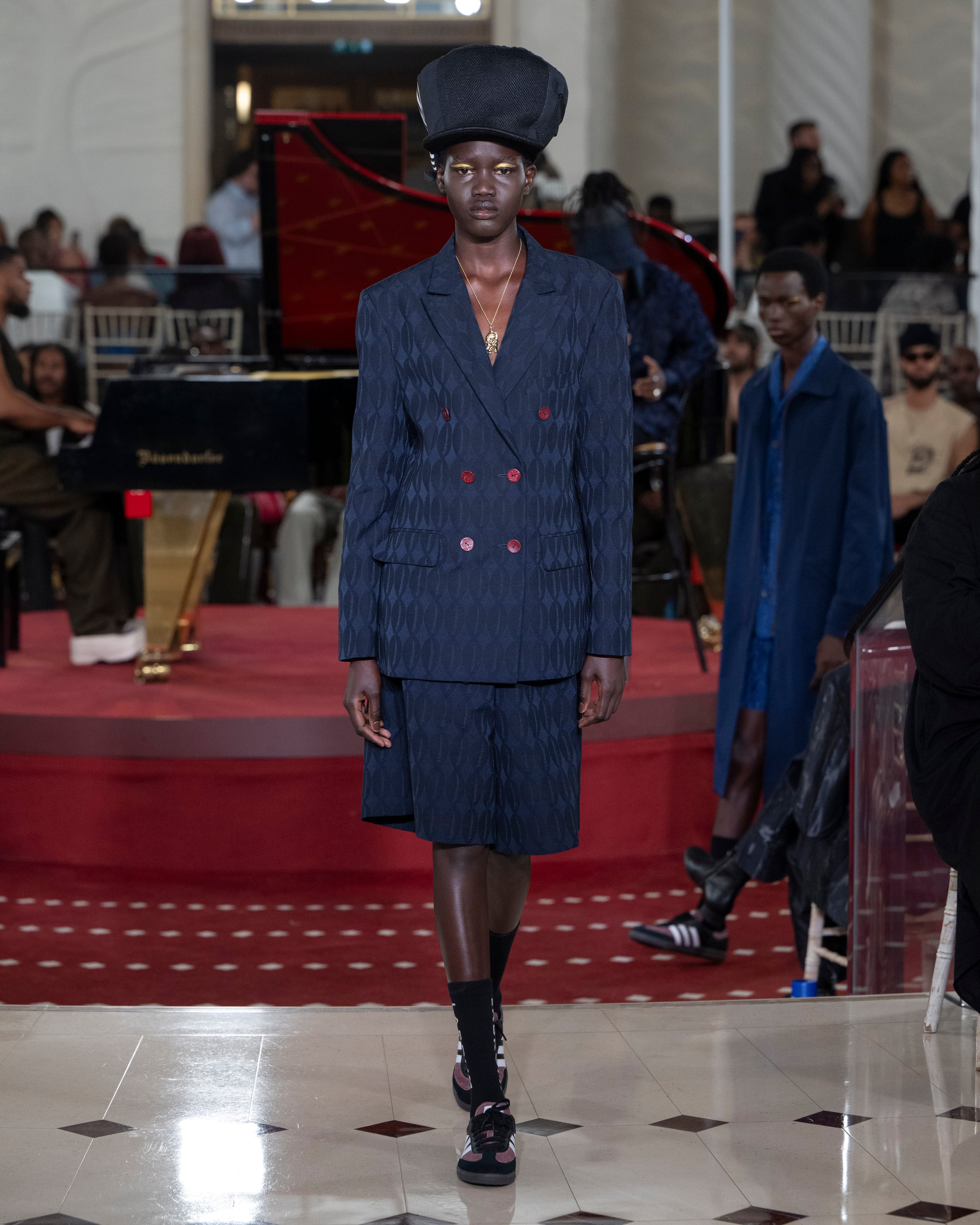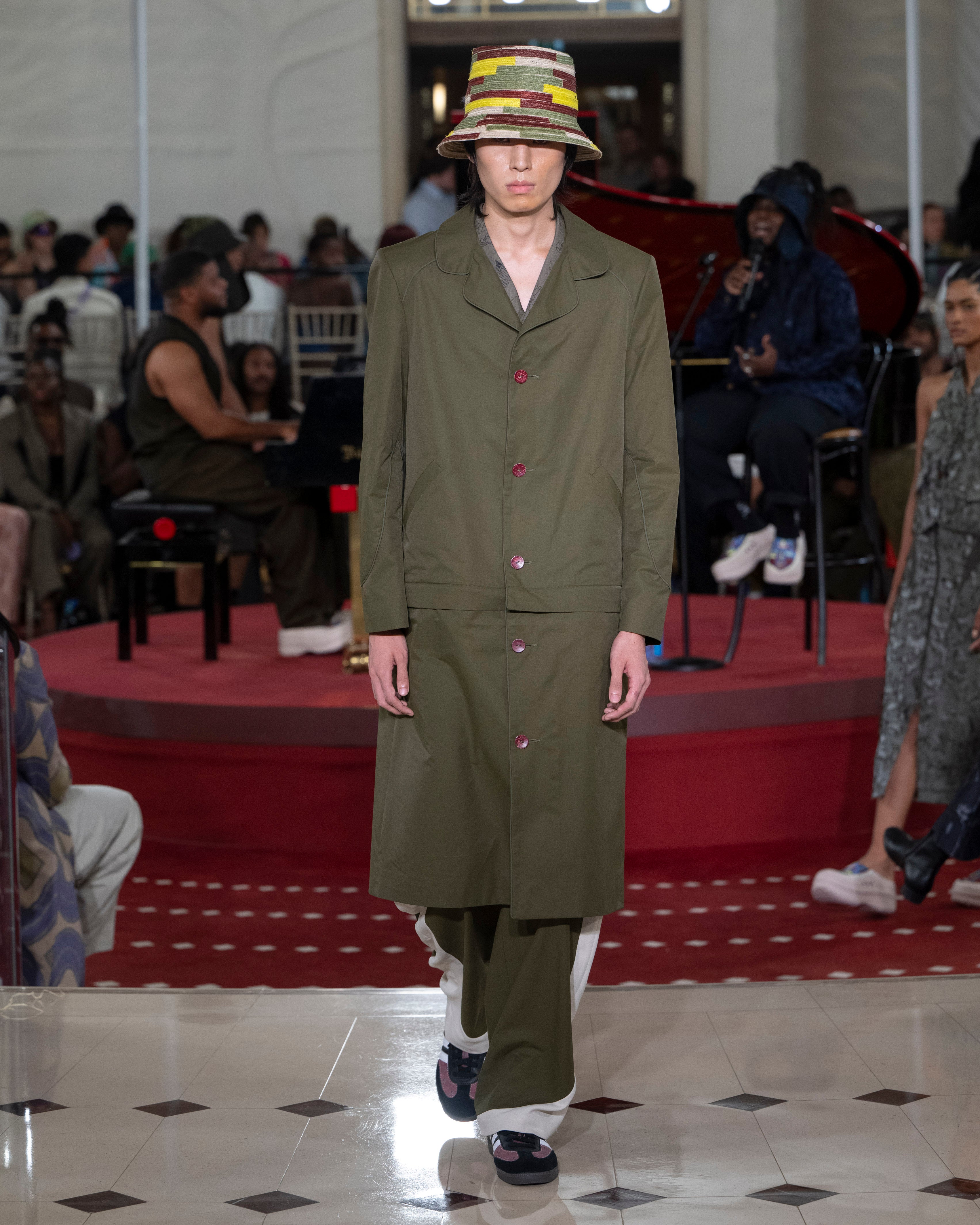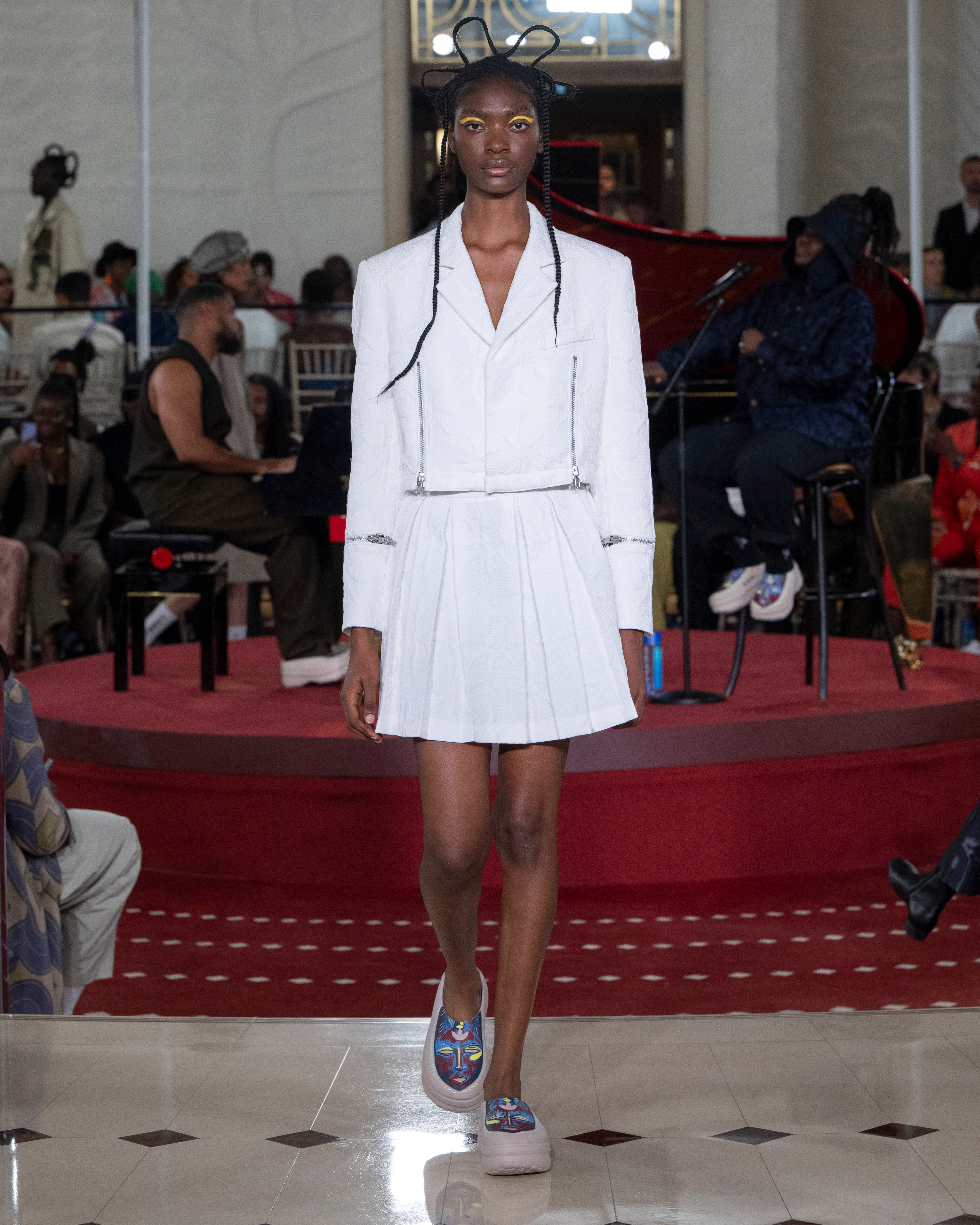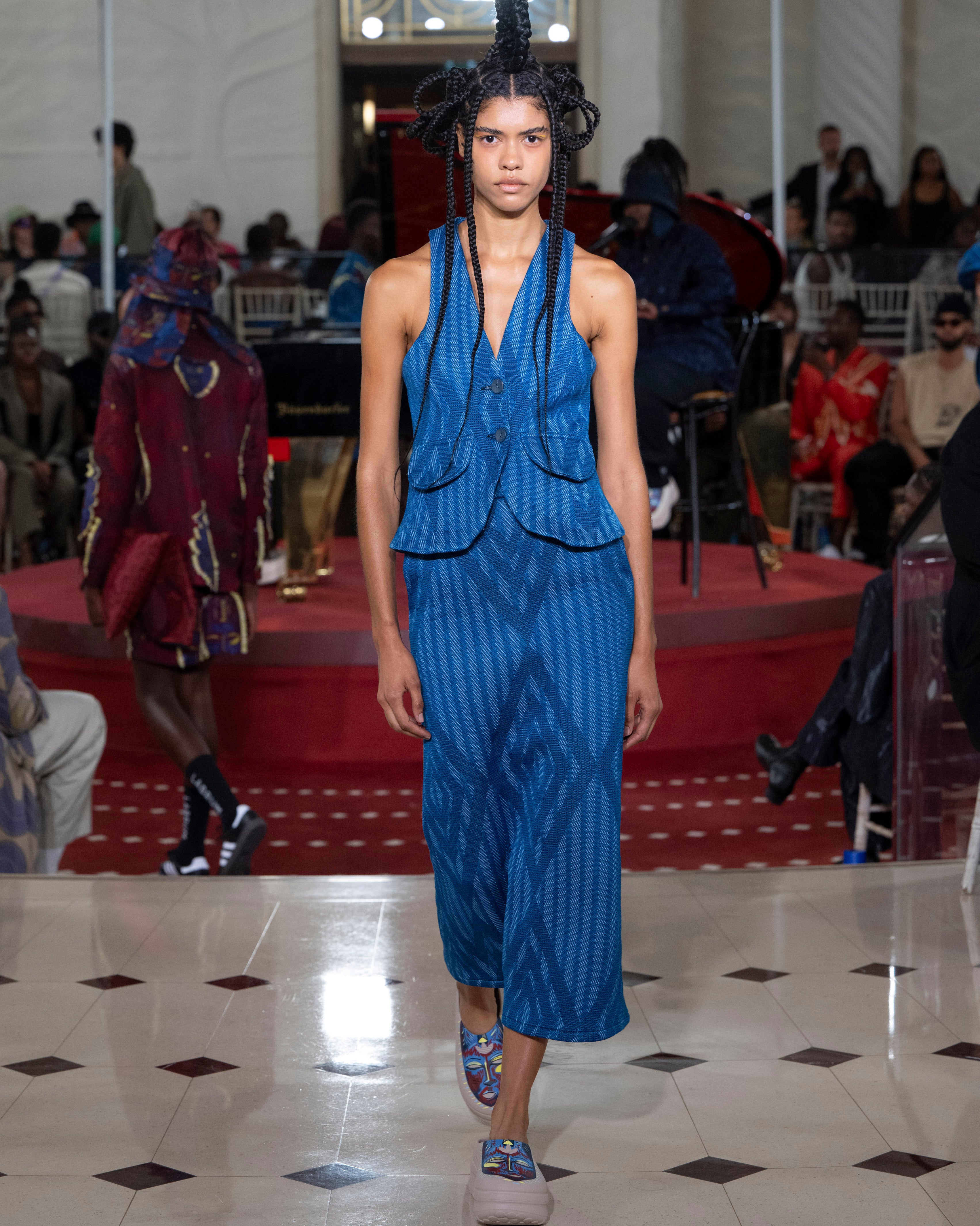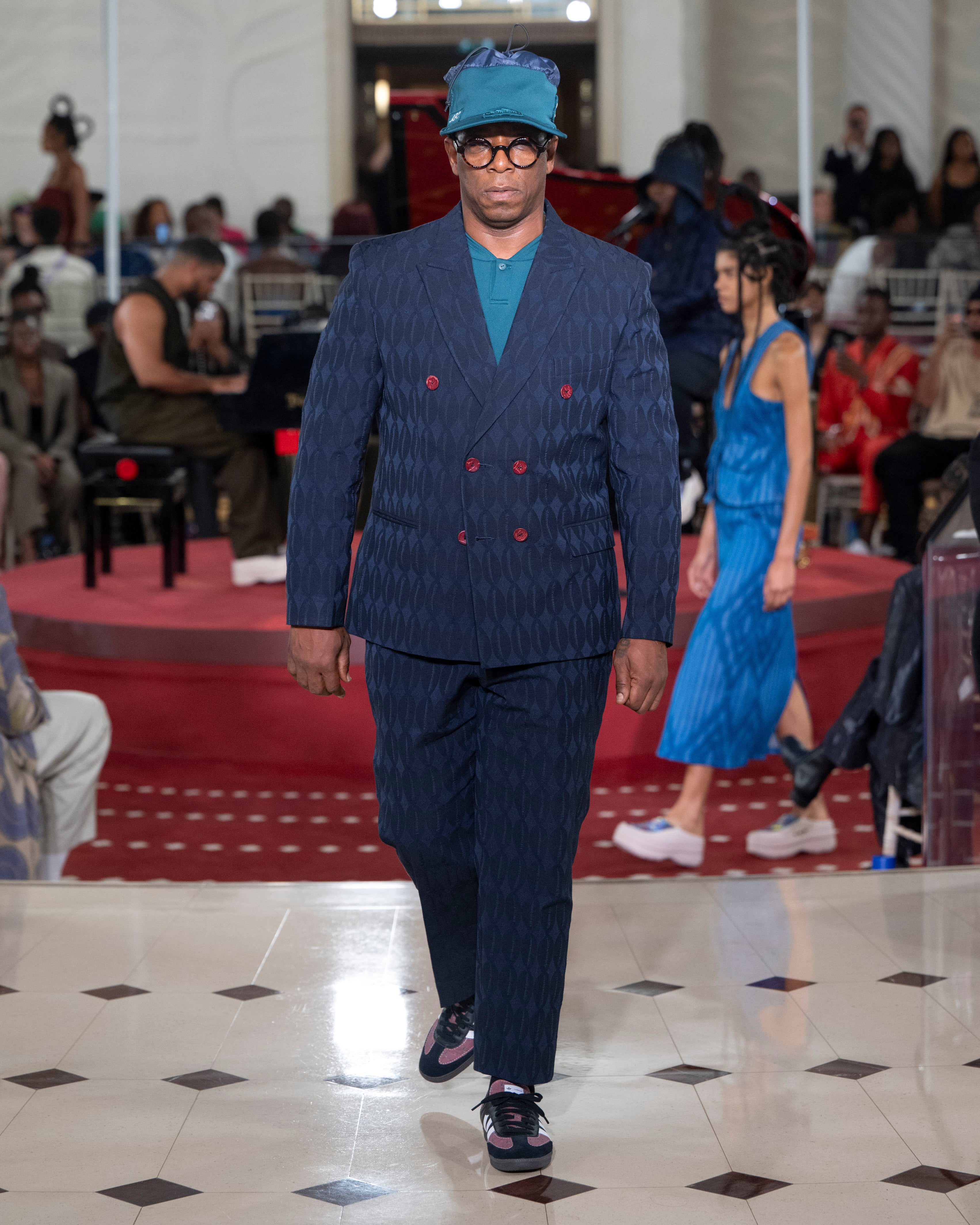 Masquerades and folktales were an initial starting point. Valuable stories were told and lessons were learned through these widely revered celebrations across West Africa. The showpieces pay direct homage to this with masks appearing throughout in printed textiles. Raffia and similar frayed fabrics nod to the materials used in the traditional masquerade attire. Blazers feature mask prints, symbolising the courageous faces of individuals who have found a new home, solace and inspiration here in London — a modern hub of culture and vibrant stories.