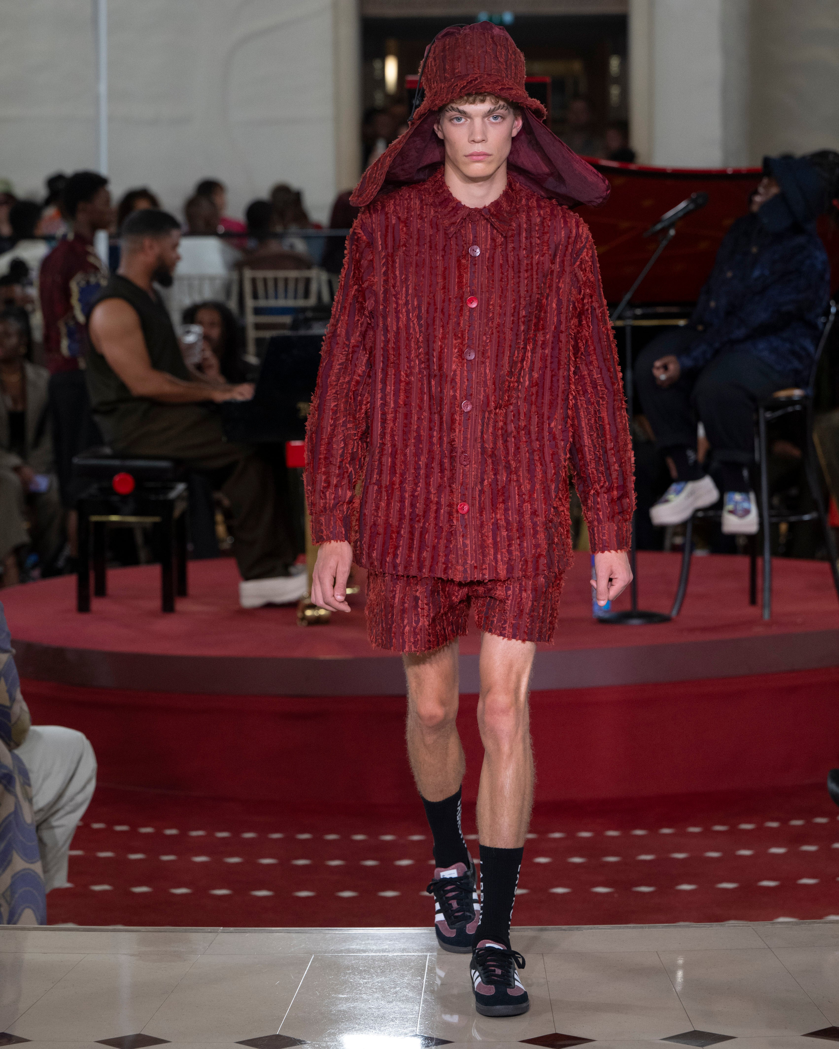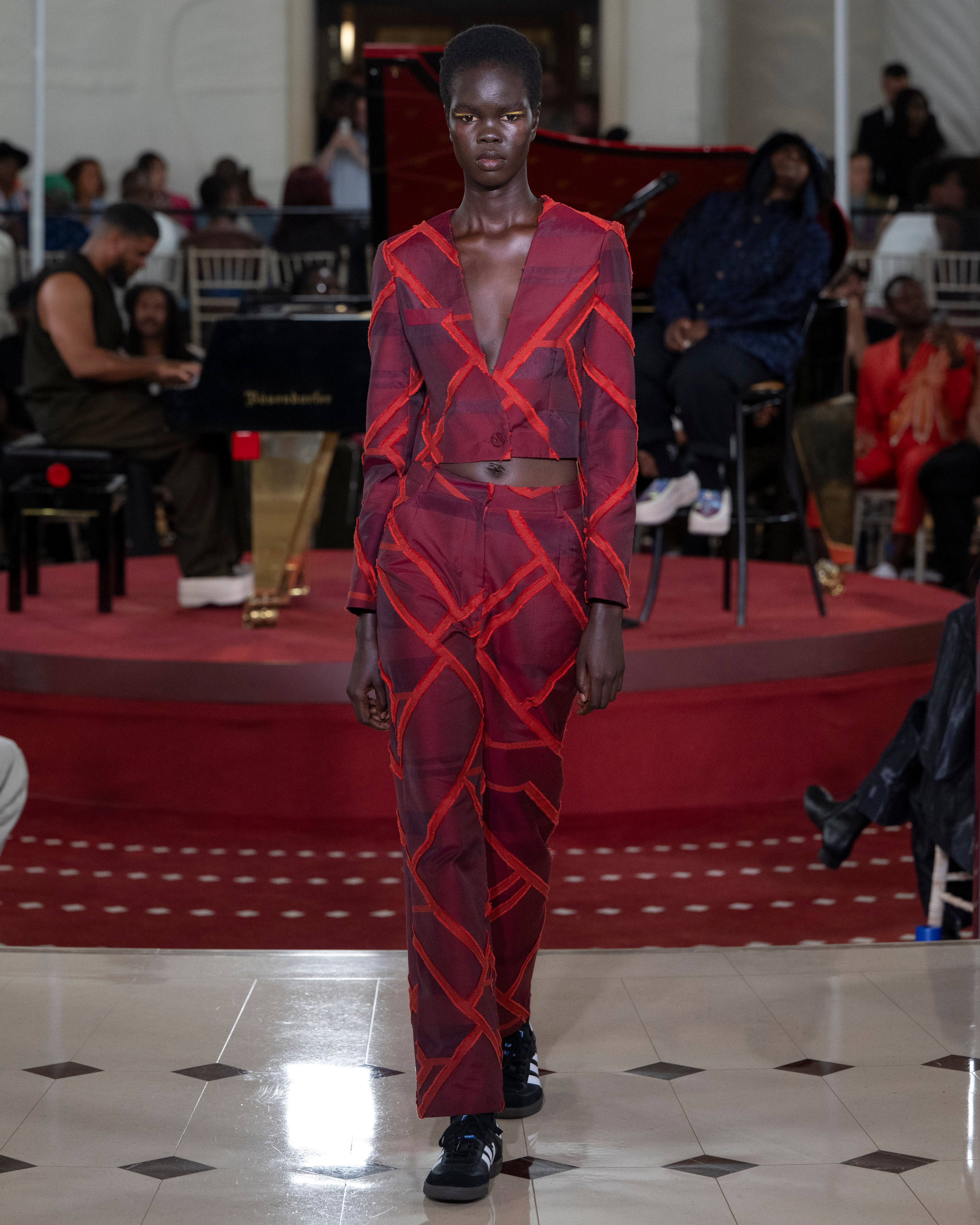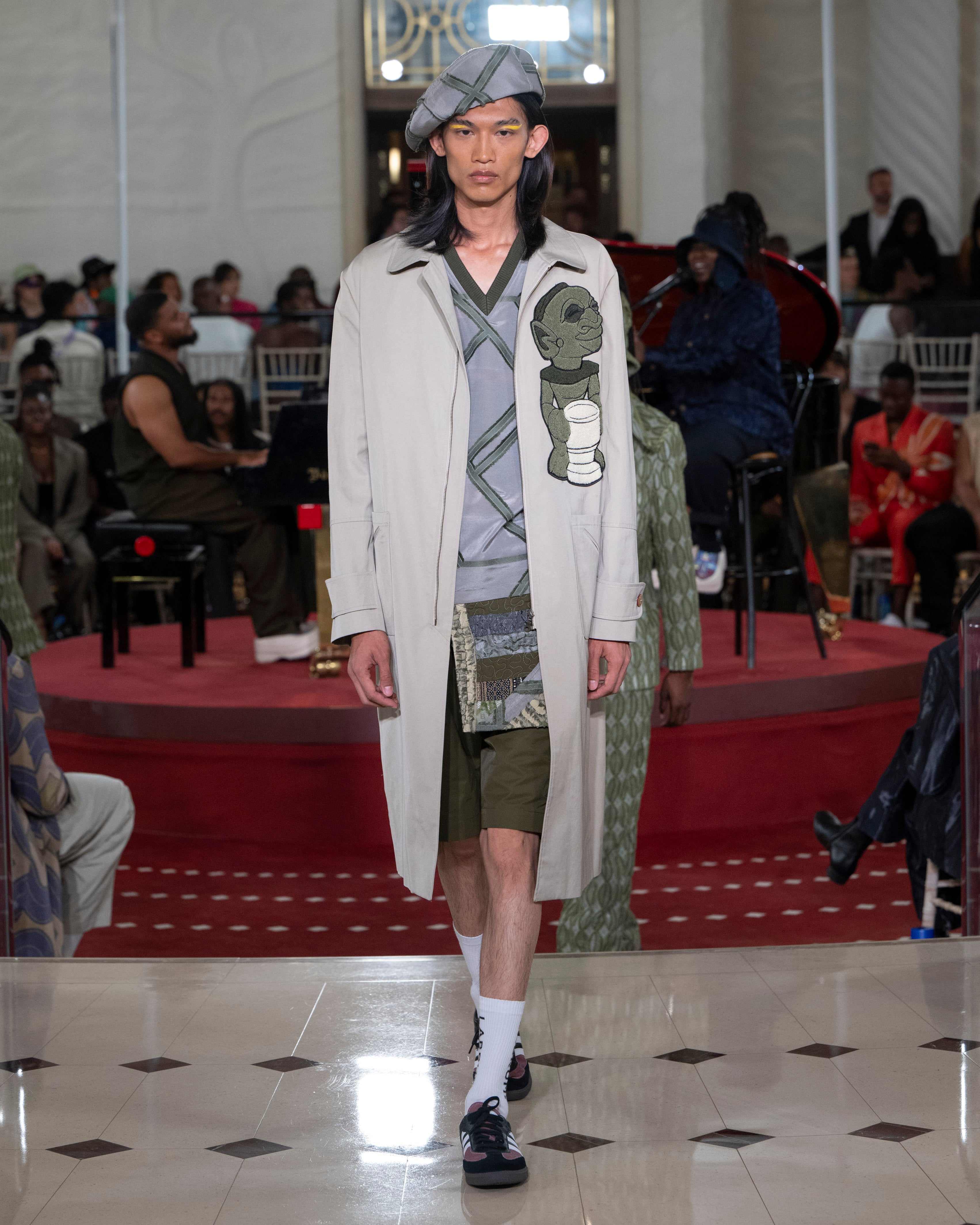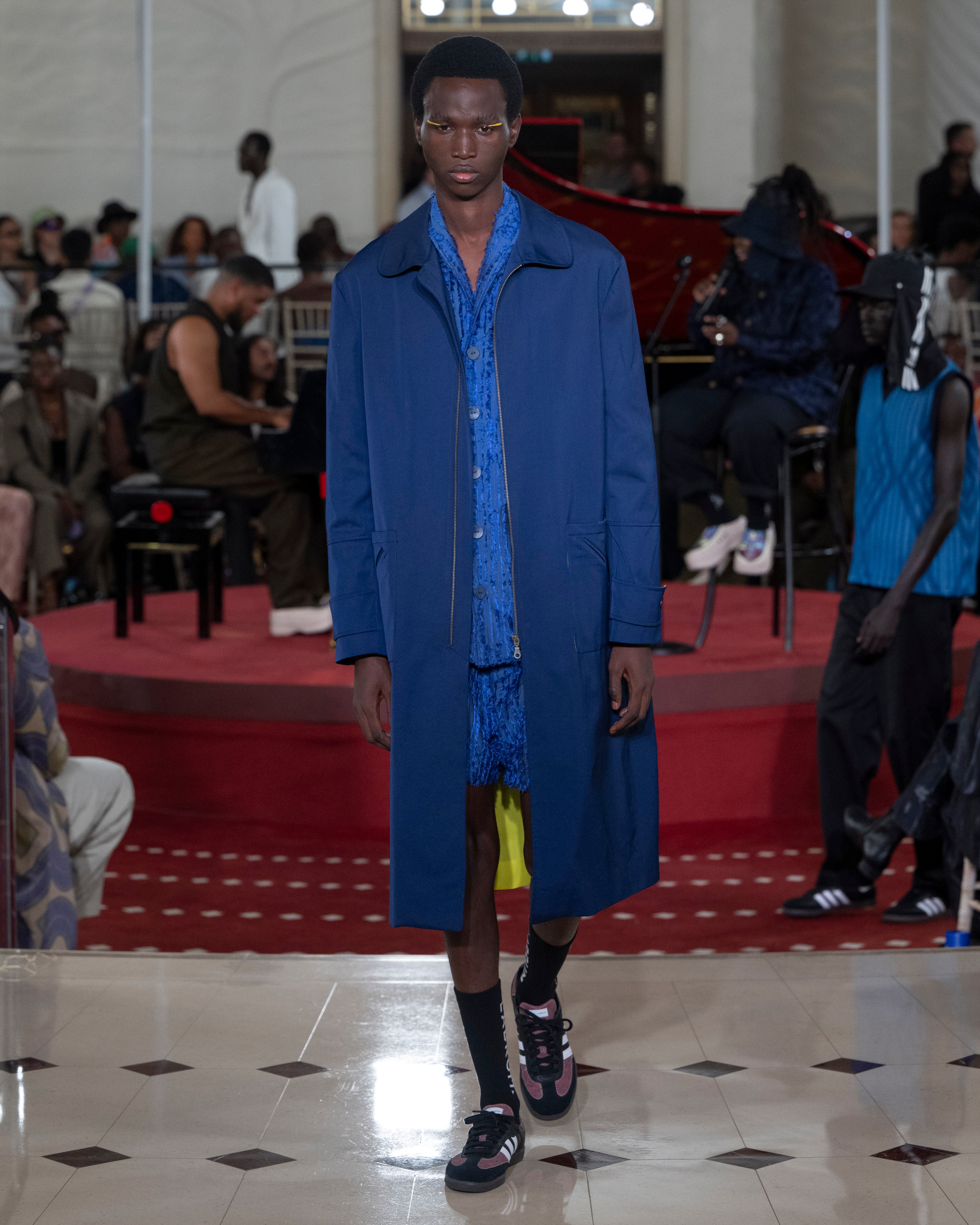 Masquerades and folktales were an initial starting point. Valuable stories were told and lessons were learned through these widely revered celebrations across West Africa. The showpieces pay direct homage to this with masks appearing throughout in printed textiles. Raffia and similar frayed fabrics nod to the materials used in the traditional masquerade attire. Blazers feature mask prints, symbolising the courageous faces of individuals who have found a new home, solace and inspiration here in London — a modern hub of culture and vibrant stories.