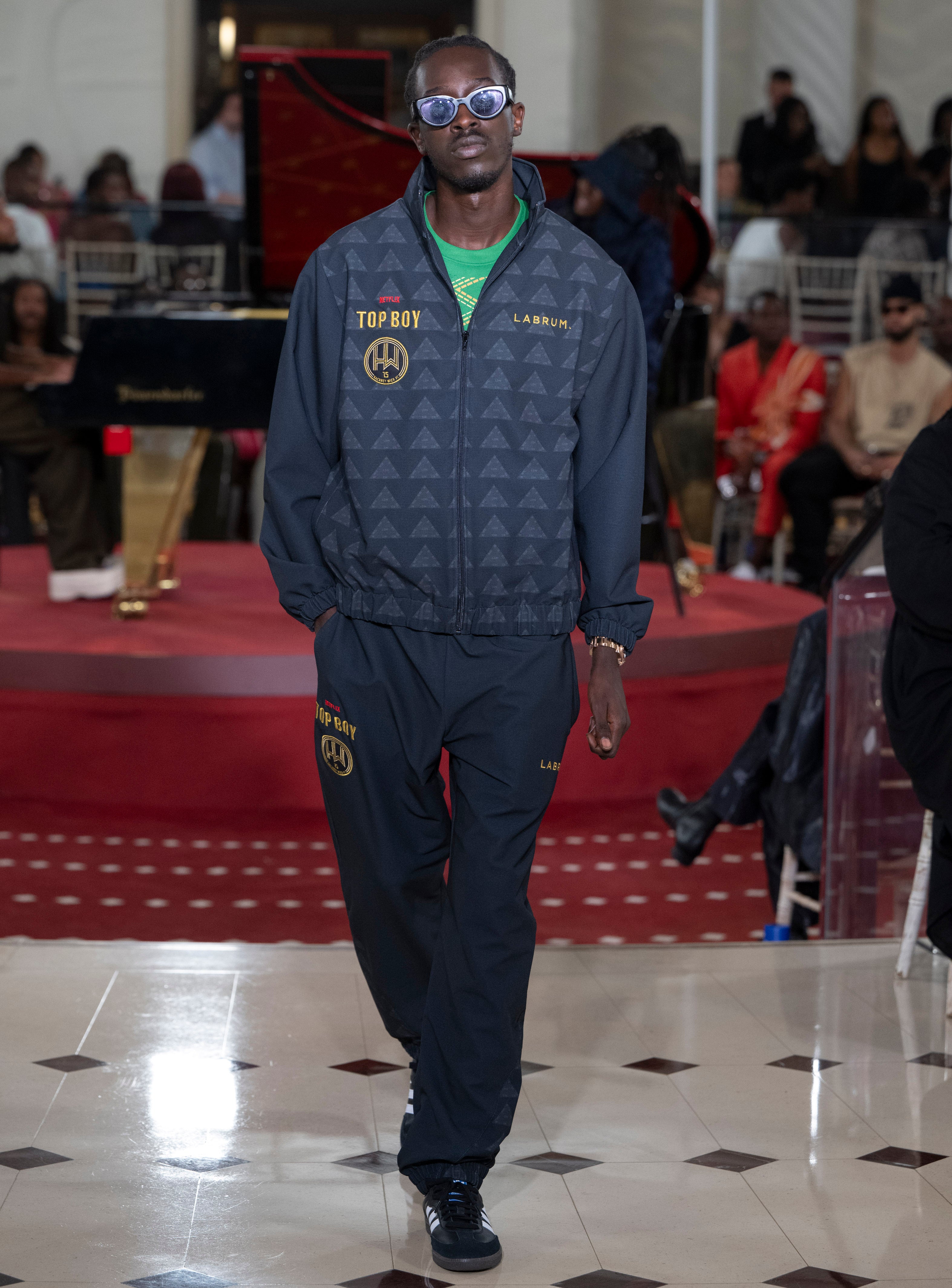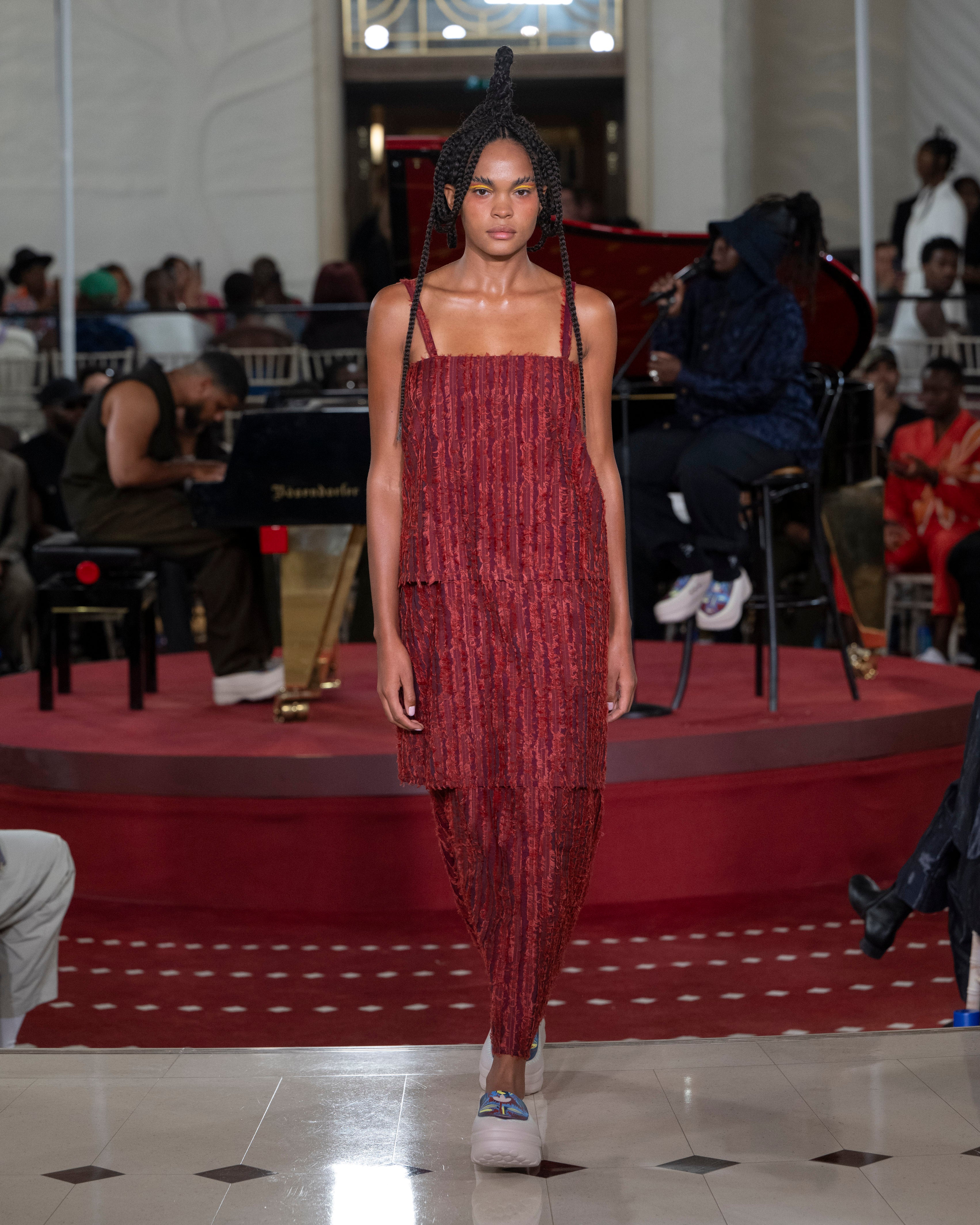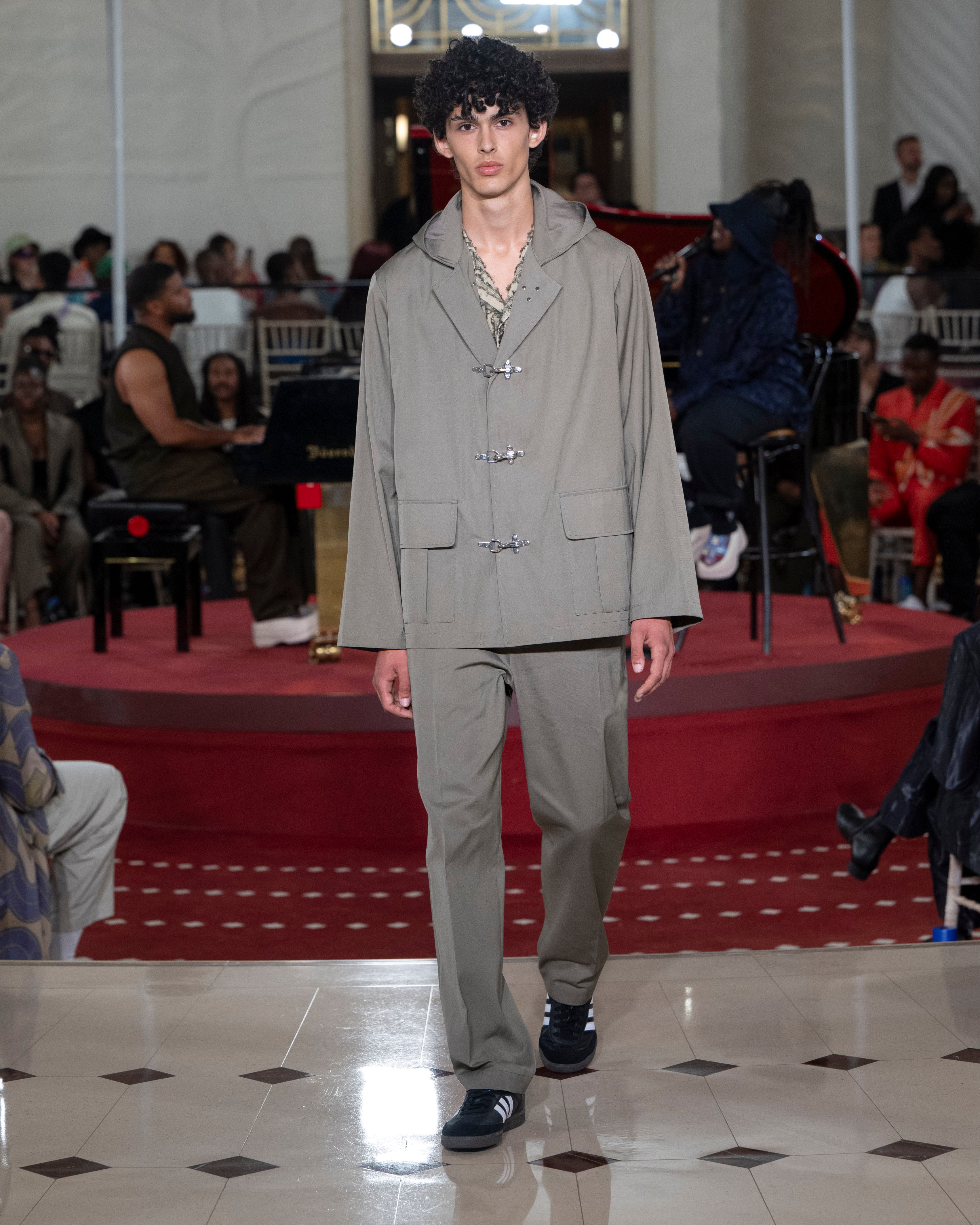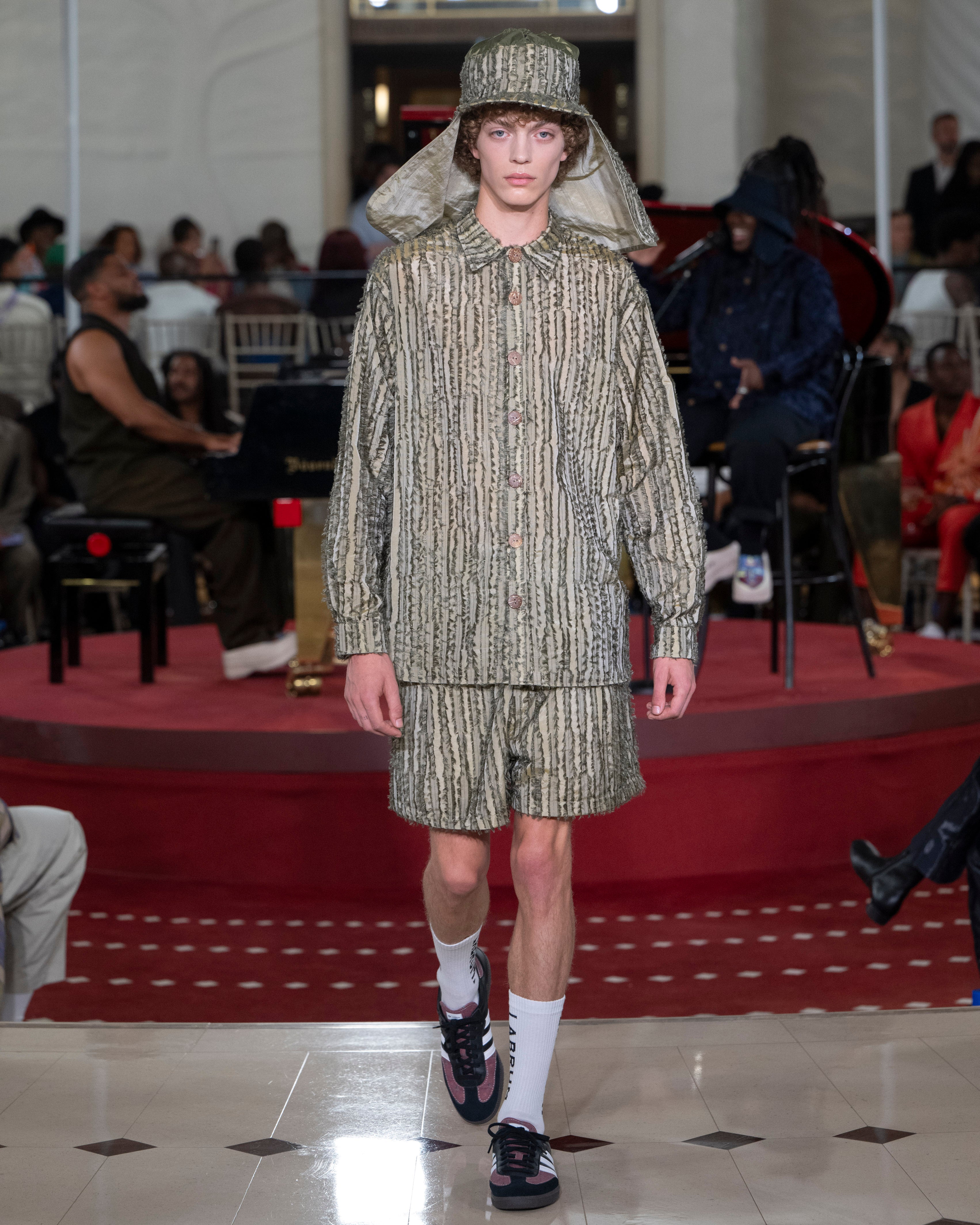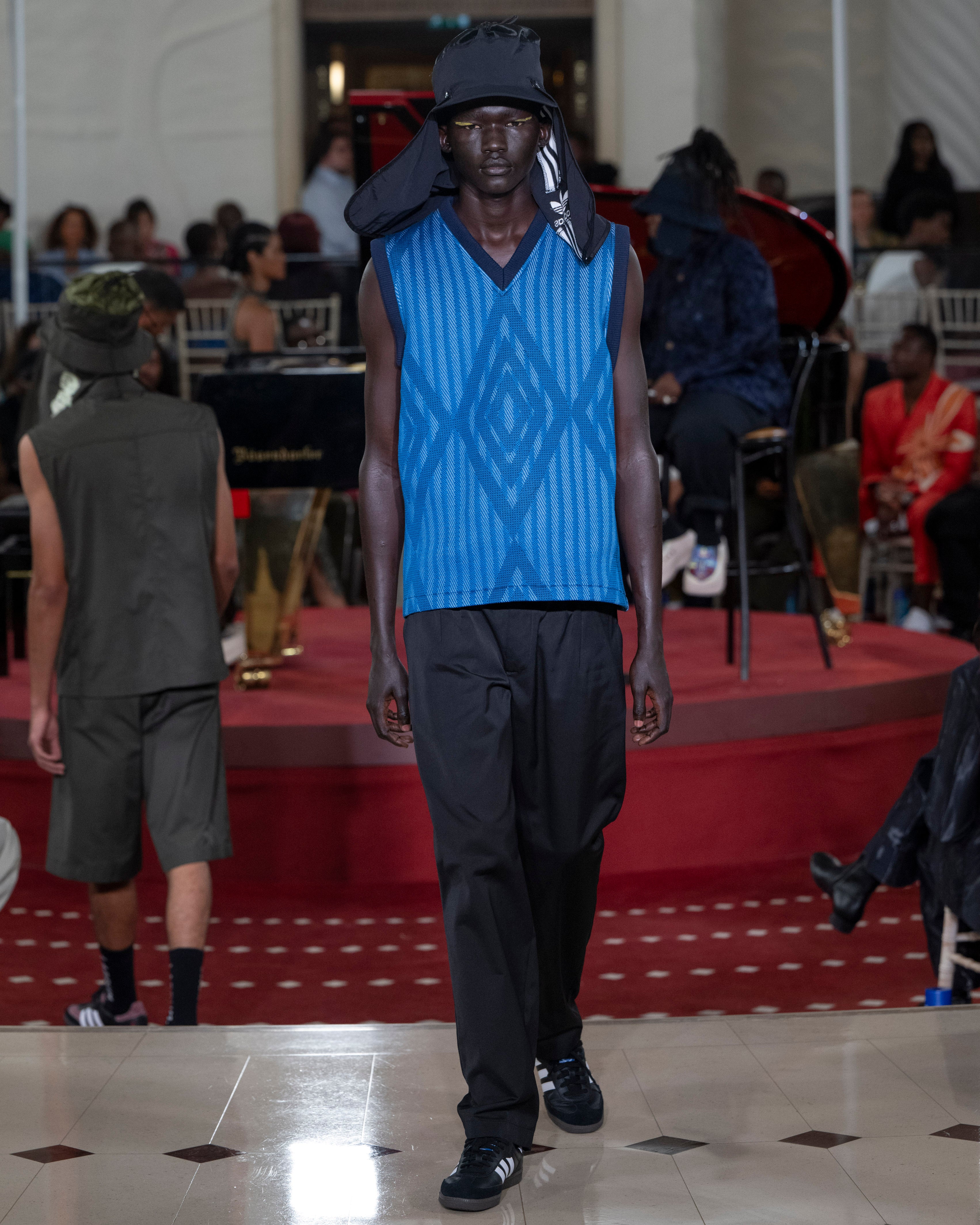 Masquerades and folktales were an initial starting point. Valuable stories were told and lessons were learned through these widely revered celebrations across West Africa. The showpieces pay direct homage to this with masks appearing throughout in printed textiles. Raffia and similar frayed fabrics nod to the materials used in the traditional masquerade attire. Blazers feature mask prints, symbolising the courageous faces of individuals who have found a new home, solace and inspiration here in London — a modern hub of culture and vibrant stories.