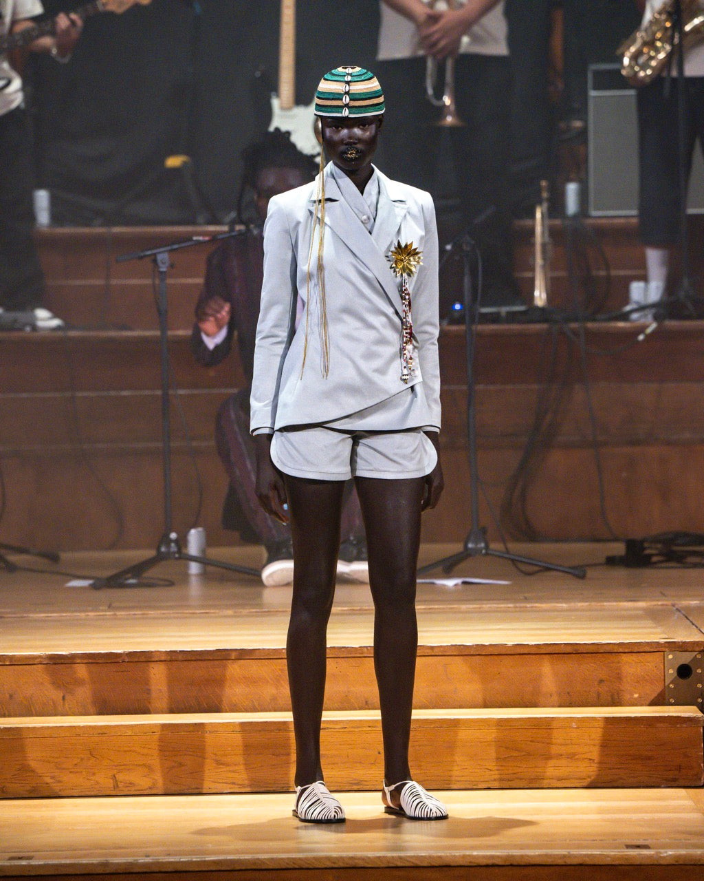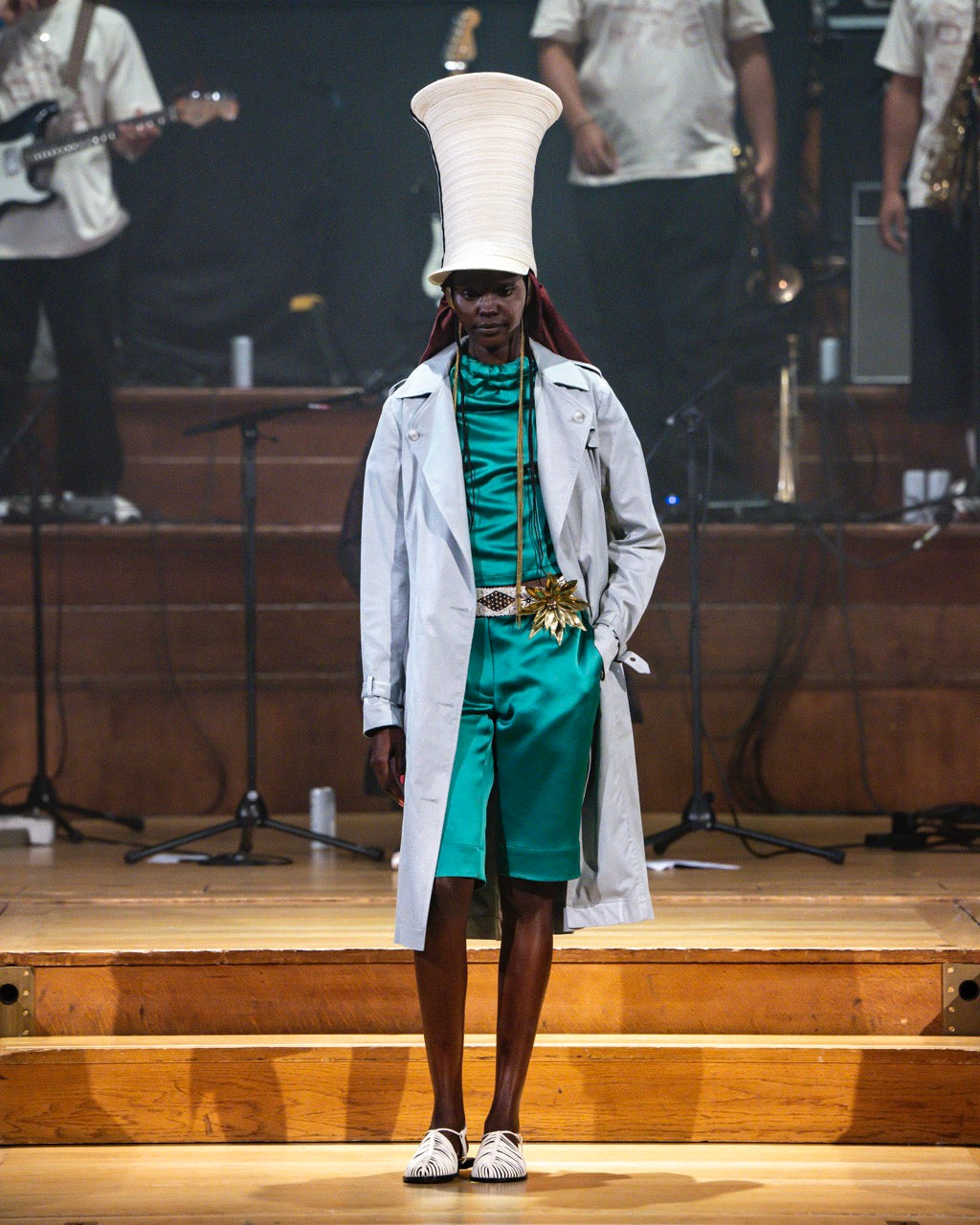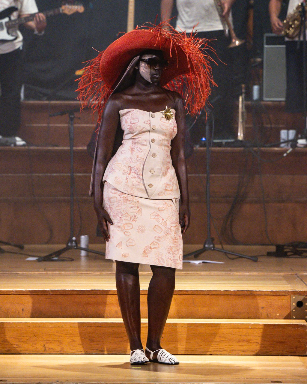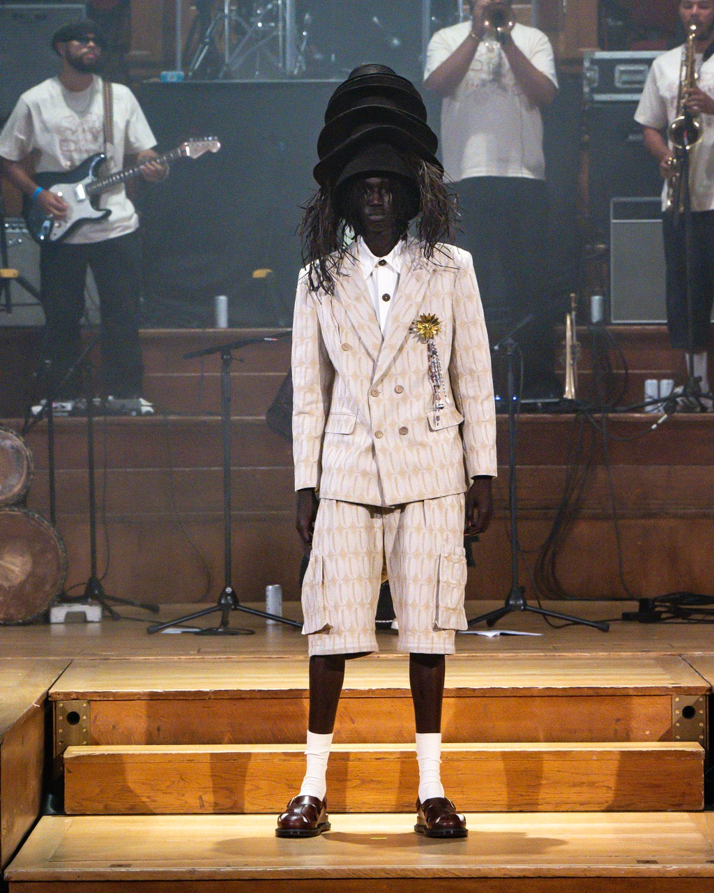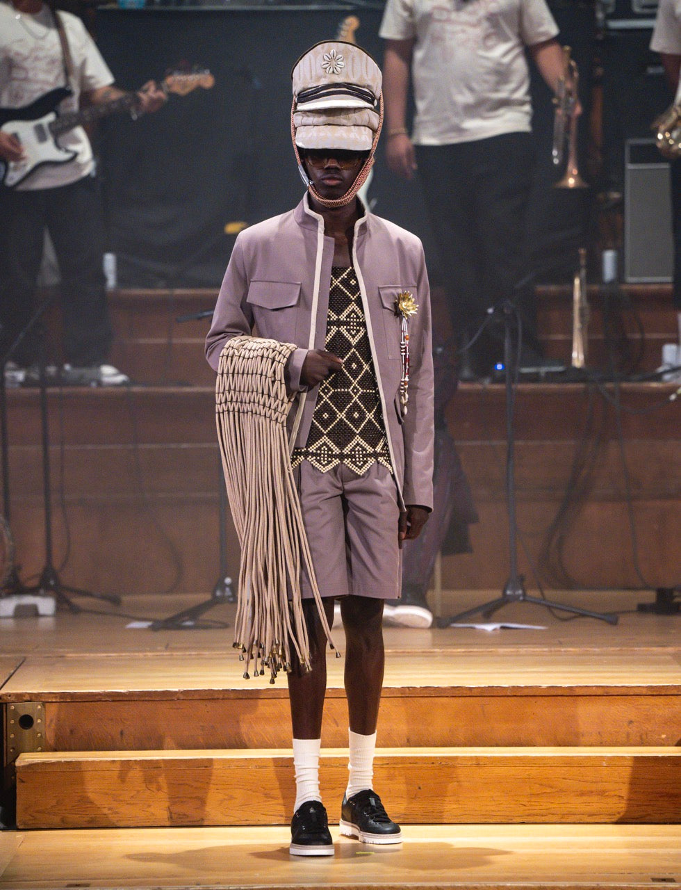 The osmosis flower is an emblem of cultures merging, blossoming into something new, where borders dissolve. Just as the cowrie shell and the stamped textiles bear witness to journeys, the flower reflects the continuous cycle of movement and transformation at the heart of osmosis. Throughout the show, headwear made from natural fibres such as hemp, wheat, paper and raffa feature. These pieces have been dyed to create rich, earthy tones, punctuated with cowrie shells. The headwear merges the military silhouettes of a marching band with traditional styles of the Ekonda Botolo, a tall ceremonial head adornment, and Isichola, a traditional Zulu headdress. These elements take the collection on a spiritual journey of origins, examining the past and present, with hope and determination for a more unified world.