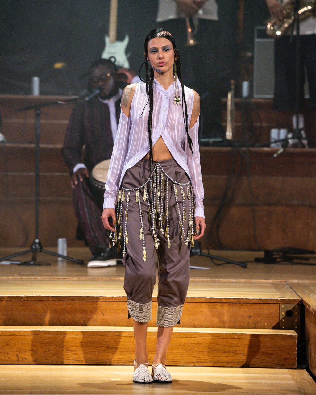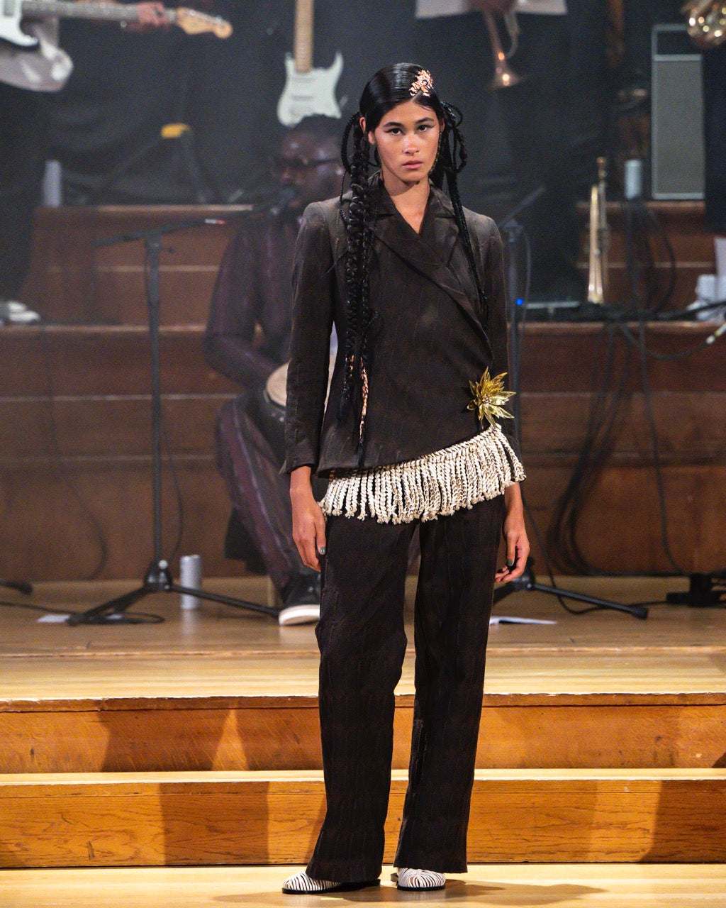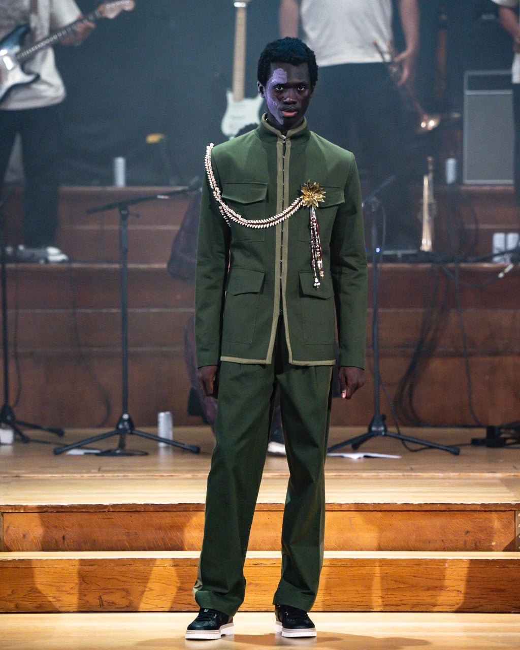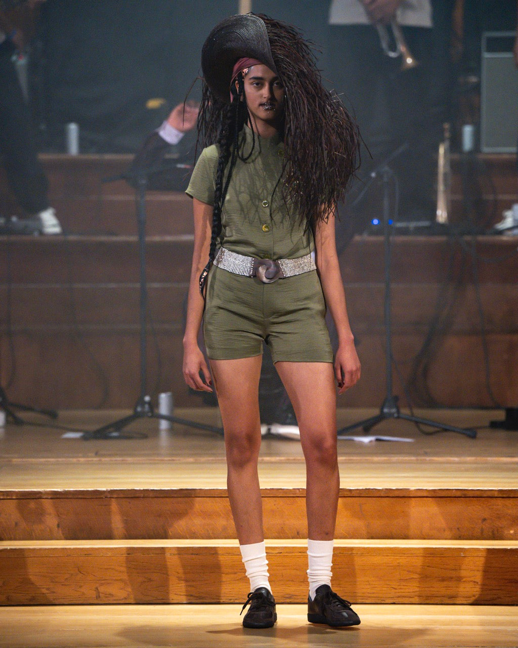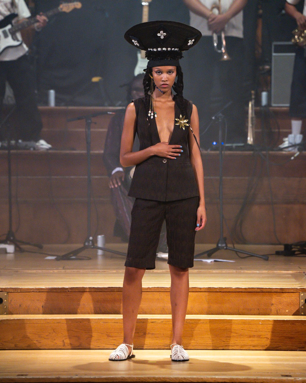 The osmosis flower is an emblem of cultures merging, blossoming into something new, where borders dissolve. Just as the cowrie shell and the stamped textiles bear witness to journeys, the flower reflects the continuous cycle of movement and transformation at the heart of osmosis. Throughout the show, headwear made from natural fibres such as hemp, wheat, paper and raffa feature. These pieces have been dyed to create rich, earthy tones, punctuated with cowrie shells. The headwear merges the military silhouettes of a marching band with traditional styles of the Ekonda Botolo, a tall ceremonial head adornment, and Isichola, a traditional Zulu headdress. These elements take the collection on a spiritual journey of origins, examining the past and present, with hope and determination for a more unified world.