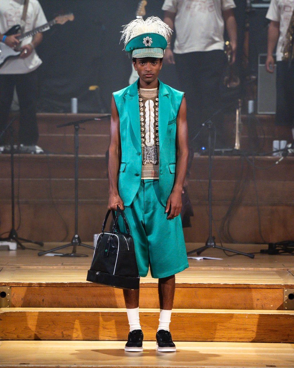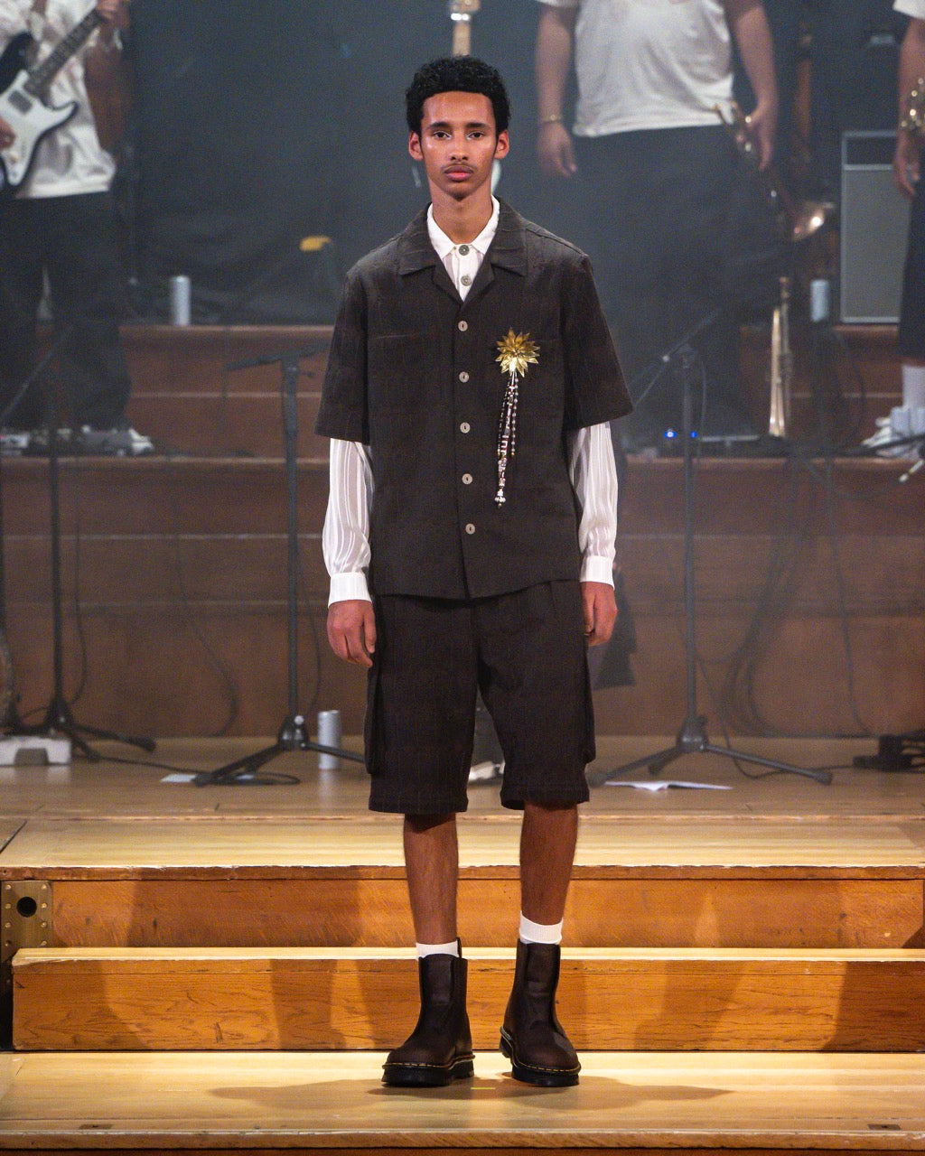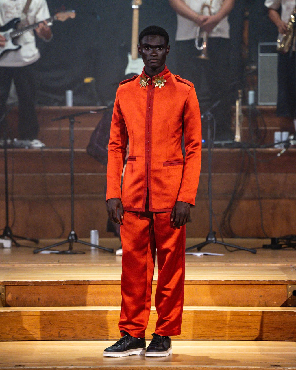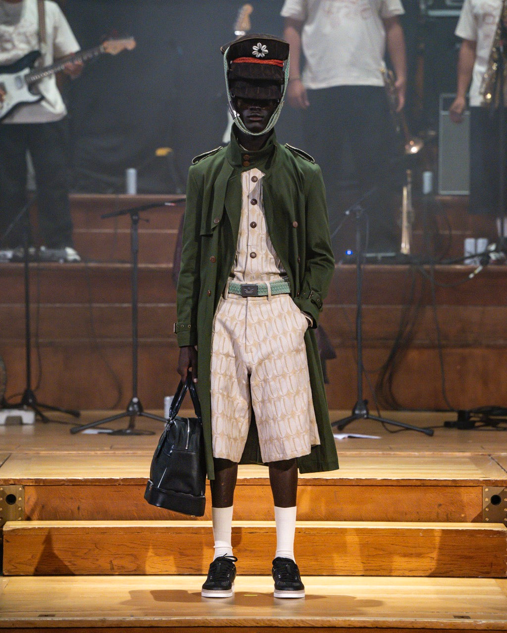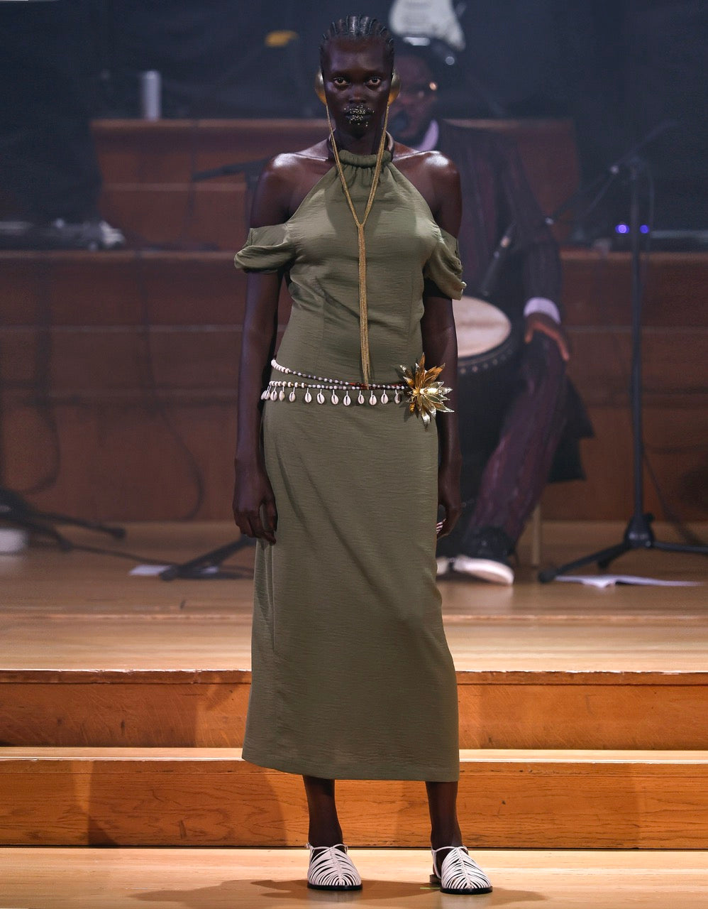 The osmosis flower is an emblem of cultures merging, blossoming into something new, where borders dissolve. Just as the cowrie shell and the stamped textiles bear witness to journeys, the flower reflects the continuous cycle of movement and transformation at the heart of osmosis. Throughout the show, headwear made from natural fibres such as hemp, wheat, paper and raffa feature. These pieces have been dyed to create rich, earthy tones, punctuated with cowrie shells. The headwear merges the military silhouettes of a marching band with traditional styles of the Ekonda Botolo, a tall ceremonial head adornment, and Isichola, a traditional Zulu headdress. These elements take the collection on a spiritual journey of origins, examining the past and present, with hope and determination for a more unified world.