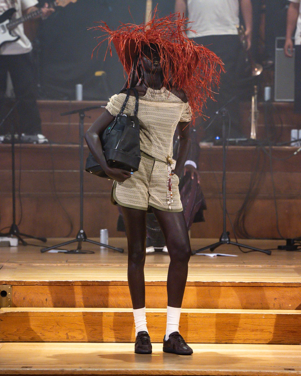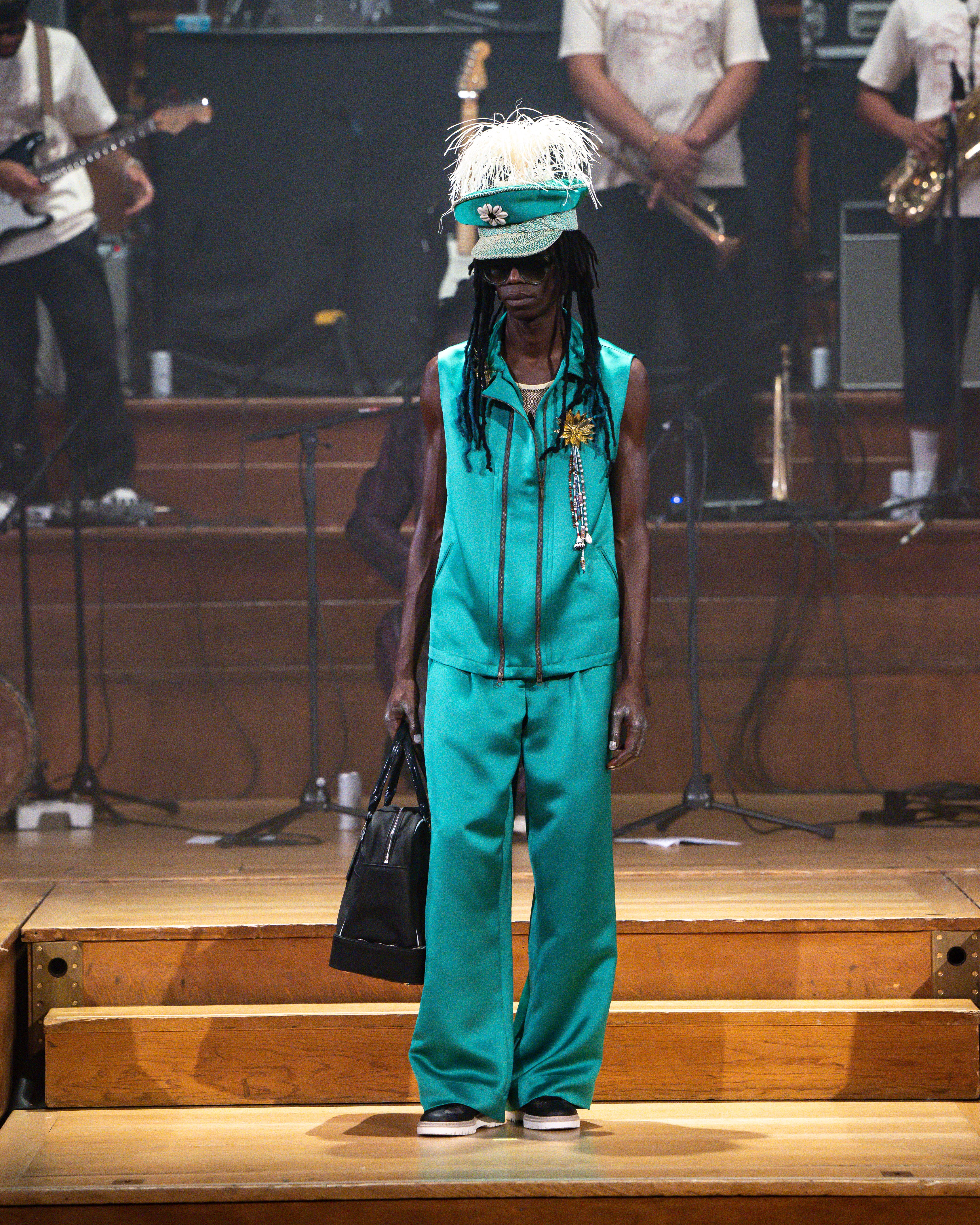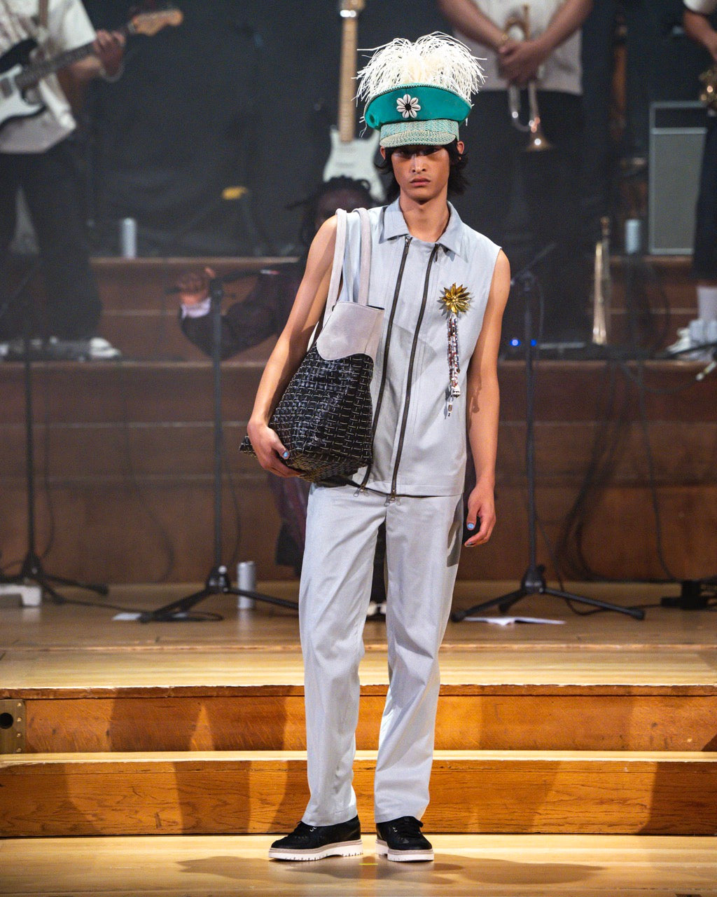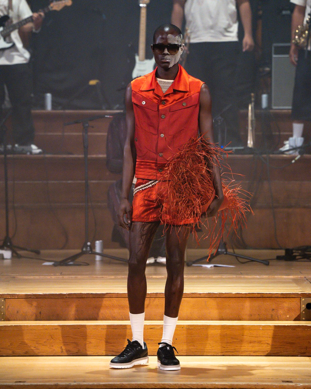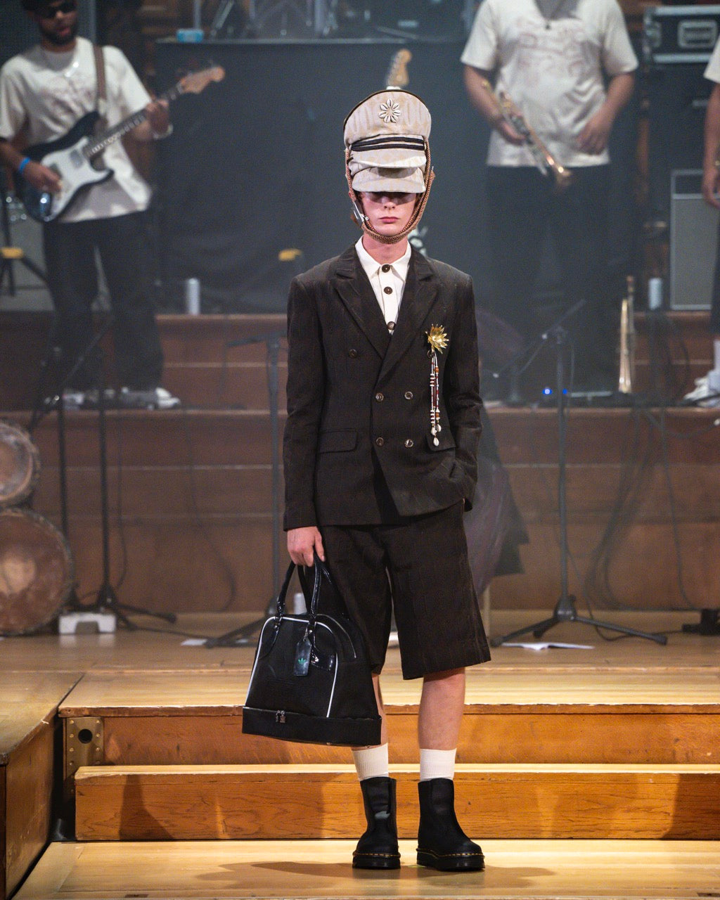 The osmosis flower is an emblem of cultures merging, blossoming into something new, where borders dissolve. Just as the cowrie shell and the stamped textiles bear witness to journeys, the flower reflects the continuous cycle of movement and transformation at the heart of osmosis. Throughout the show, headwear made from natural fibres such as hemp, wheat, paper and raffa feature. These pieces have been dyed to create rich, earthy tones, punctuated with cowrie shells. The headwear merges the military silhouettes of a marching band with traditional styles of the Ekonda Botolo, a tall ceremonial head adornment, and Isichola, a traditional Zulu headdress. These elements take the collection on a spiritual journey of origins, examining the past and present, with hope and determination for a more unified world.