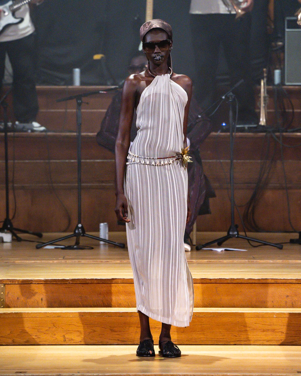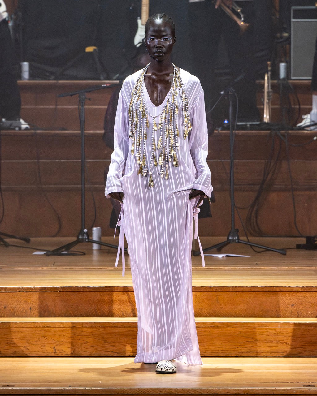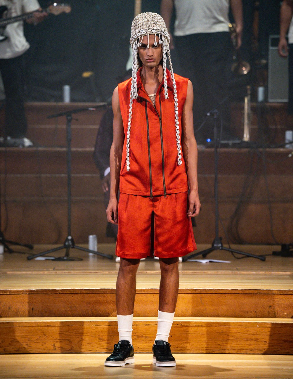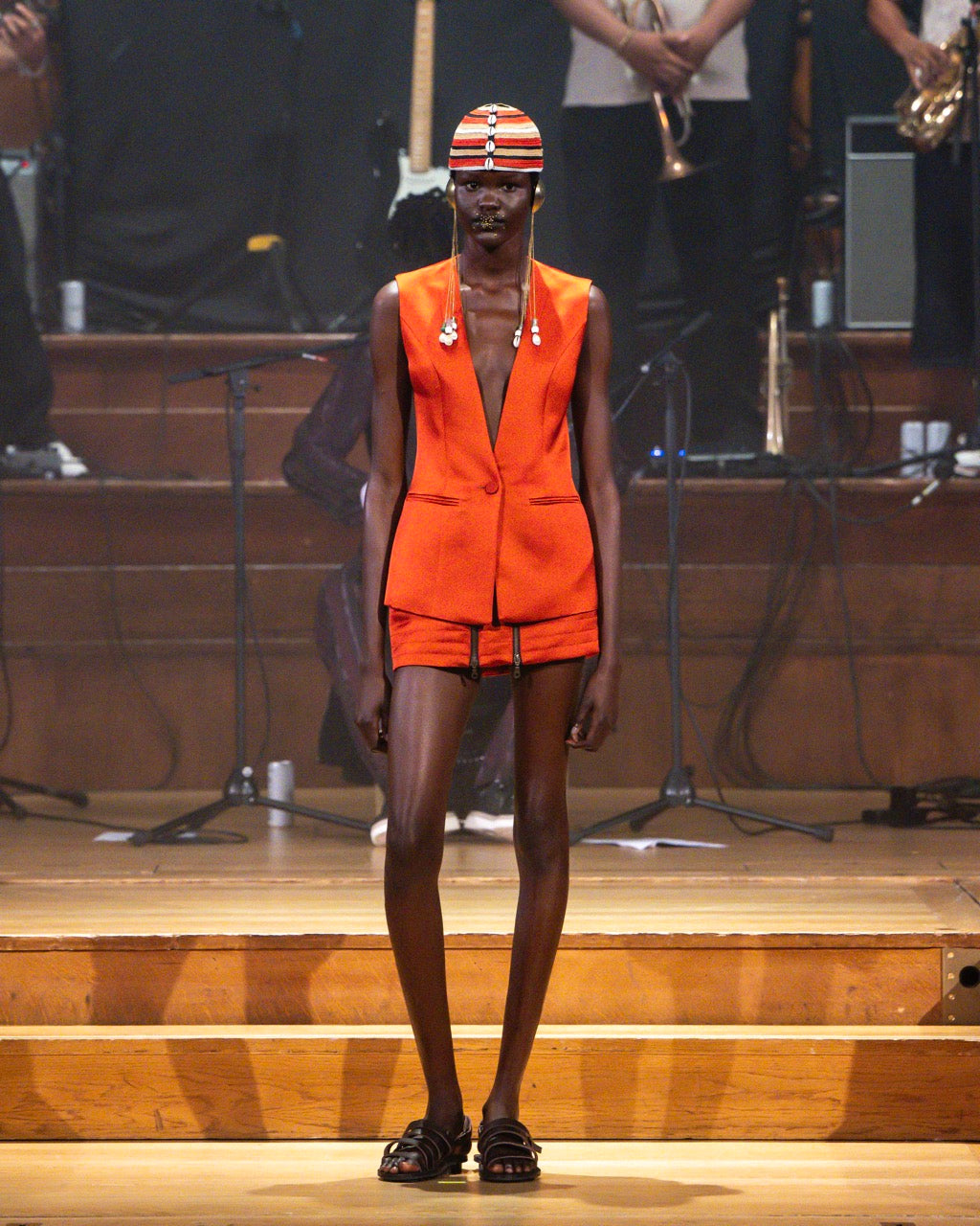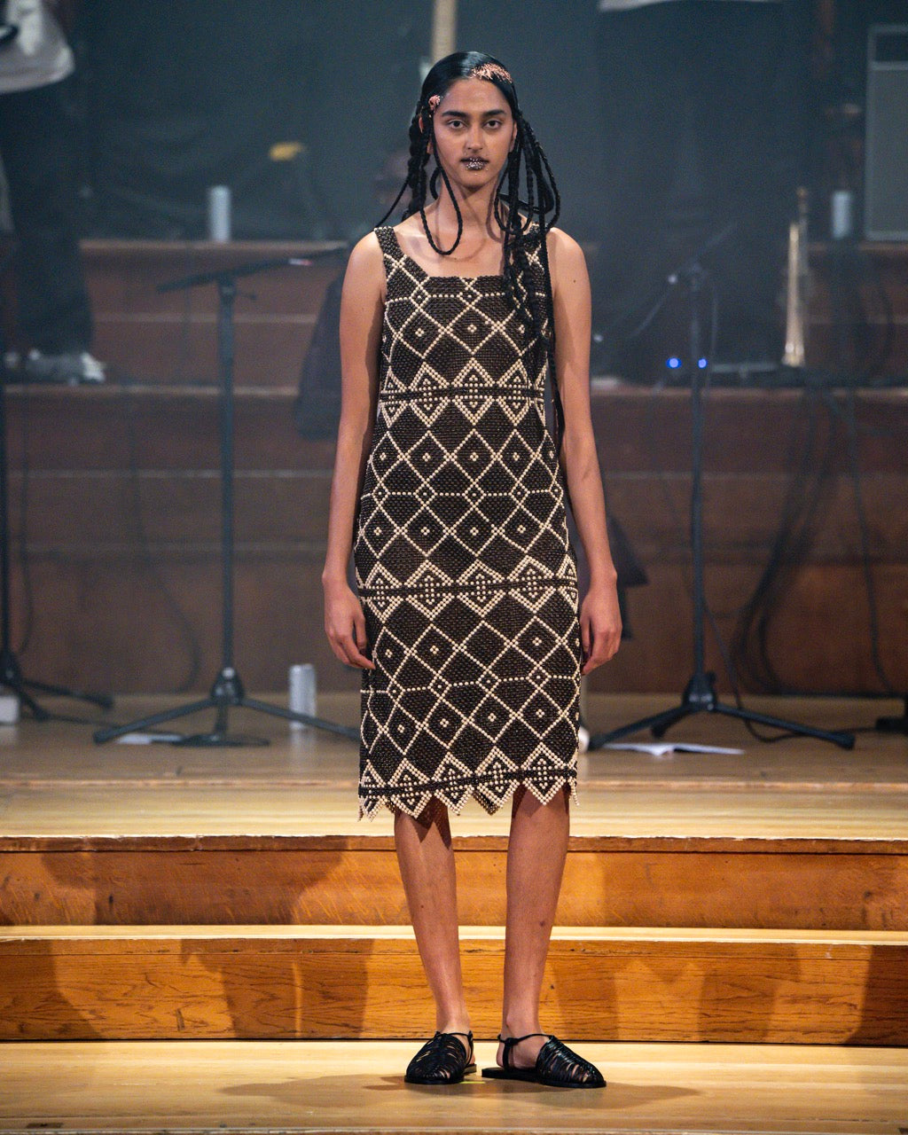 The osmosis flower is an emblem of cultures merging, blossoming into something new, where borders dissolve. Just as the cowrie shell and the stamped textiles bear witness to journeys, the flower reflects the continuous cycle of movement and transformation at the heart of osmosis. Throughout the show, headwear made from natural fibres such as hemp, wheat, paper and raffa feature. These pieces have been dyed to create rich, earthy tones, punctuated with cowrie shells. The headwear merges the military silhouettes of a marching band with traditional styles of the Ekonda Botolo, a tall ceremonial head adornment, and Isichola, a traditional Zulu headdress. These elements take the collection on a spiritual journey of origins, examining the past and present, with hope and determination for a more unified world.