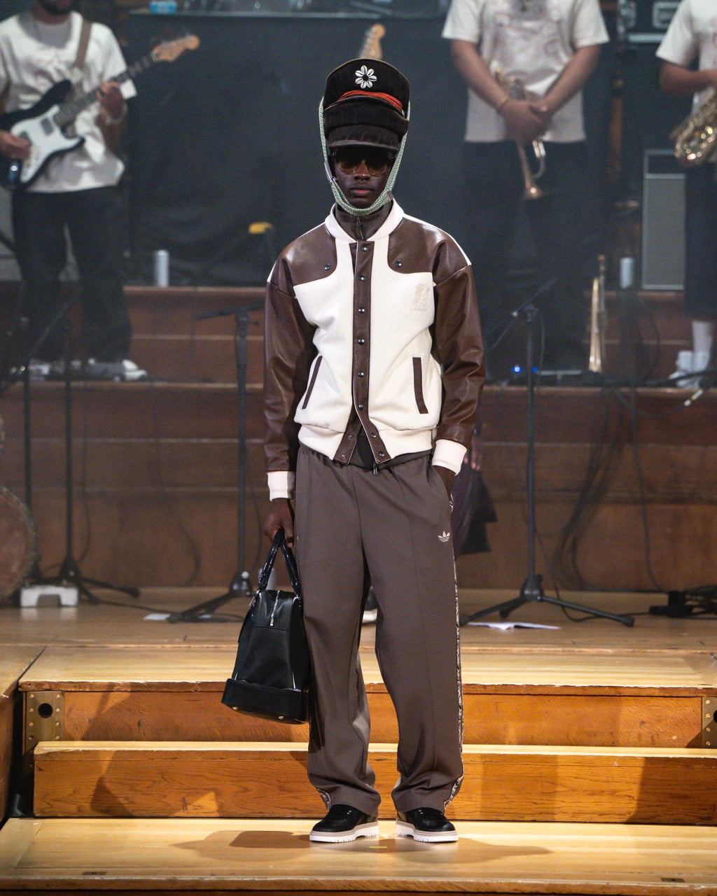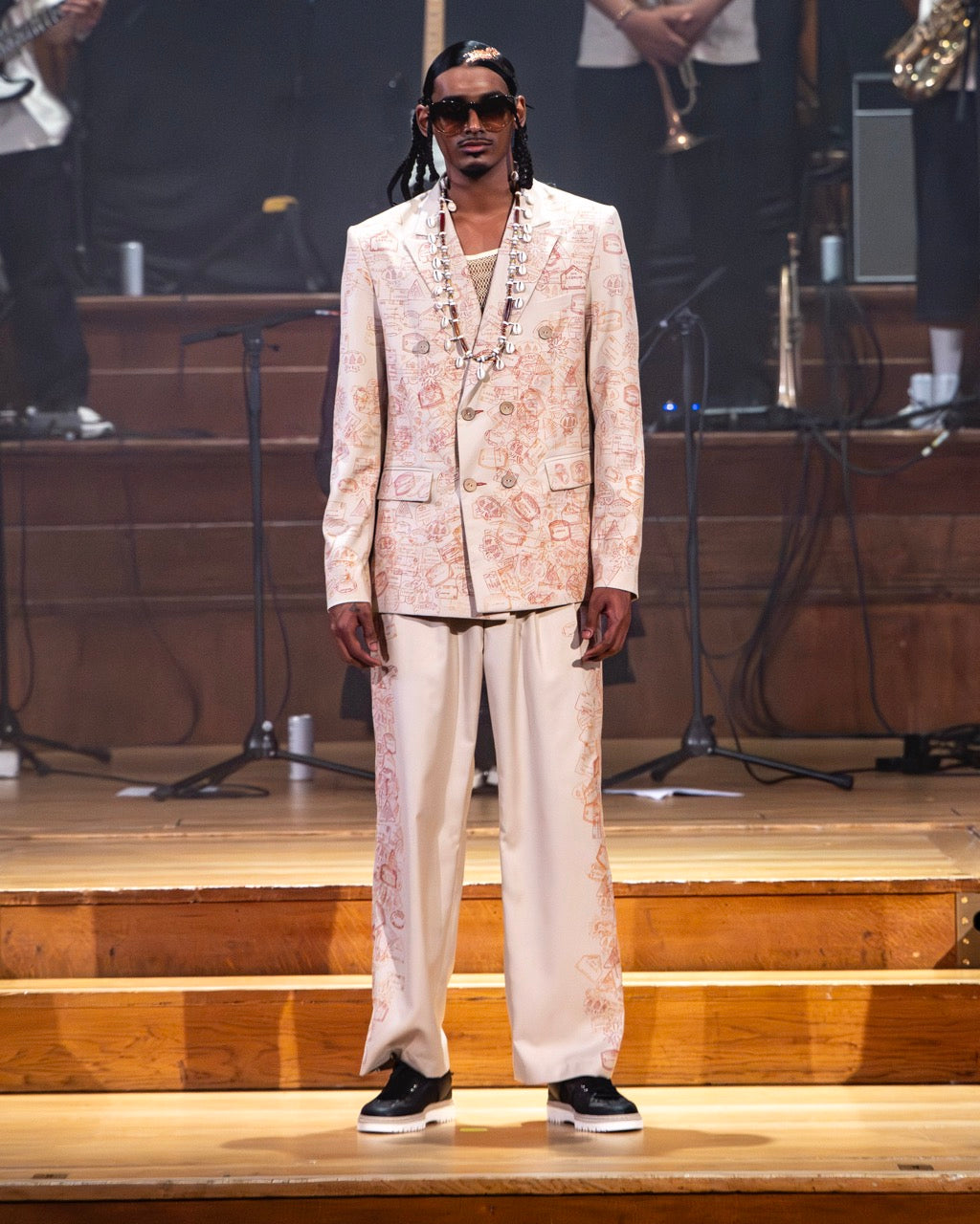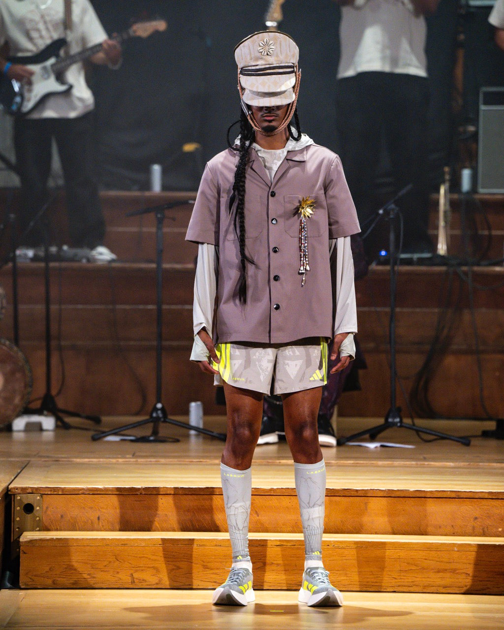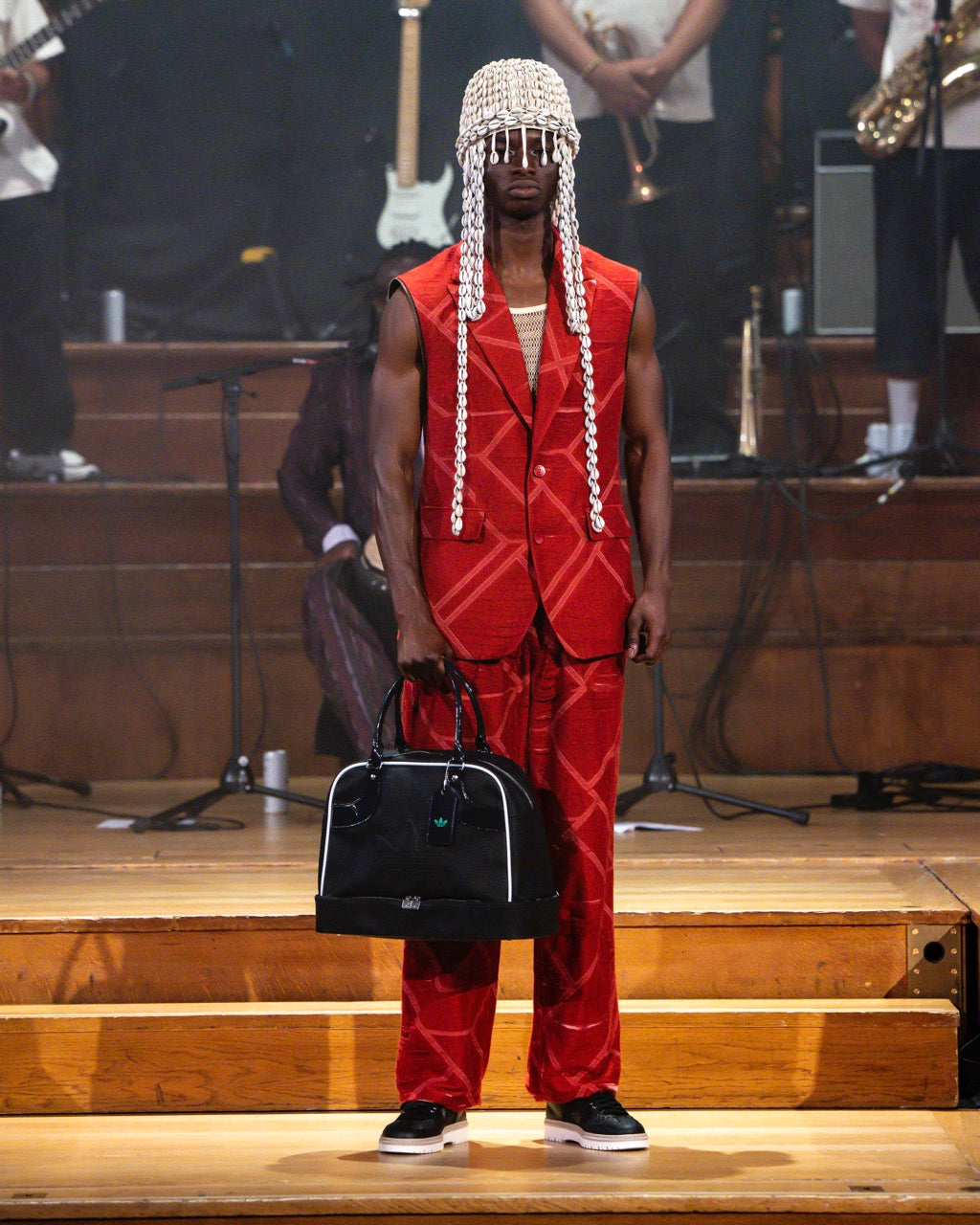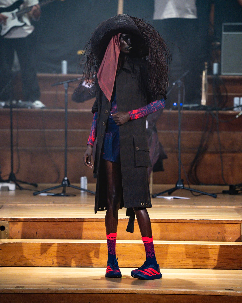 This collection is a window into the sacred consolidation between those who walked before us and the global diaspora. Inspired by West African references such as the Cowrie shell, a small porcelain shell that symbolised wealth and currency across several African nations, objects laced with cultural significance are dotted throughout the collection. The Cowrie shell is embedded into the fabric of this collection, including suits, headwear and jewellery. Inspired by African architecture and a design feature prevalent across the continent, LABRUM has created the ventilation print, a unique pattern that mimics the flow of air through concrete blocks. It appears through the collection, including the adidas x LABRUM footwear.