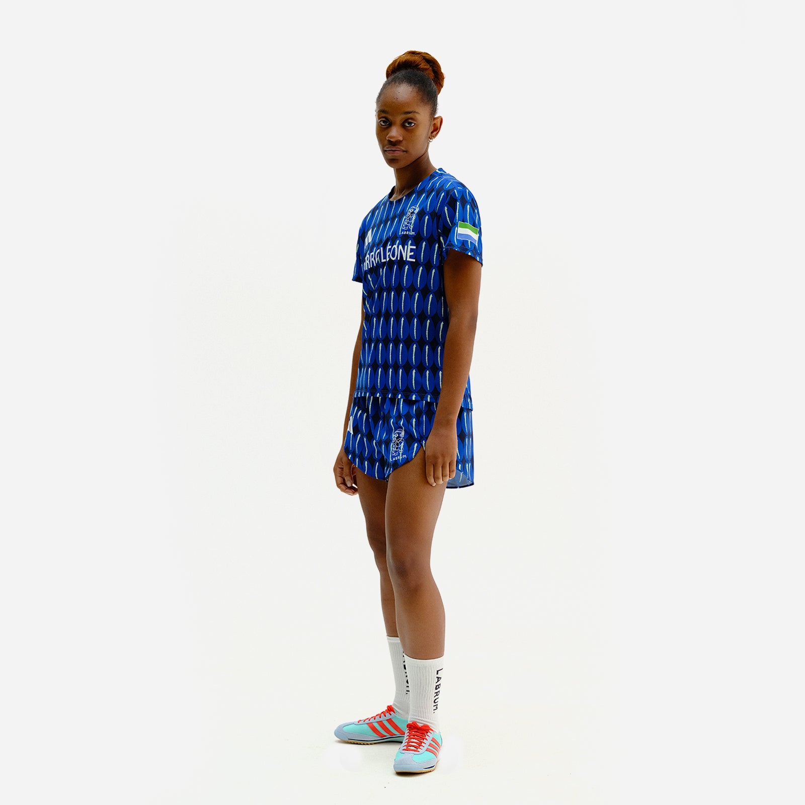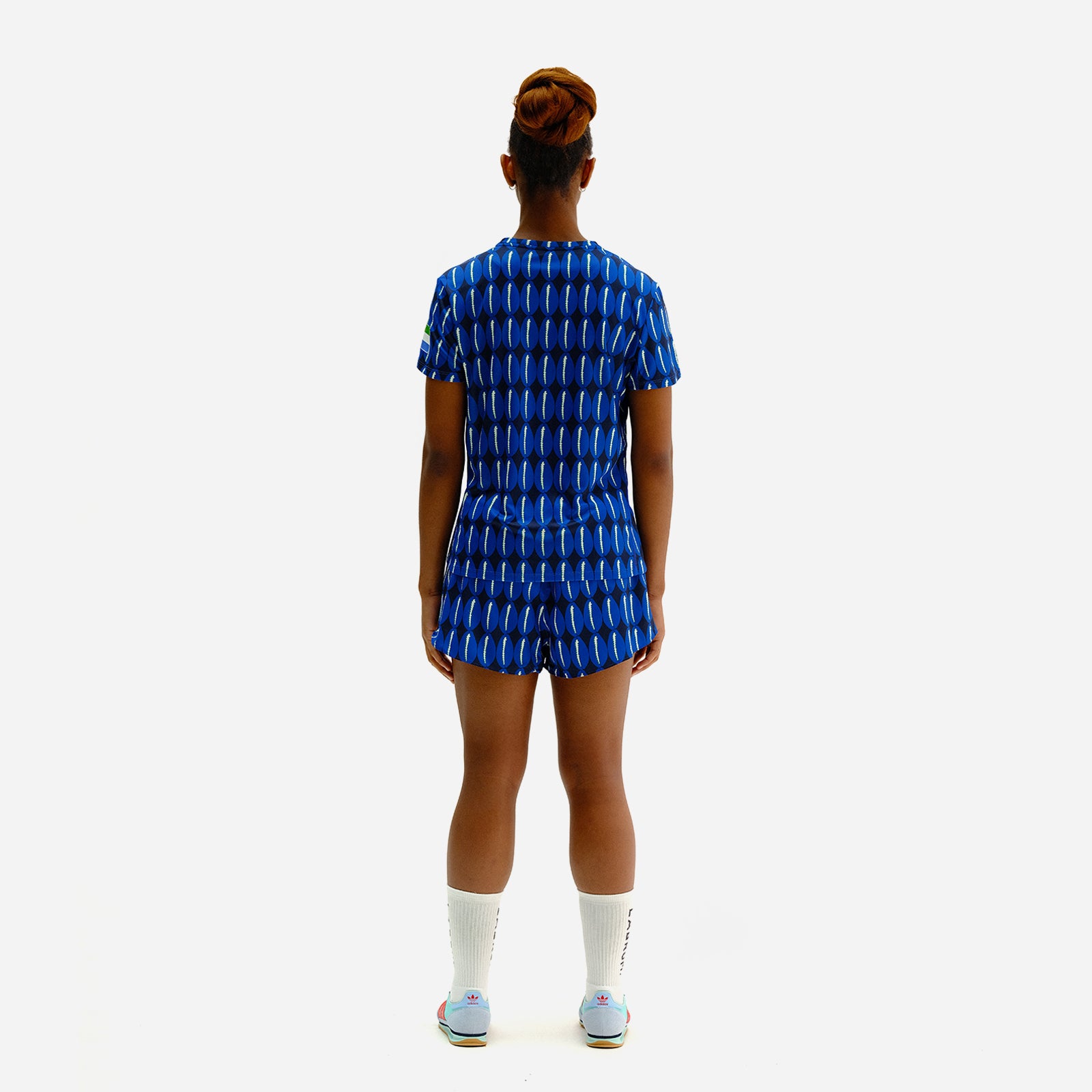 Women's LABRUM x adidas Team Sierra Leone printed t-shirt in blue. Featuring the signature LABRUM monogram cowrie shell print. Crew neck. Team SL heat-applied logo at centre. LABRUM Nomoli and adidas logo at chest. Sierra Leone flag artwork at sleeve. Lightweight.