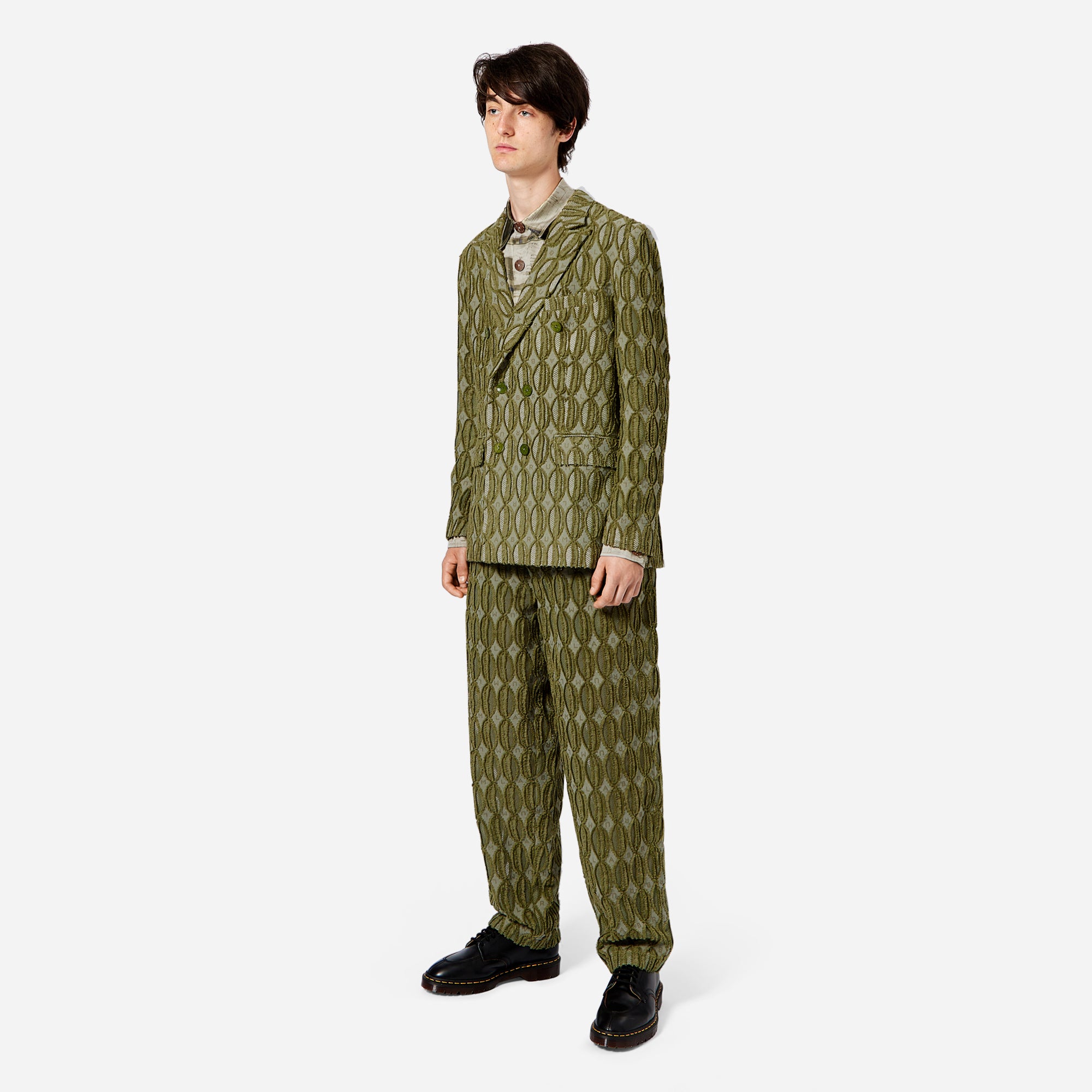 LABRUM monogram long-sleeve double breasted blazer in sage frayed jacquard fabric. Peak lapel collar. Double-breasted button closure at front. Coconut shell buttons. Welt pocket at chest. Welt pocket at interior. Jet pockets at front. Vents at back hem. Fully lined.